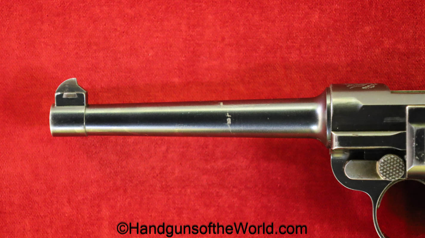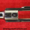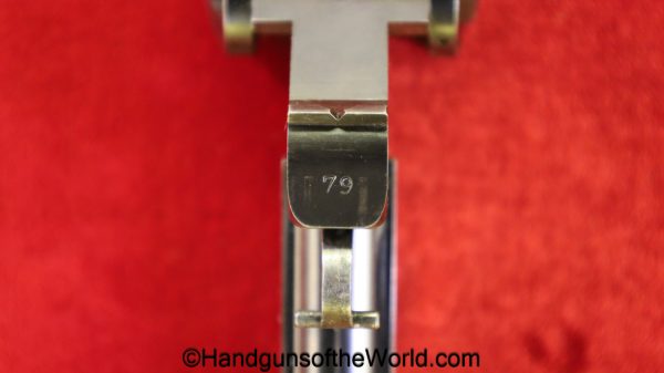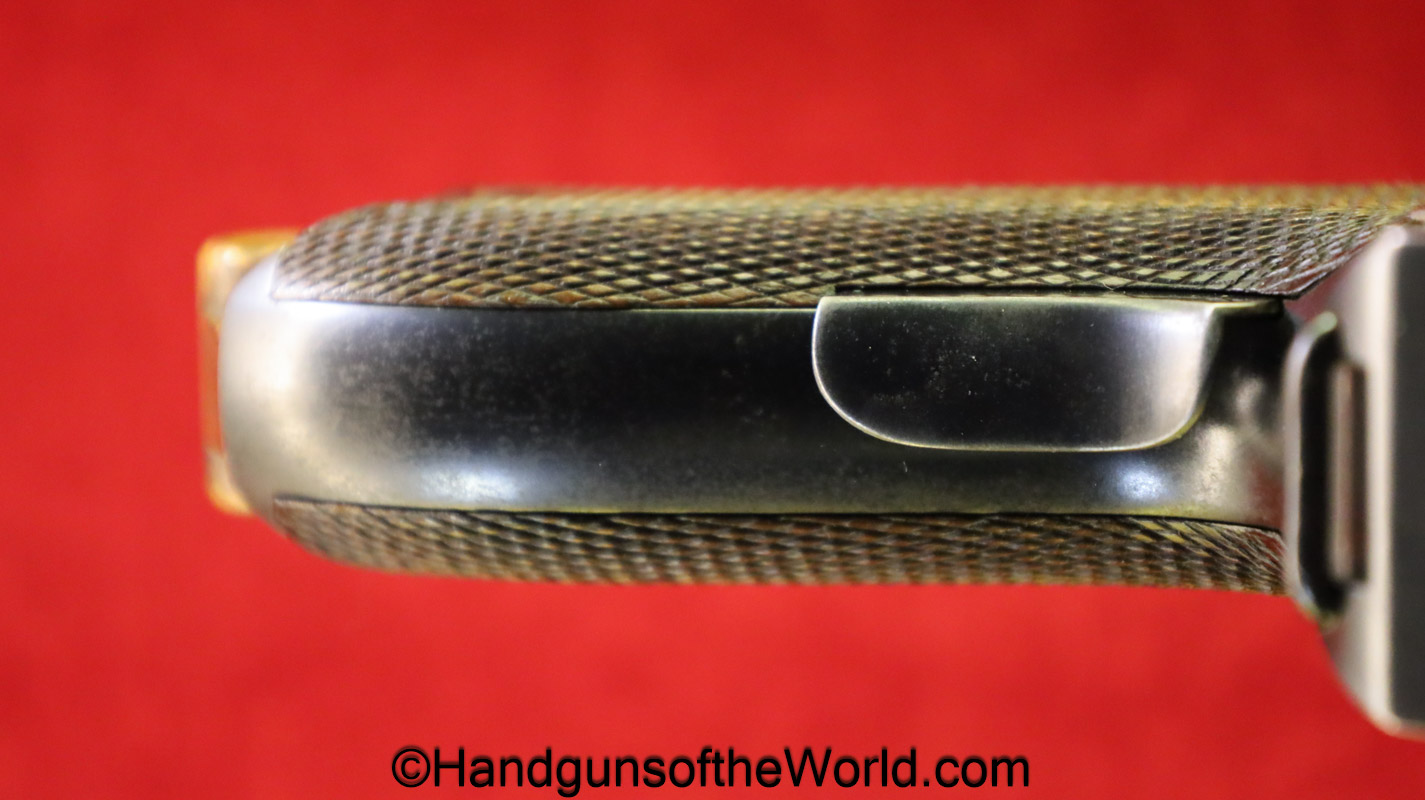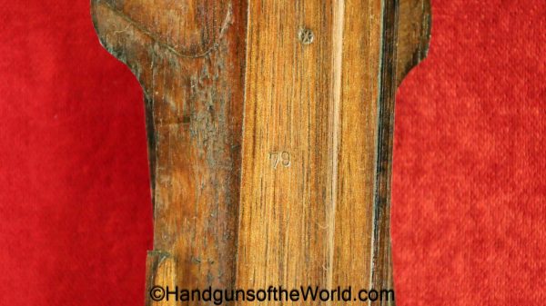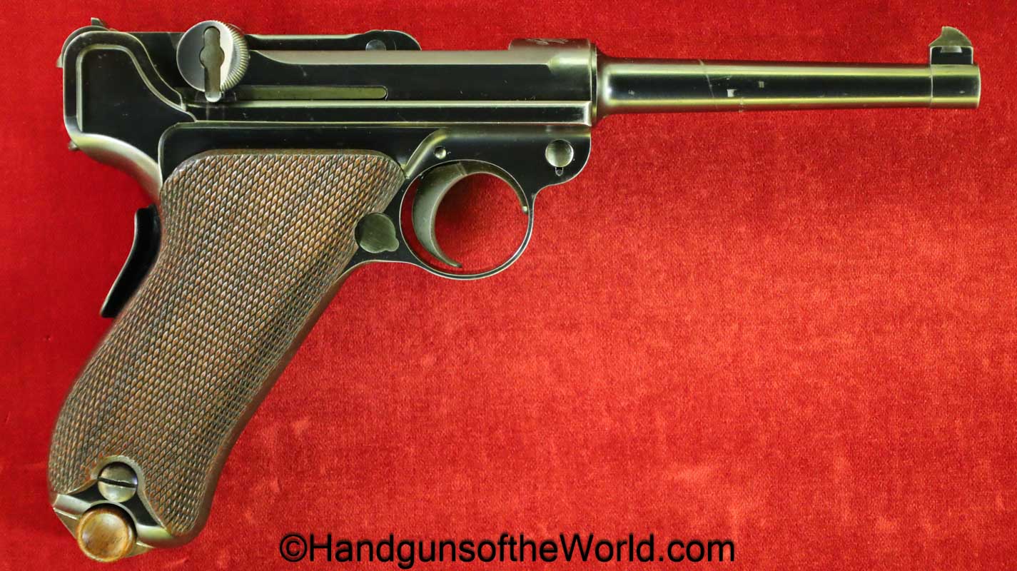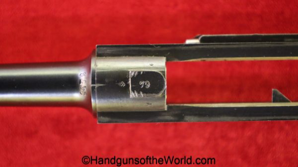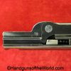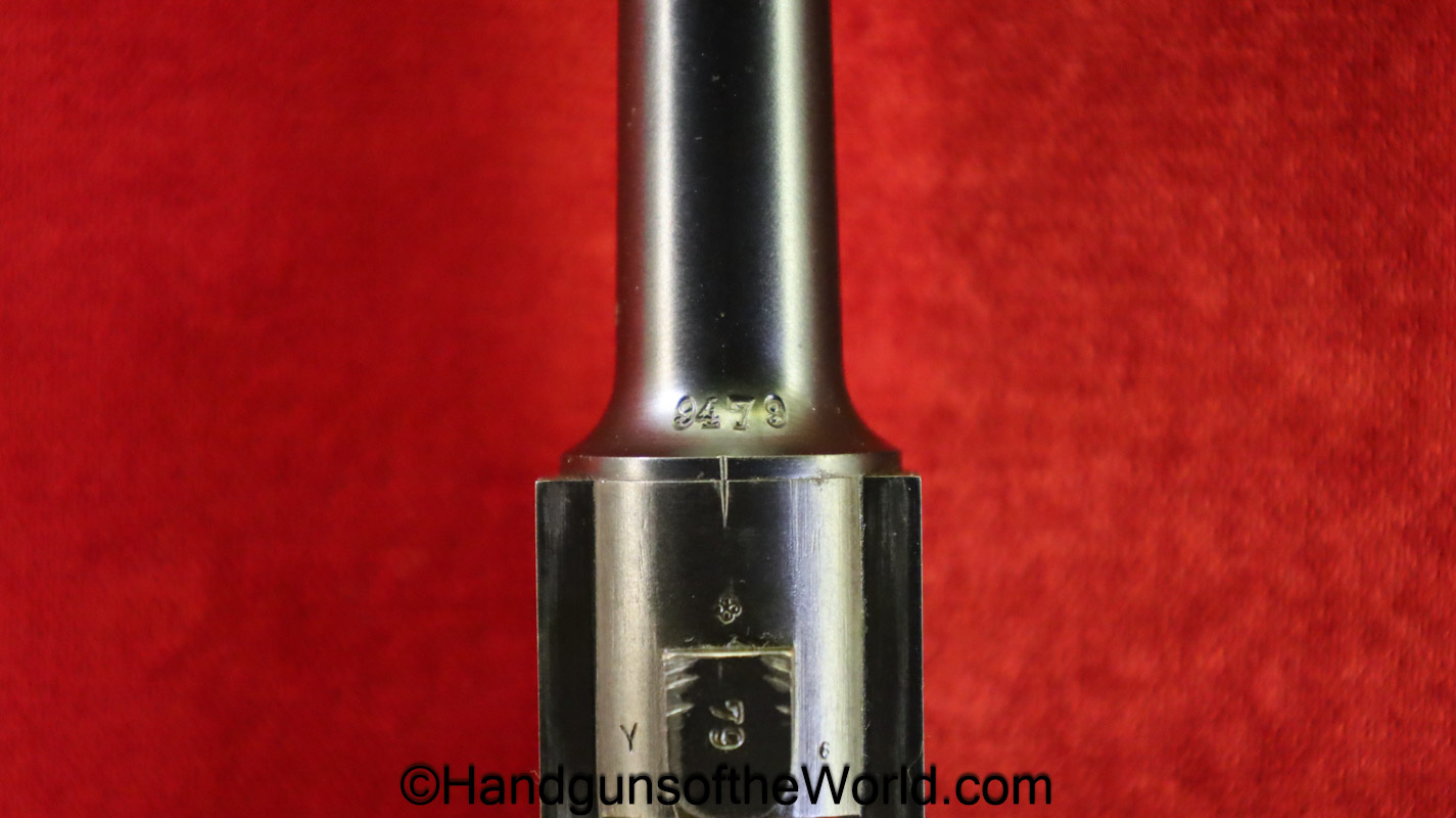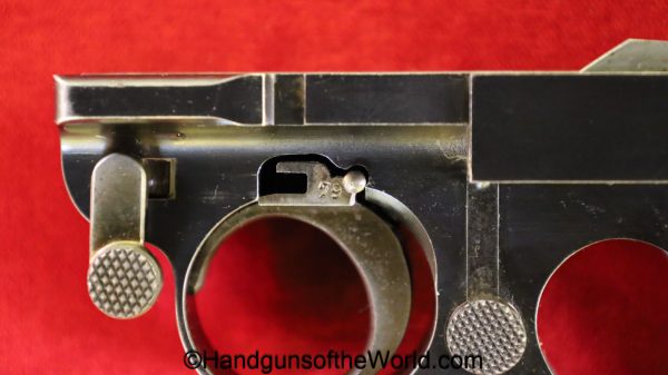 DWM 1900 America Eagle, 7.65mm Parabellum. This has the checkered walnut grips, and is Not German BUG proofed, but is marked Germany on the forward frame. This has all matching numbers, and No importer markings. The wooden base magazine is marked Germany on the bottom. The blue rates about 98% and the bore is Fair.