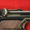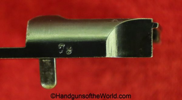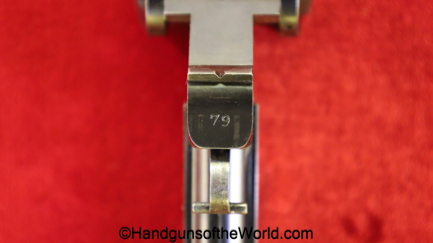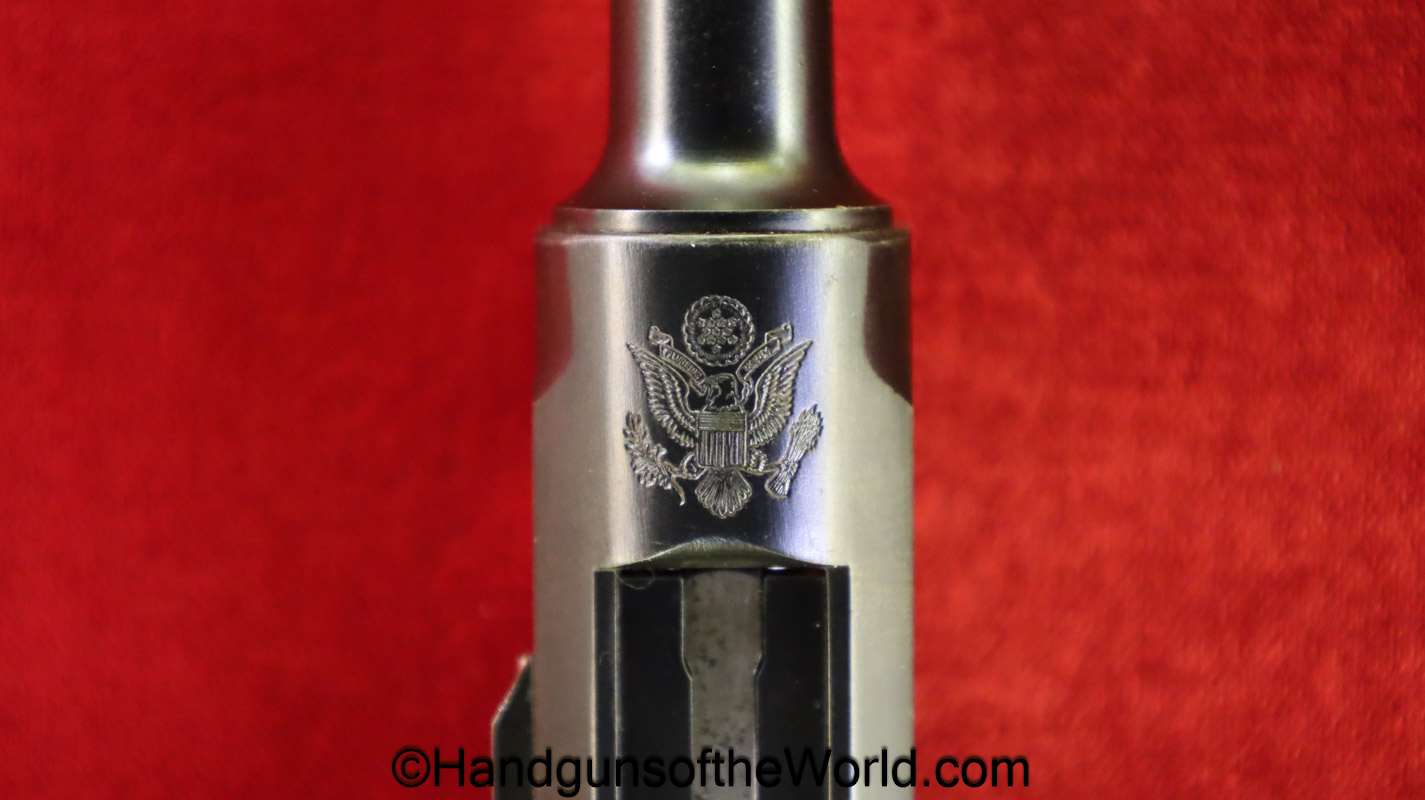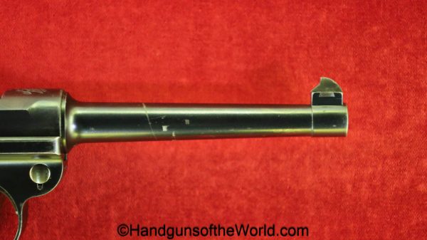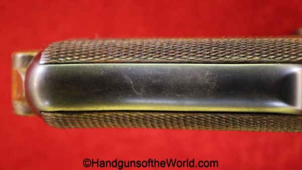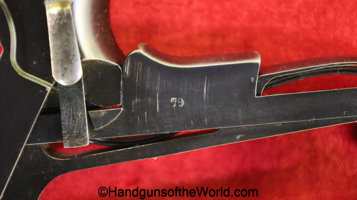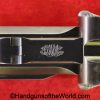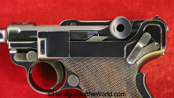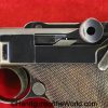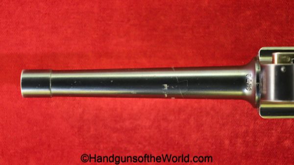 DWM 1900 America Eagle, 7.65mm Parabellum. This has the checkered walnut grips, and is Not German BUG proofed, but is marked Germany on the forward frame. This has all matching numbers, and No importer markings. The wooden base magazine is marked Germany on the bottom. The blue rates about 98% and the bore is Fair.