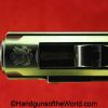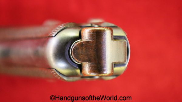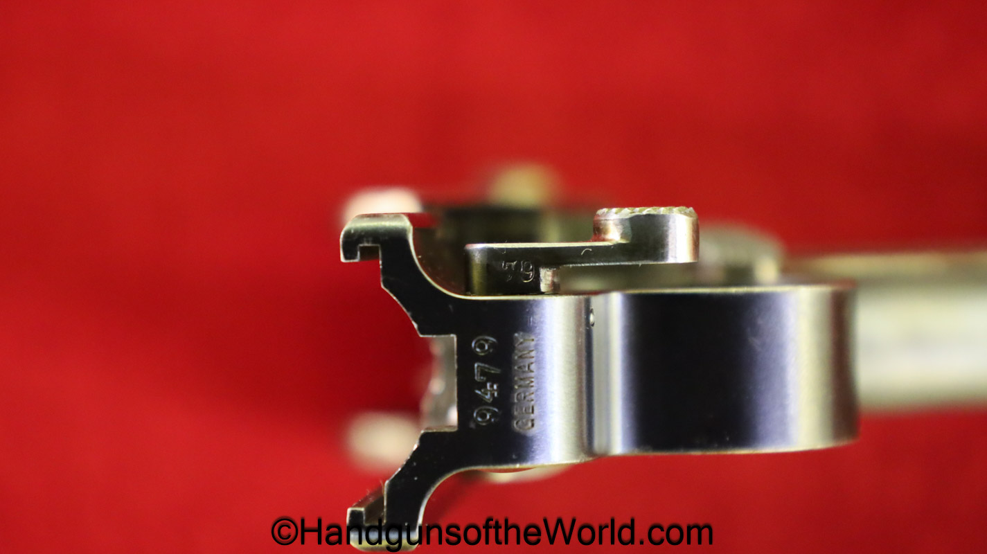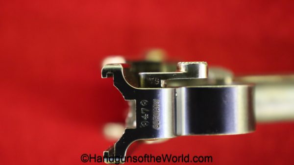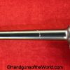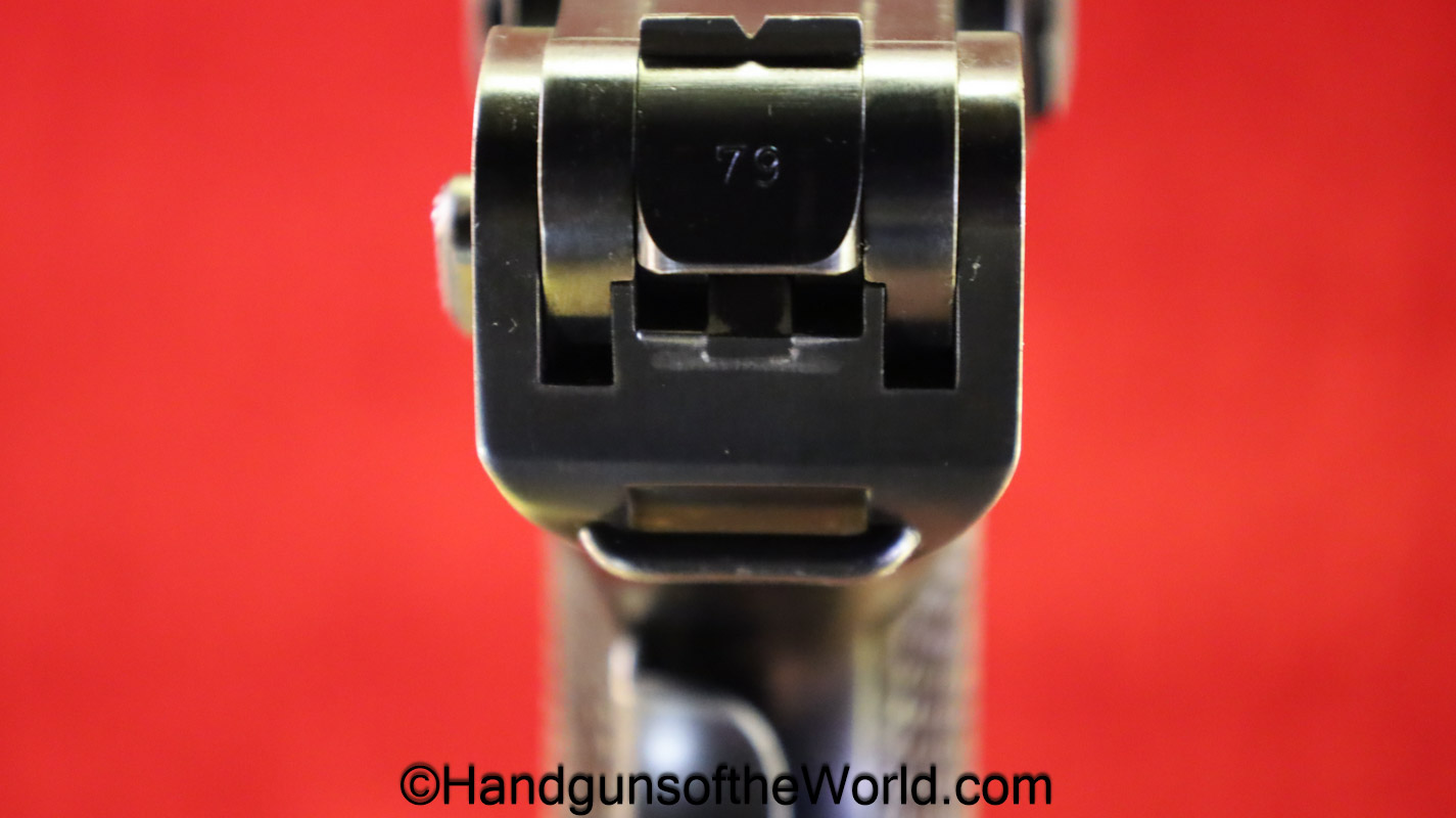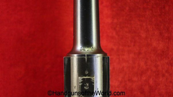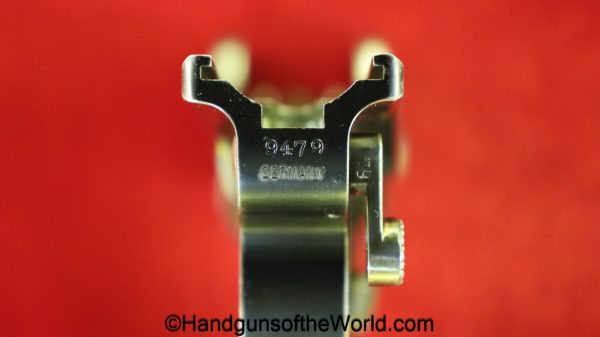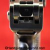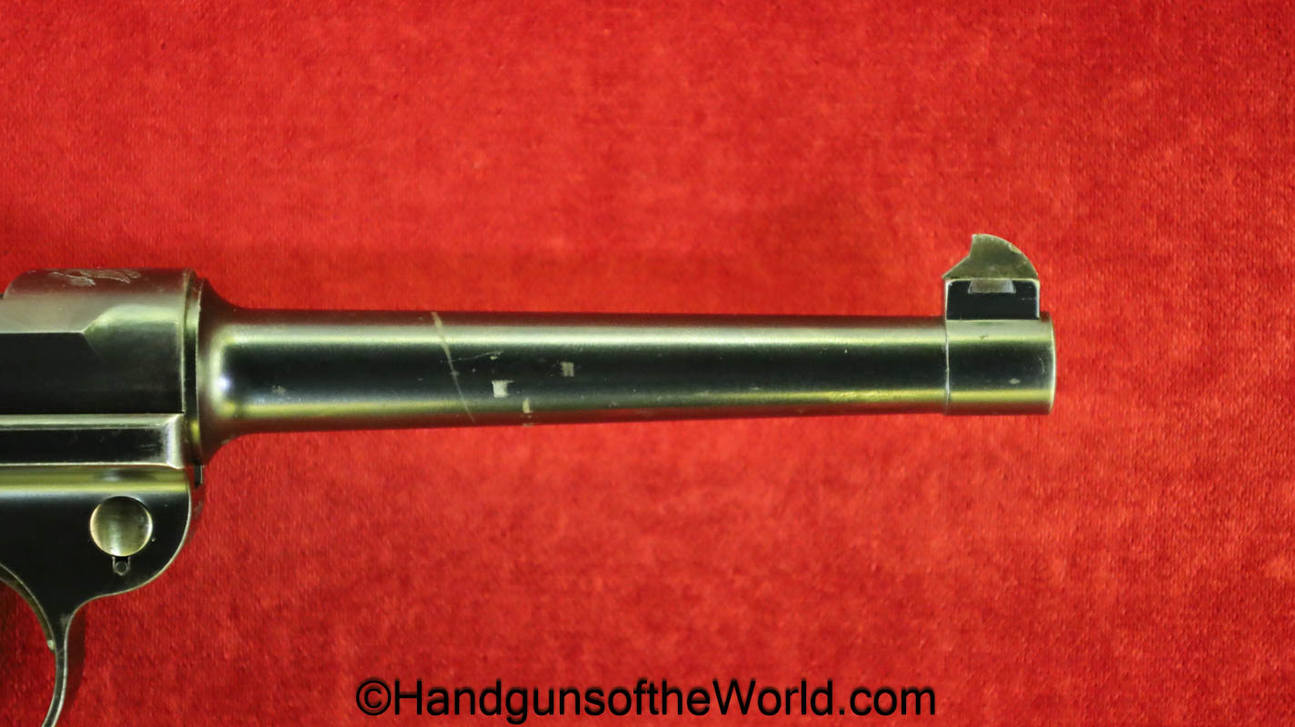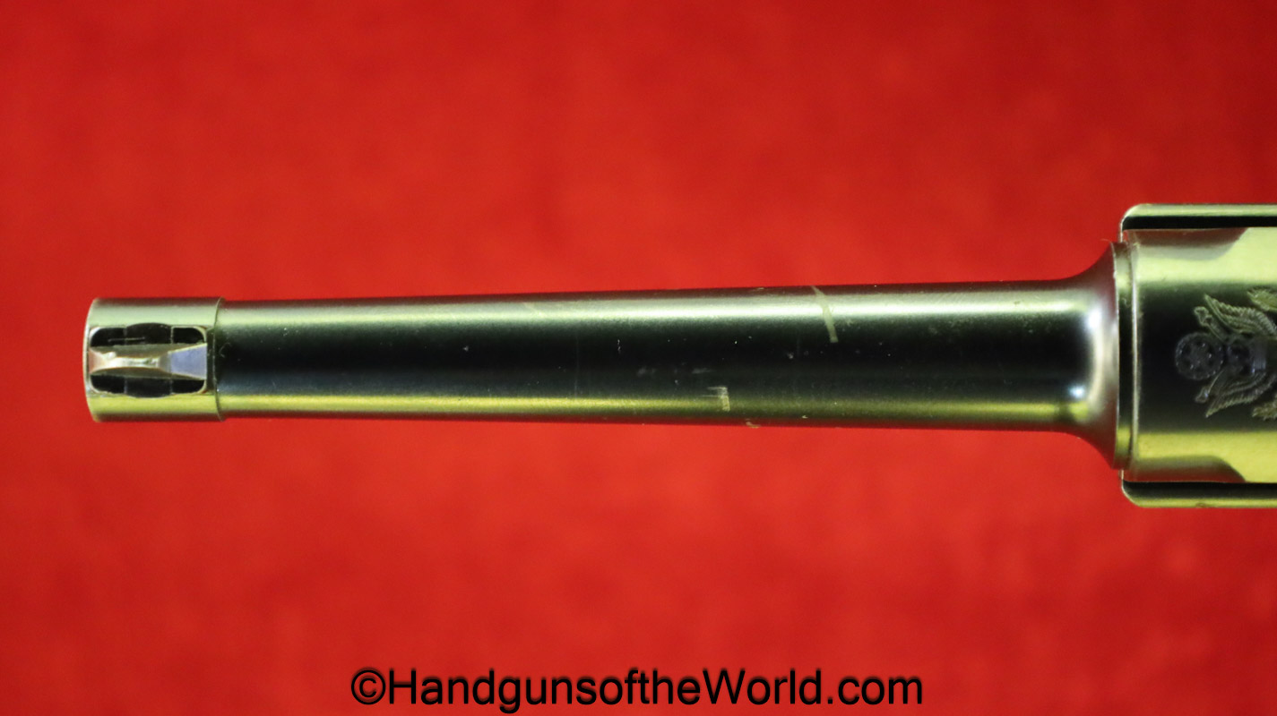 DWM 1900 America Eagle, 7.65mm Parabellum. This has the checkered walnut grips, and is Not German BUG proofed, but is marked Germany on the forward frame. This has all matching numbers, and No importer markings. The wooden base magazine is marked Germany on the bottom. The blue rates about 98% and the bore is Fair.