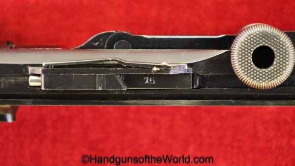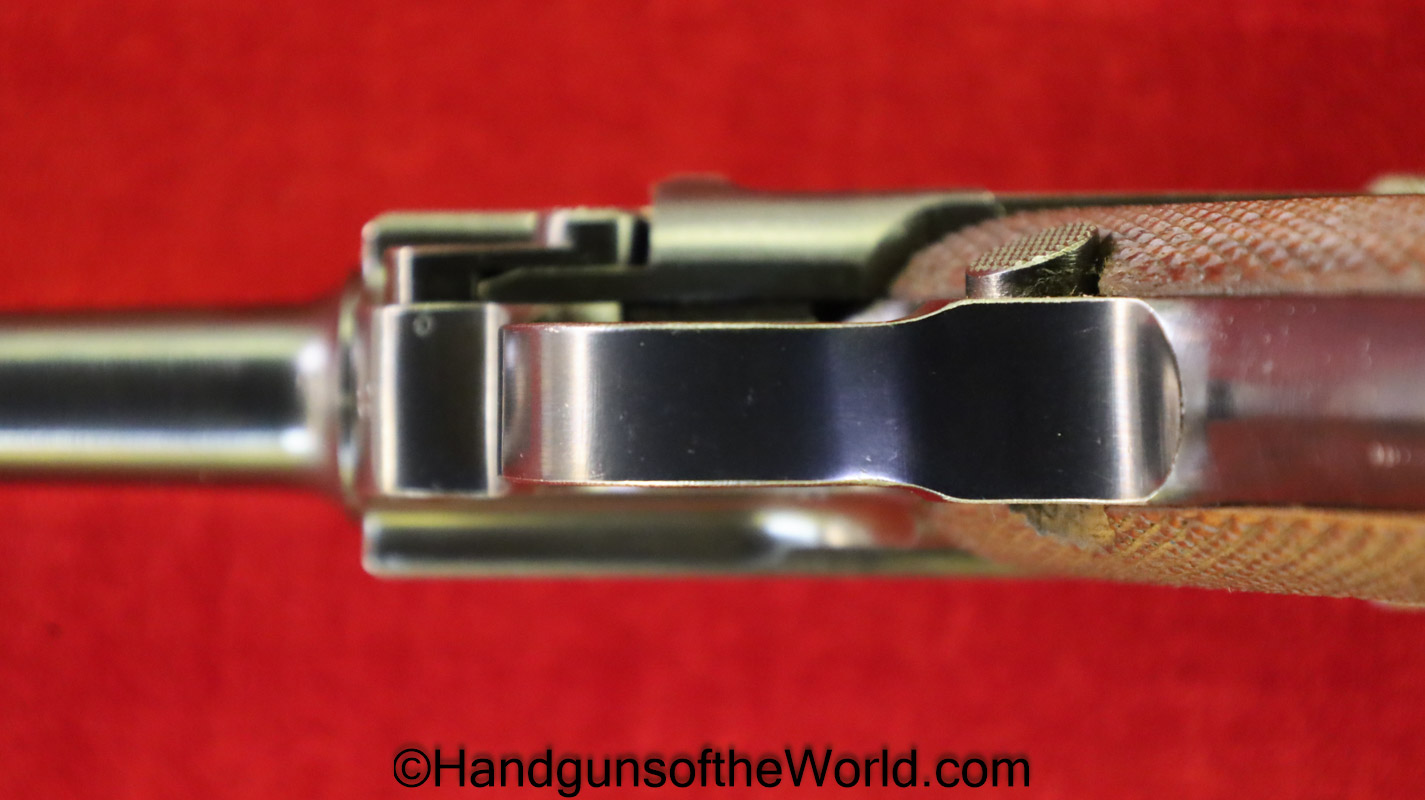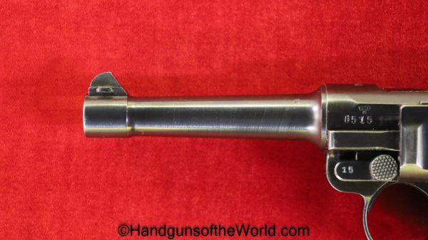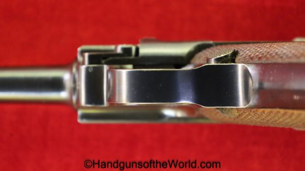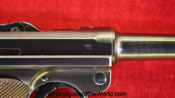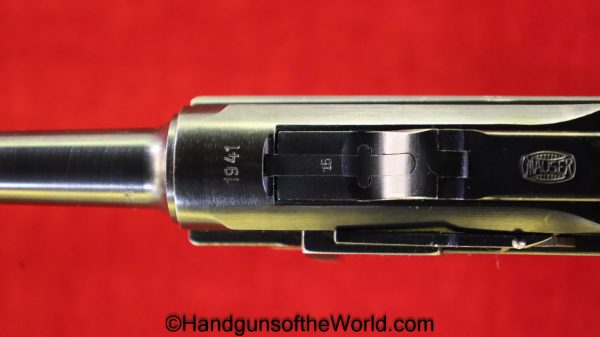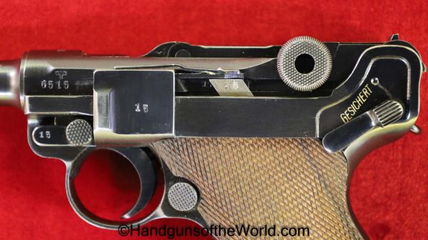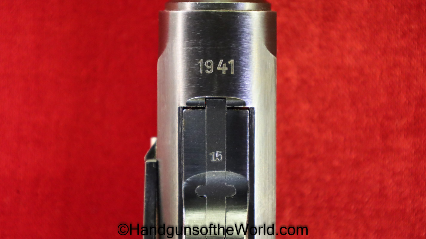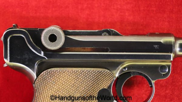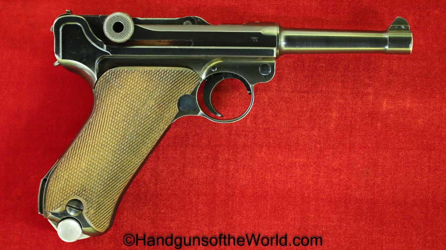 Mauser P.08 Luger, Mauser Banner 1941 with German Eagle N proofs, and Police eagle L proof on the right receiver. This has the Police sear safety, and checkered walnut grips. This has all matching numbers to include the magazine. The blue rates about 98% and the bore is excellent.