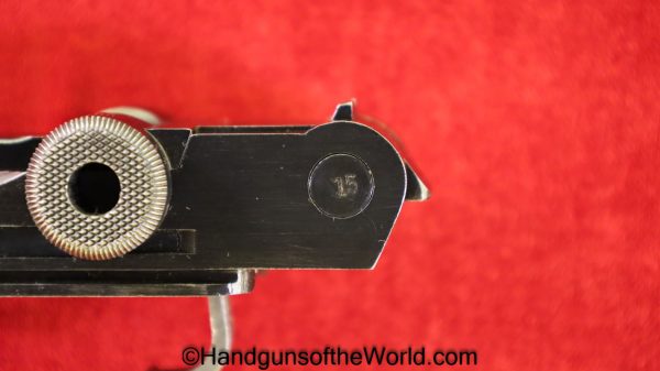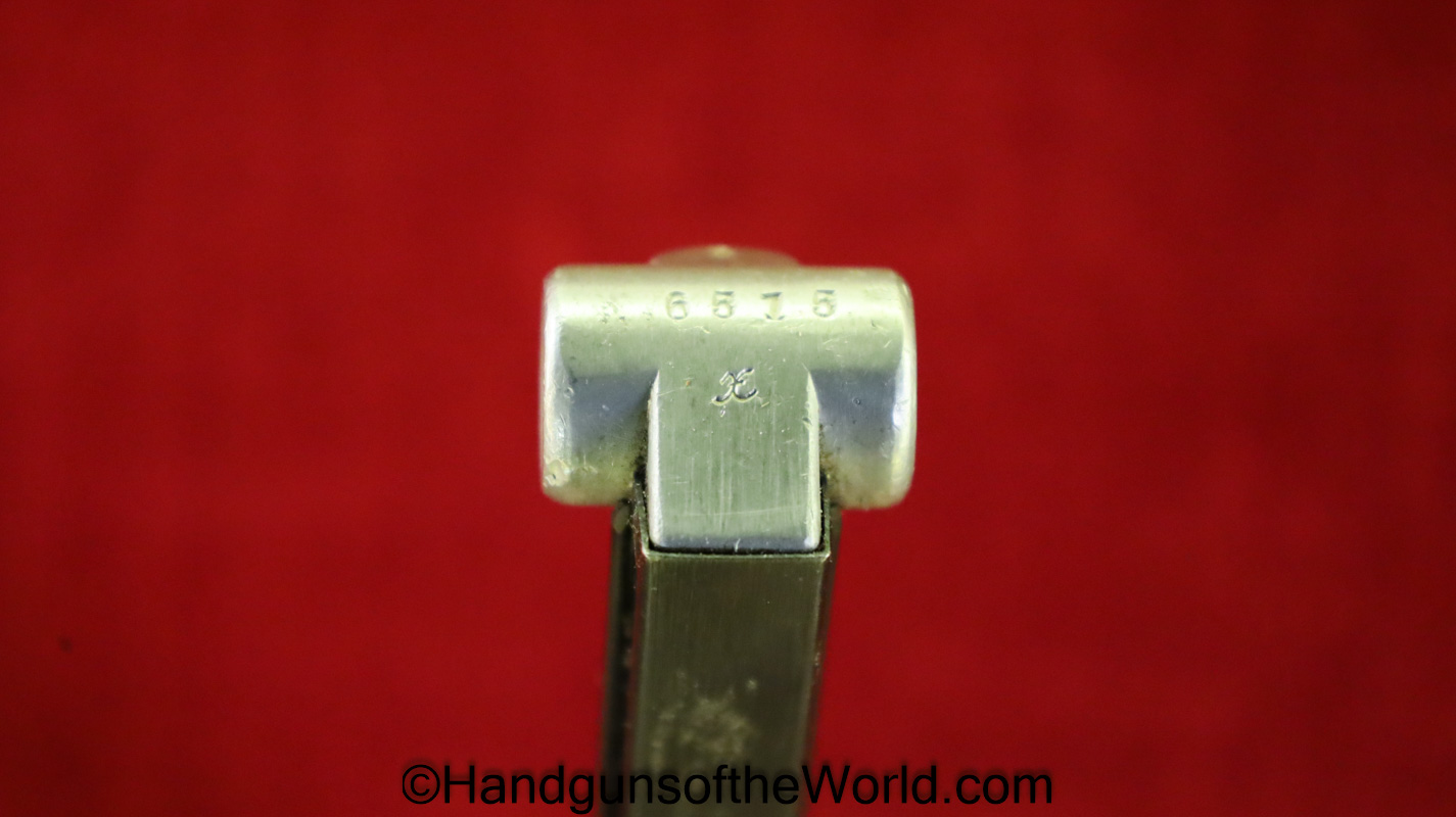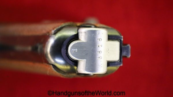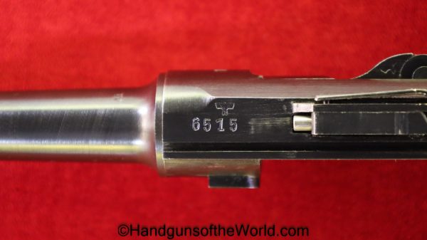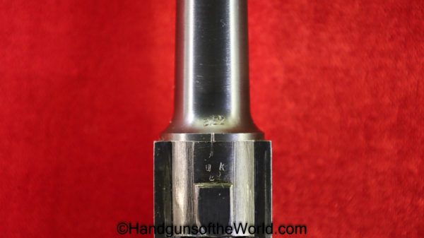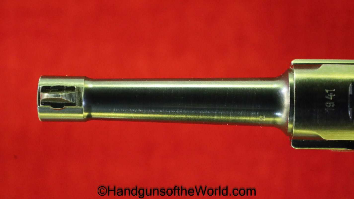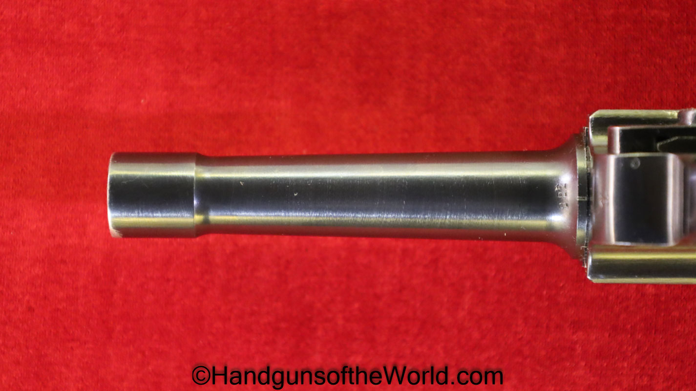 Mauser P.08 Luger, Mauser Banner 1941 with German Eagle N proofs, and Police eagle L proof on the right receiver. This has the Police sear safety, and checkered walnut grips. This has all matching numbers to include the magazine. The blue rates about 98% and the bore is excellent.