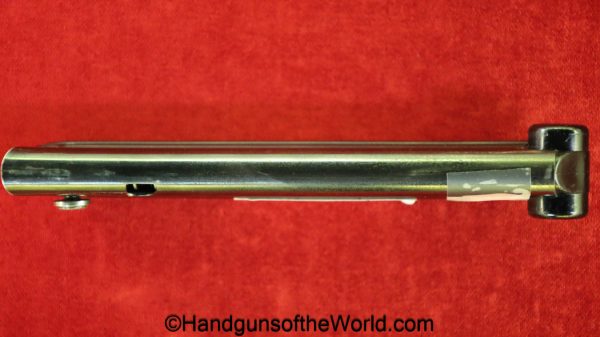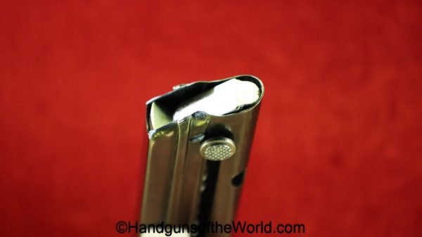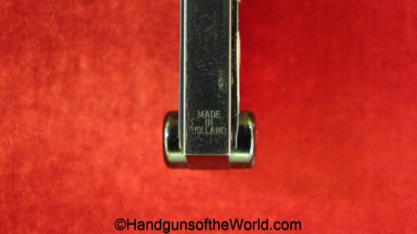 Original Luger P.08, 9mm or .30 caliber Pistol Magazine. This has a black Plastic base and is marked “Made in Holland” on the spine. About 95% blue remains.