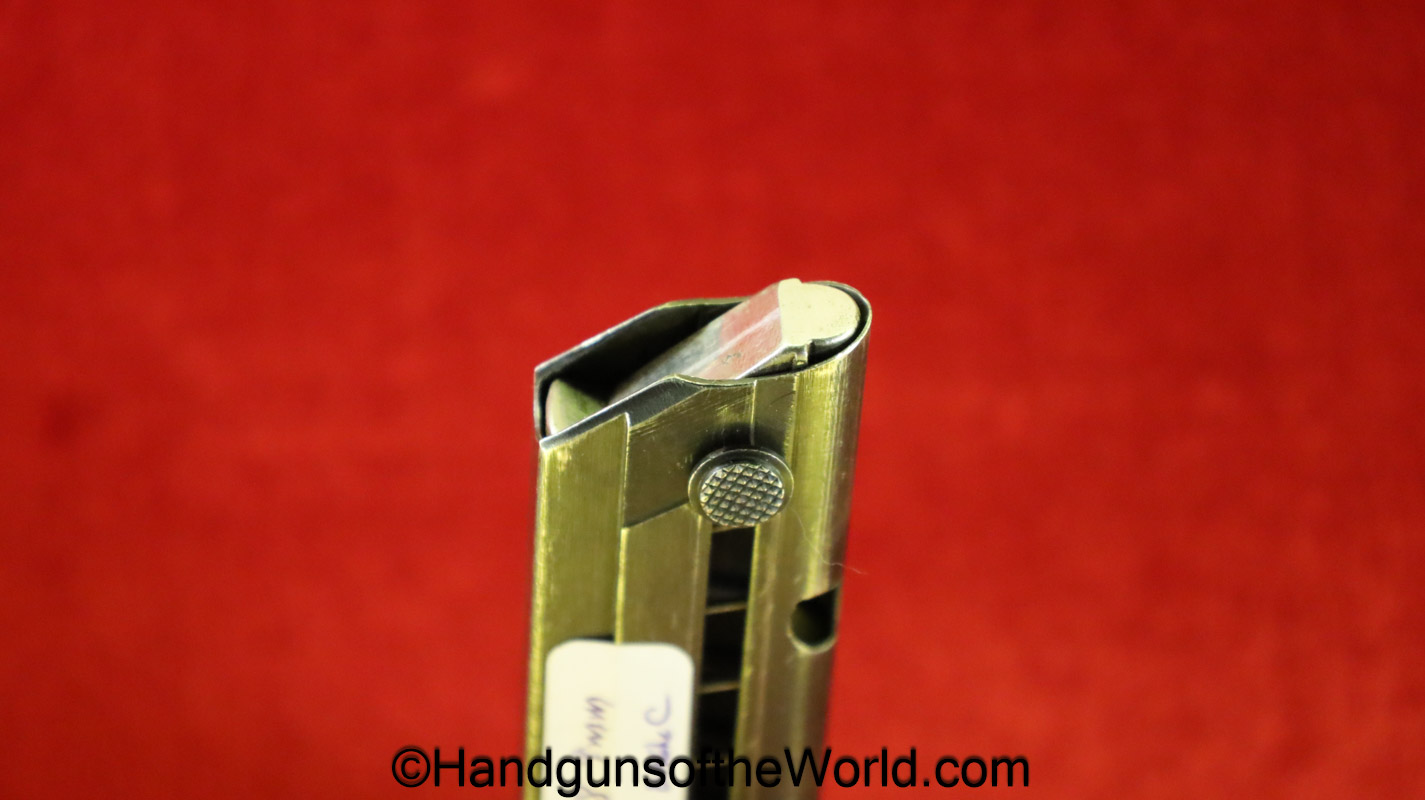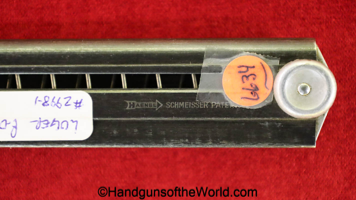 Original German Luger P.08, 9mm Pistol Magazine. Marked on the aluminum base #2998-1 and Police Eagle C proof. This is also marked on the side with the Haenel Schmeisser Patent logo. The blue rates about 95%.