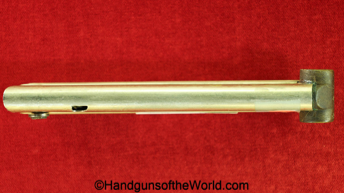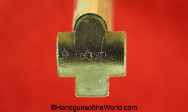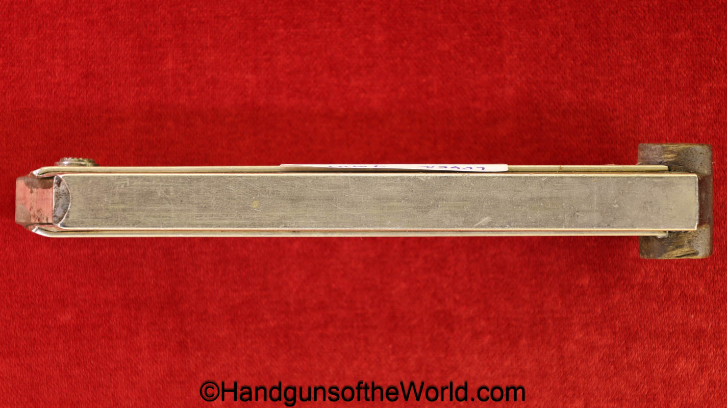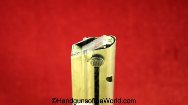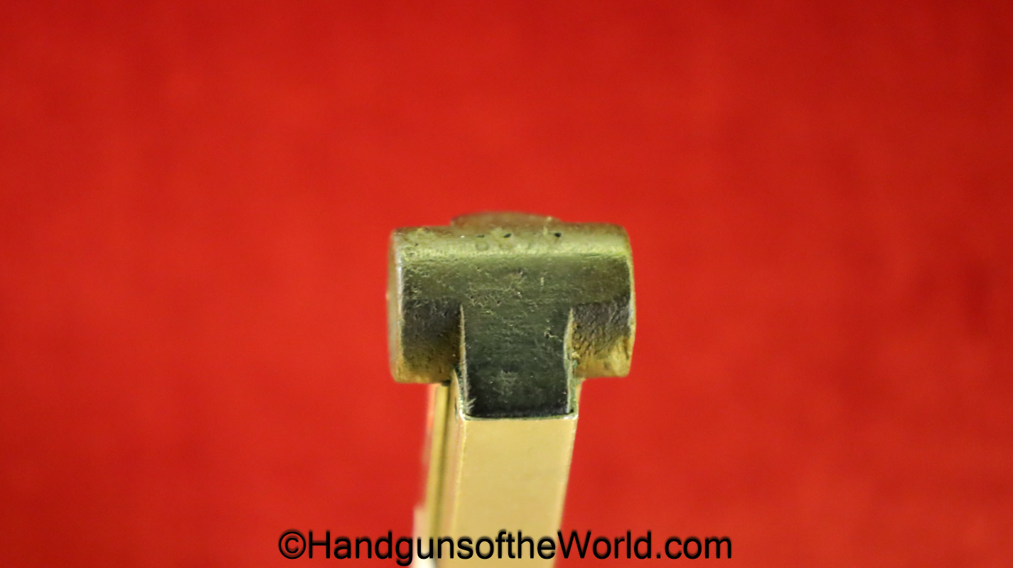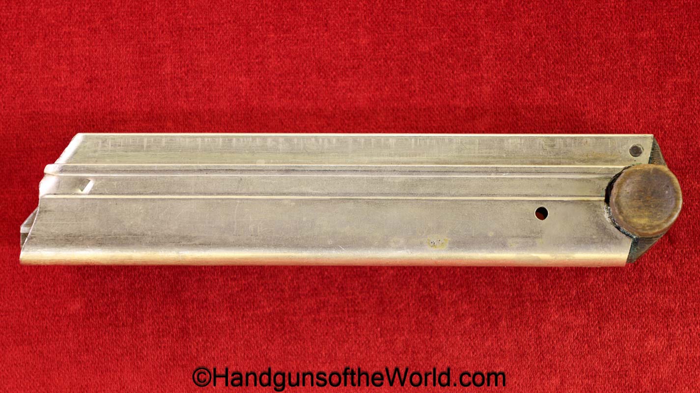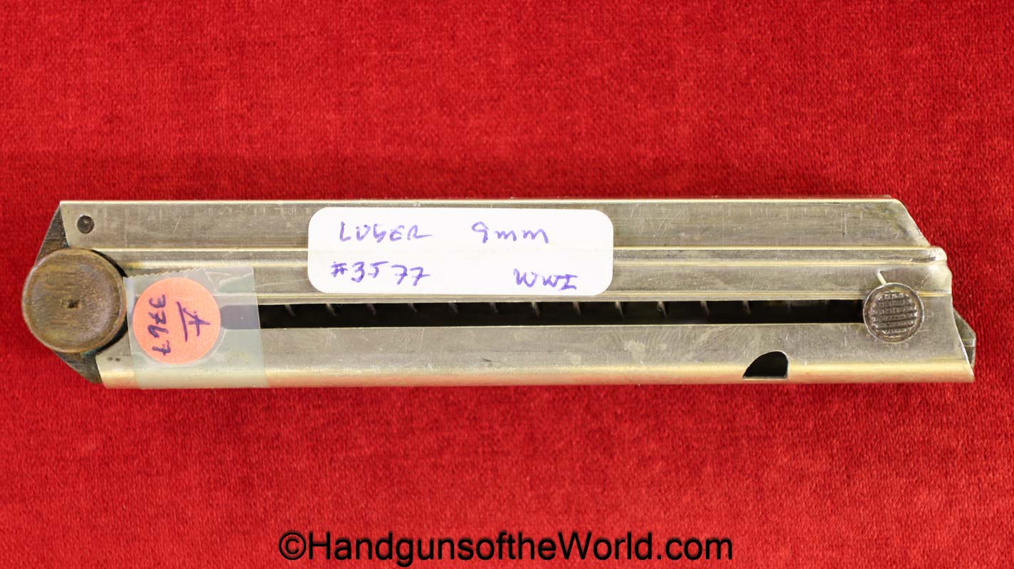 Original German Luger P.08, 9mm Pistol Magazine with a wooden base. This WWI era magazine has been renumbered to #3577 and has a Military proof. This retains about 99% nickel.