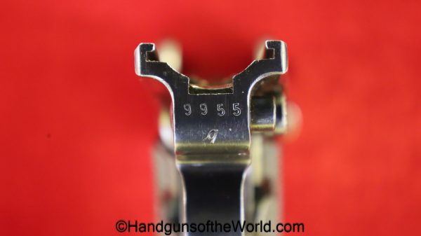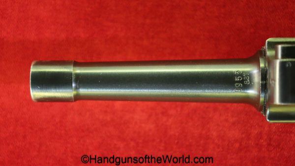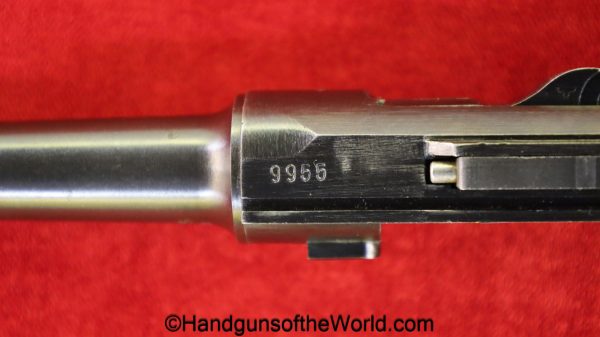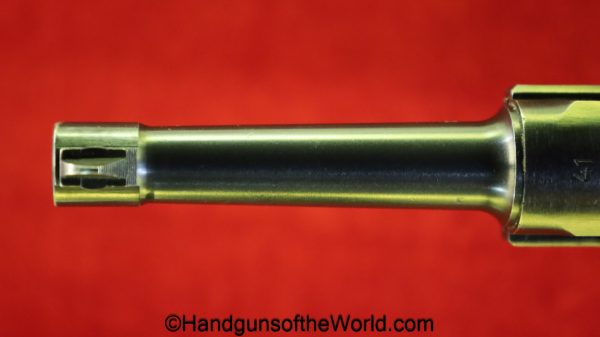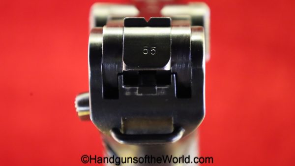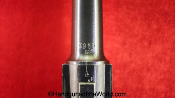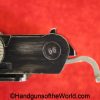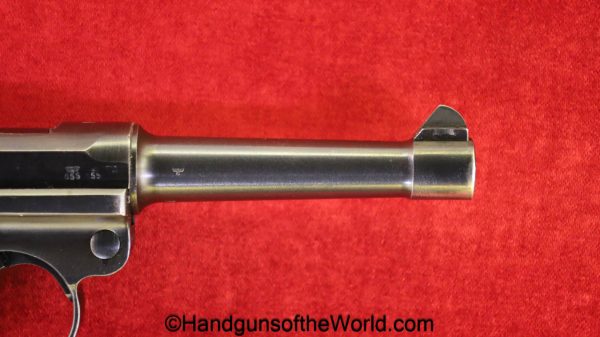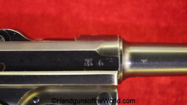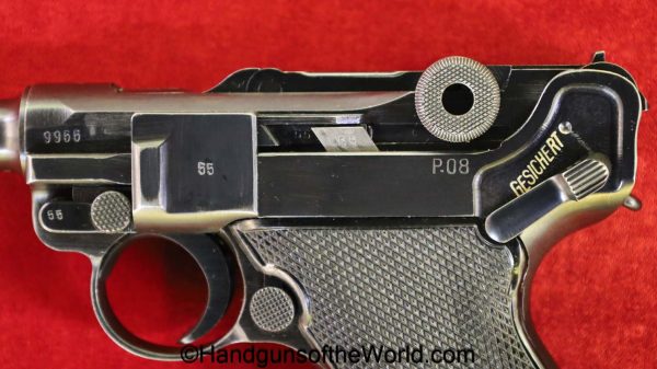 Mauser P.08, BYF41, 9mm. The is German WWII eagle 655 proofed on the right receiver. This has the black Widow pattern, black Bakelite grips and a matching aluminum base magazine. This has all matching numbers with about 98% blue and the bore is VG+.
