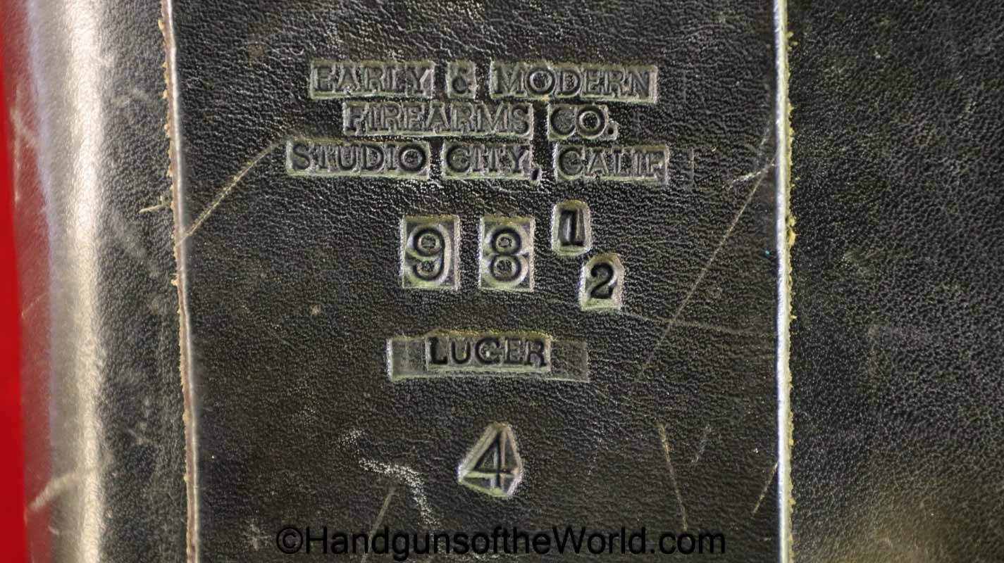 Luger P.08 Pistol Holster. Black leather with chrome snaps. This is marked “Early & Modern Firearms Co-Studio City Calif-98 1/2-Luger-4” on the back. Overall VG+
