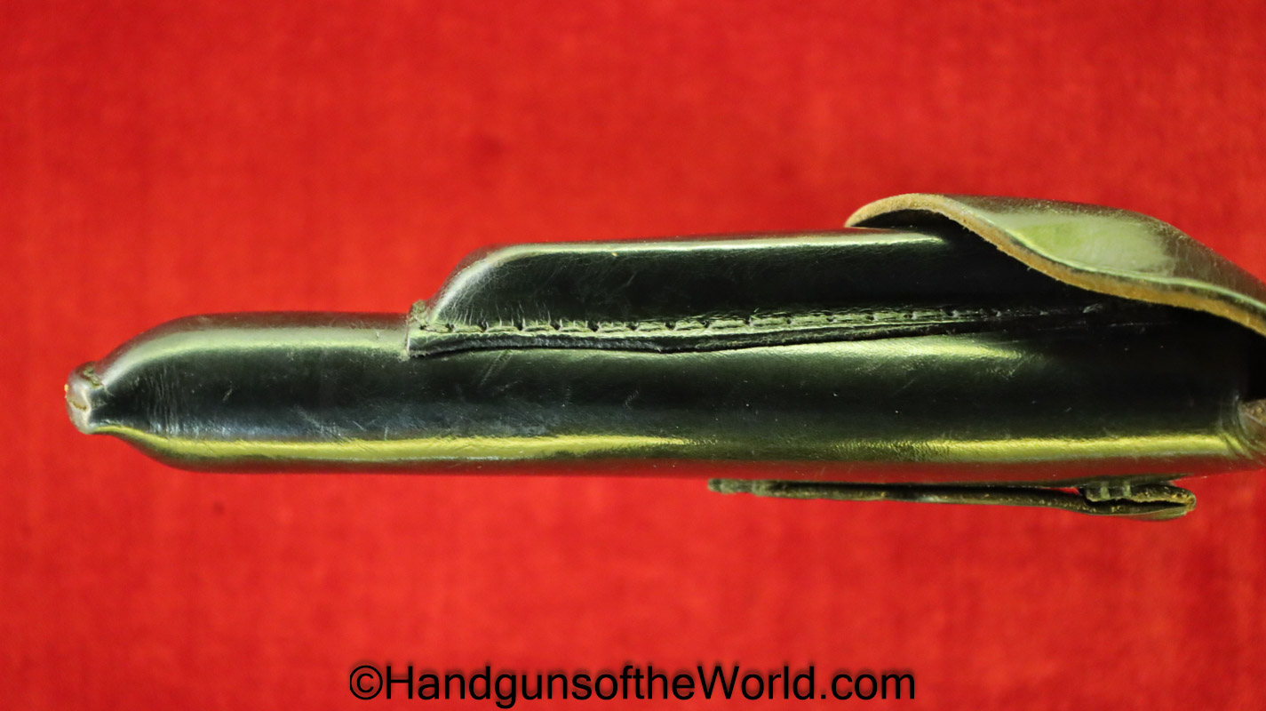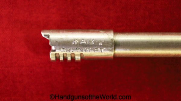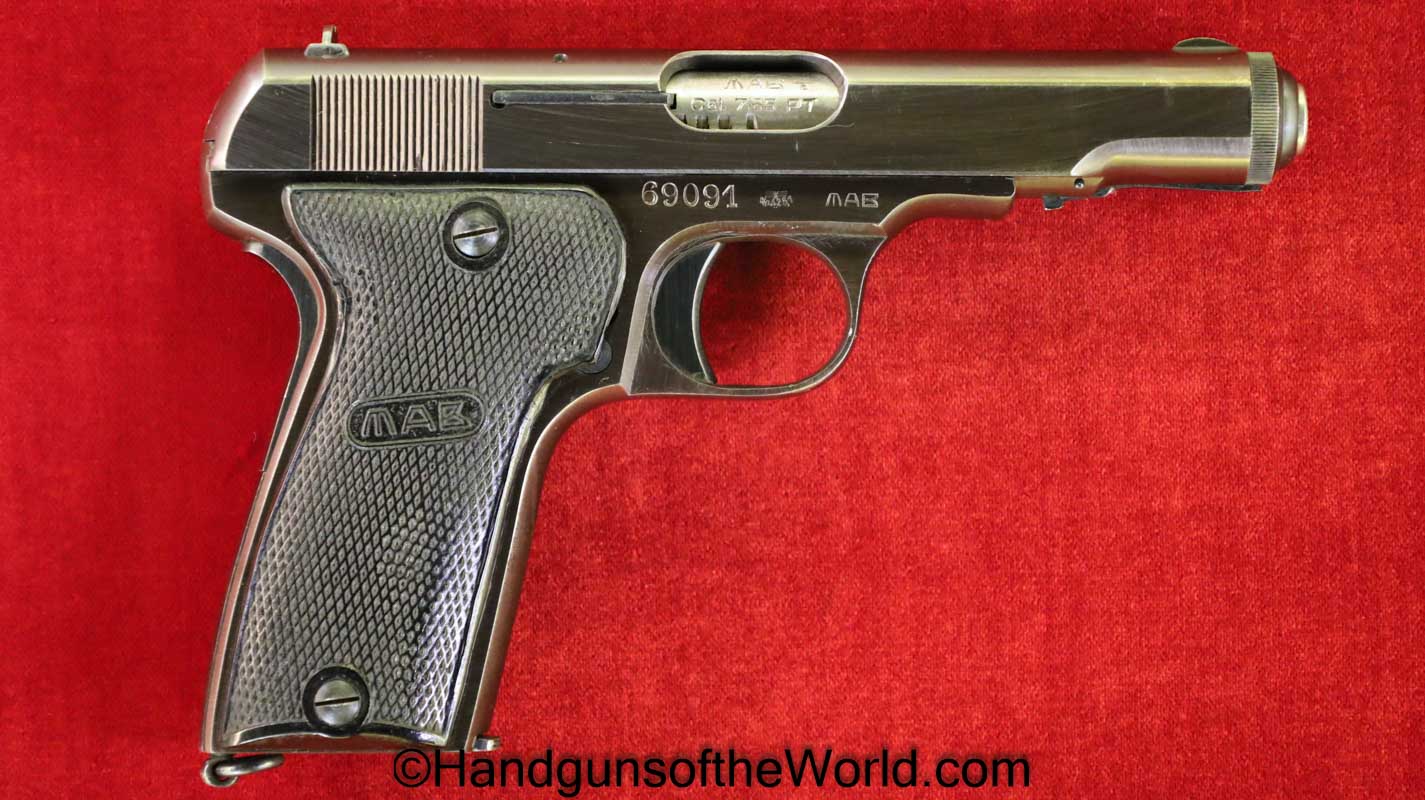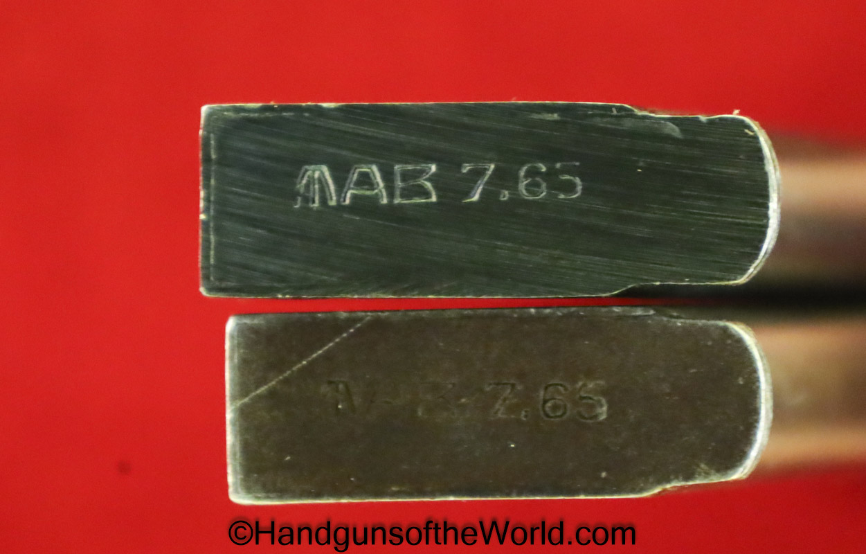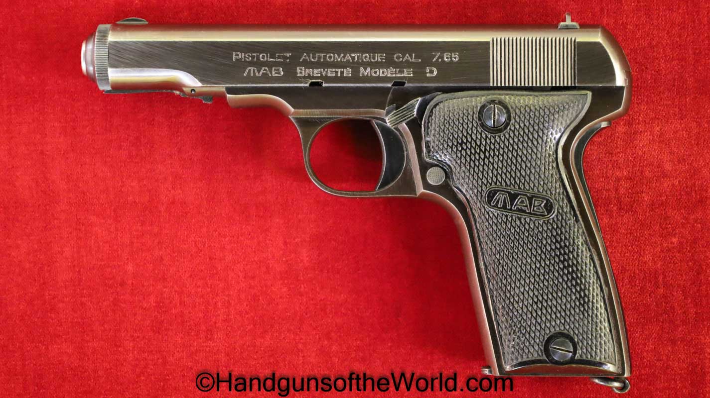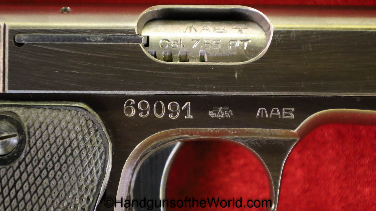 MAB Model D, 7.65mm. This is German WWII WaA251 proofed on the right side of the frame. This has correct black Bakelite grips. The slide has the matching number. The blue rates at 99% and the bore is excellent. This full rig includes a period, black leather holster and a spare magazine.