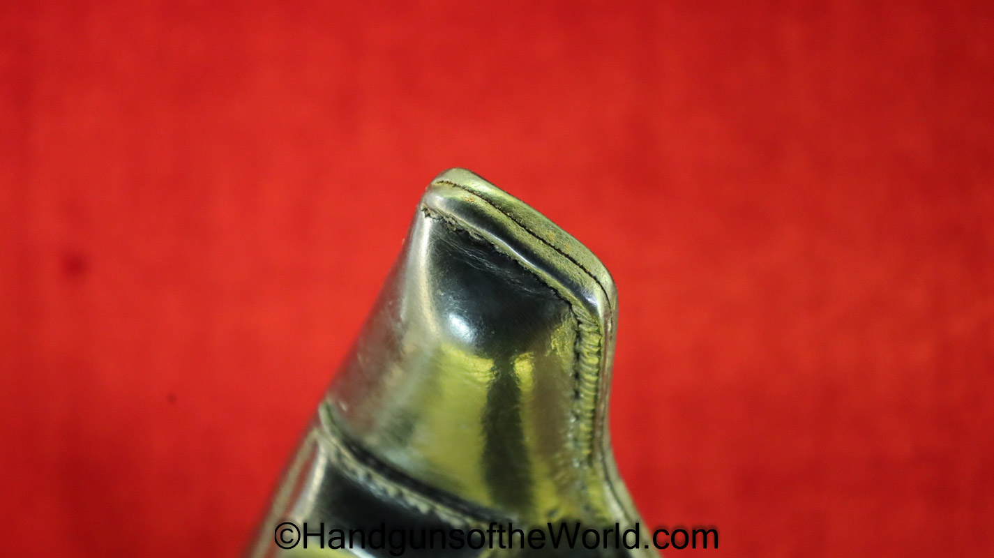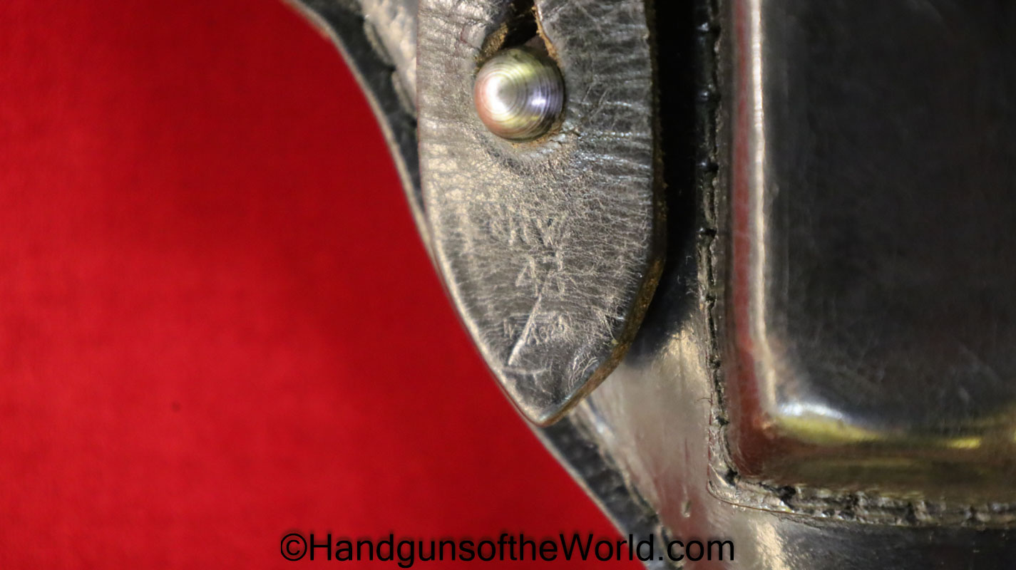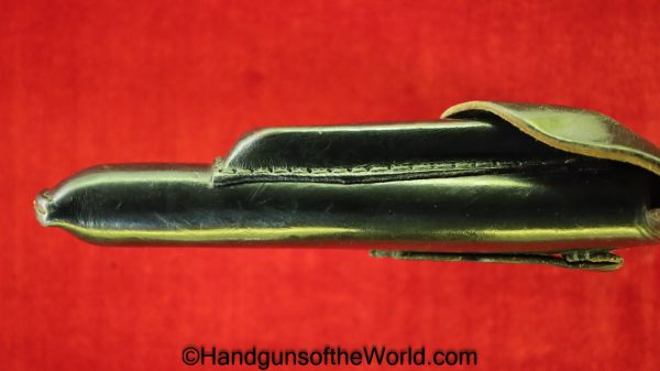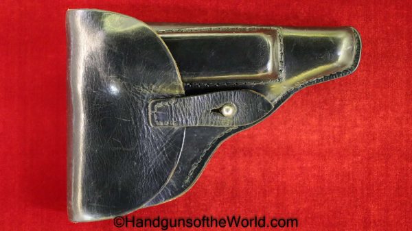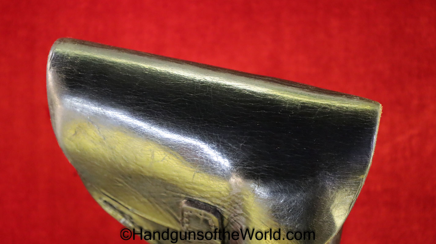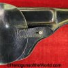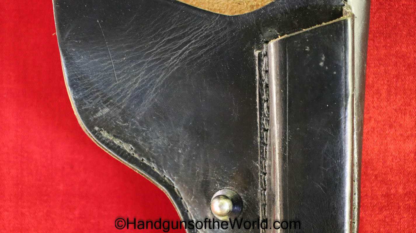 MAB Model D, 7.65mm. This is German WWII WaA251 proofed on the right side of the frame. This has correct black Bakelite grips. The slide has the matching number. The blue rates at 99% and the bore is excellent. This full rig includes a period, black leather holster and a spare magazine.