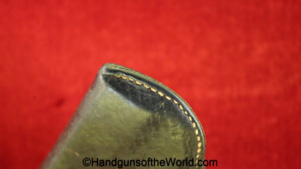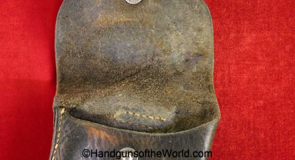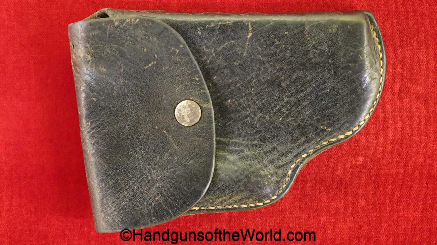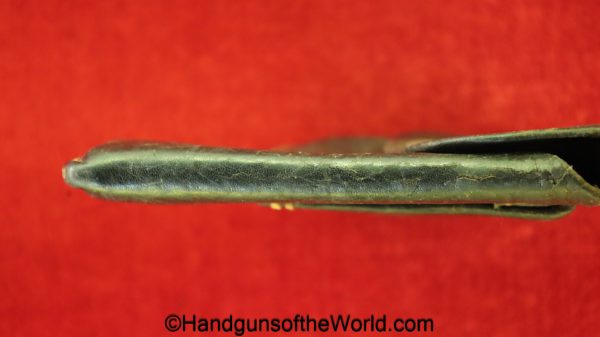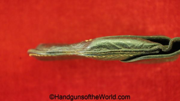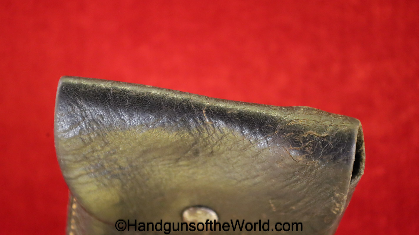 Period Mann WT-1921 Pistol Holster. This is unmarked brown leather built without a spare magazine pouch, and a snap closure. Overall VG-VG+.