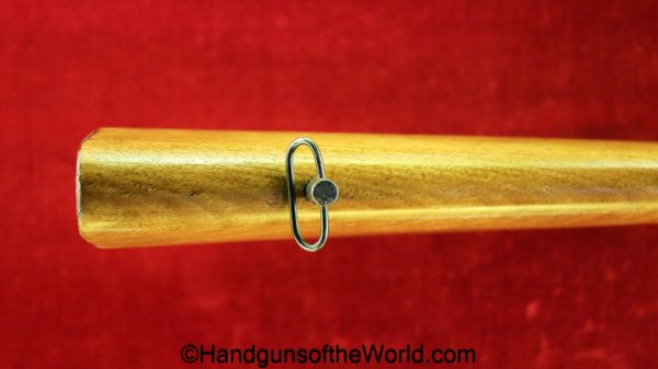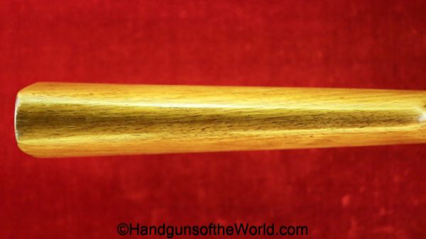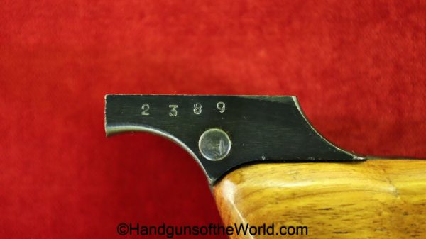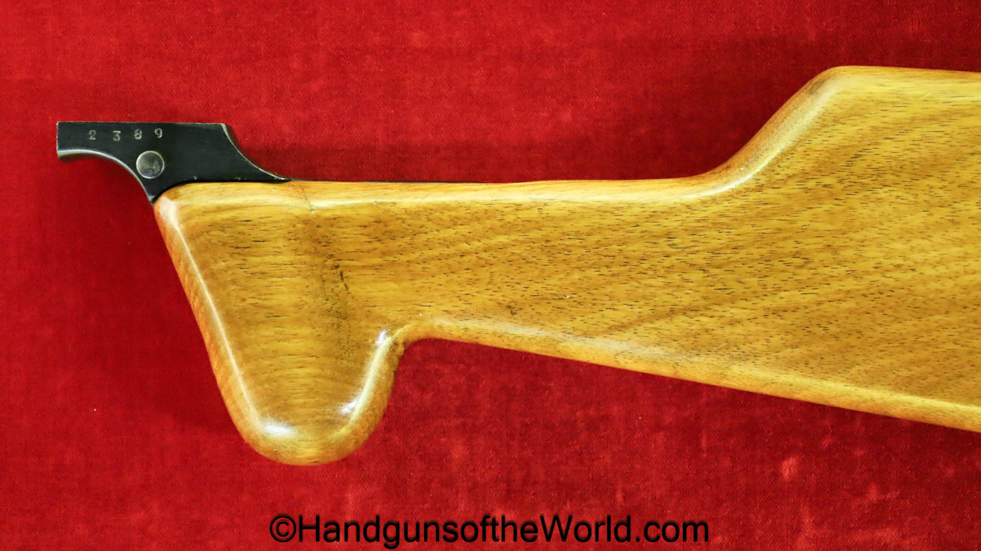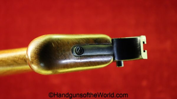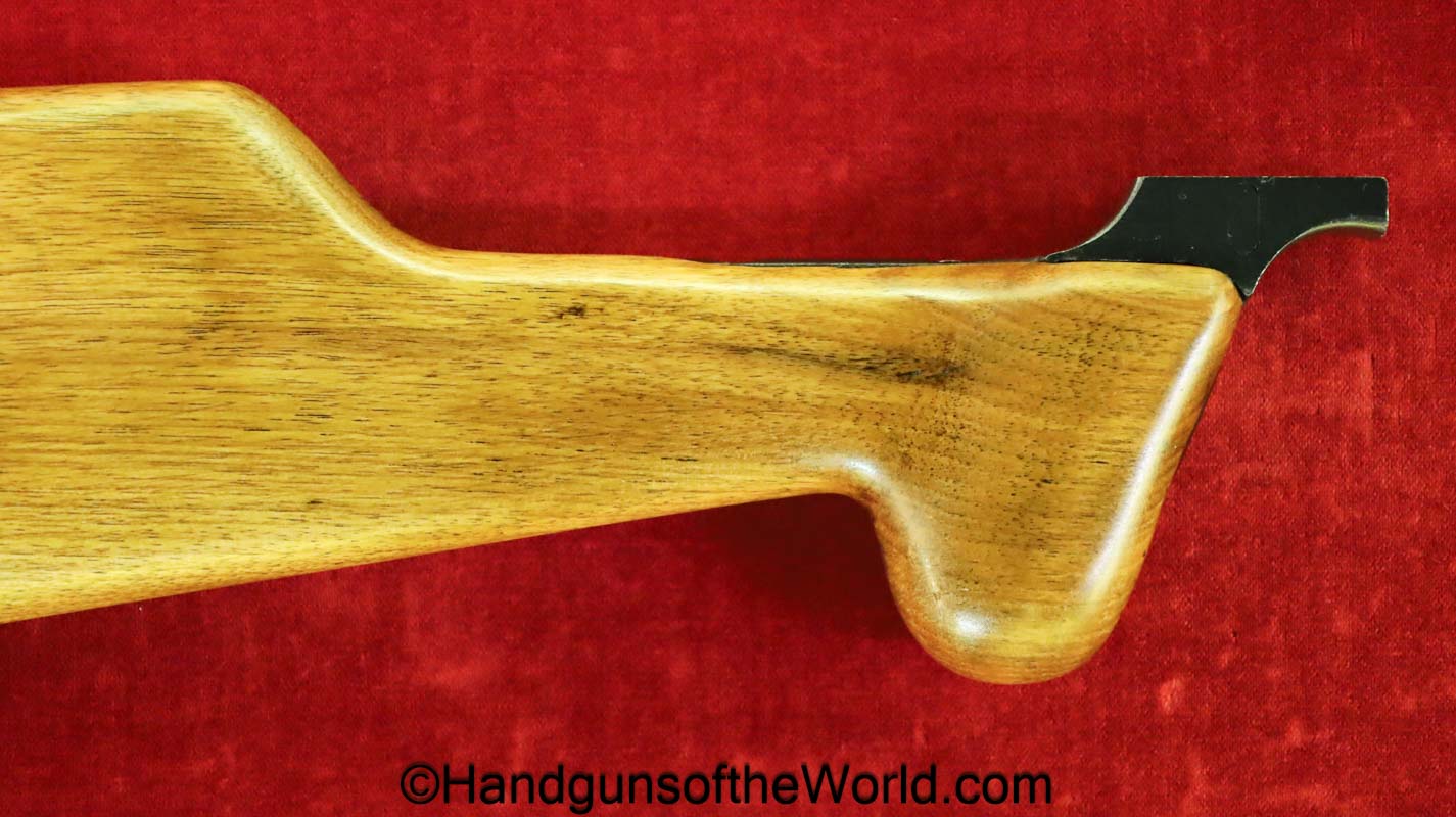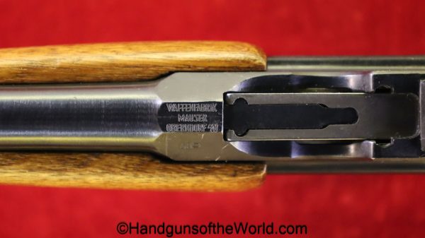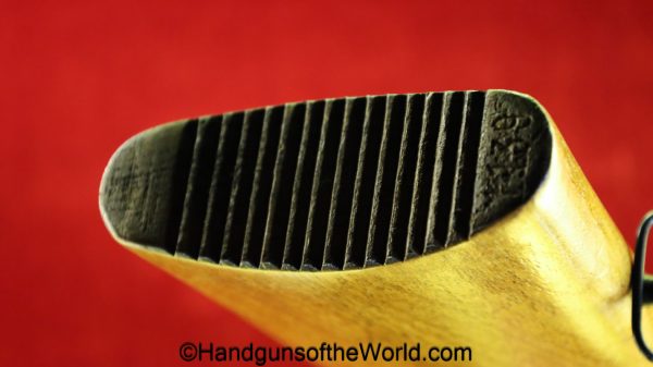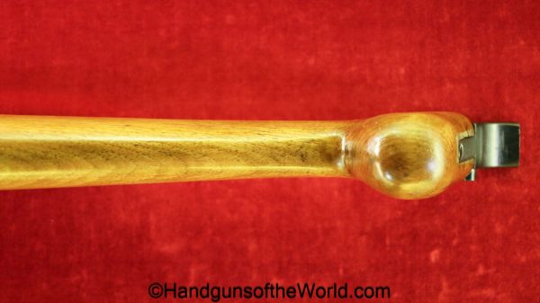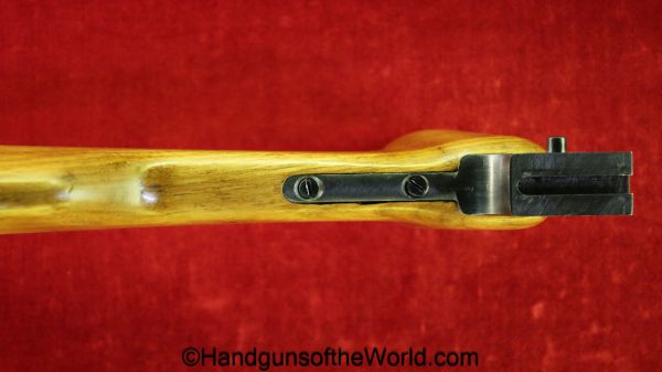 Mauser 1896 Broomhandle Carbine, 7.63mm. This has a 16″ barrel and a smooth walnut stock and forearm. There is a Mauser banner on the left side of the frame. While assembled from parts, this now has all matching assembly serial numbers. This has no importer markings, about 99% retailer blue and the bore is excellent. This was not built by Mauser as a carbine, but rather a professional rendition converted to the famous Mauser Broomhandle Carbine.