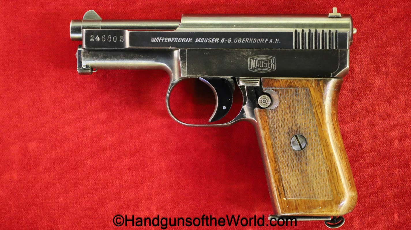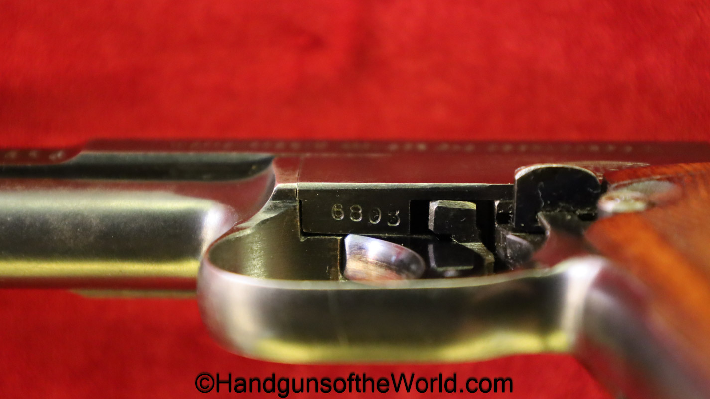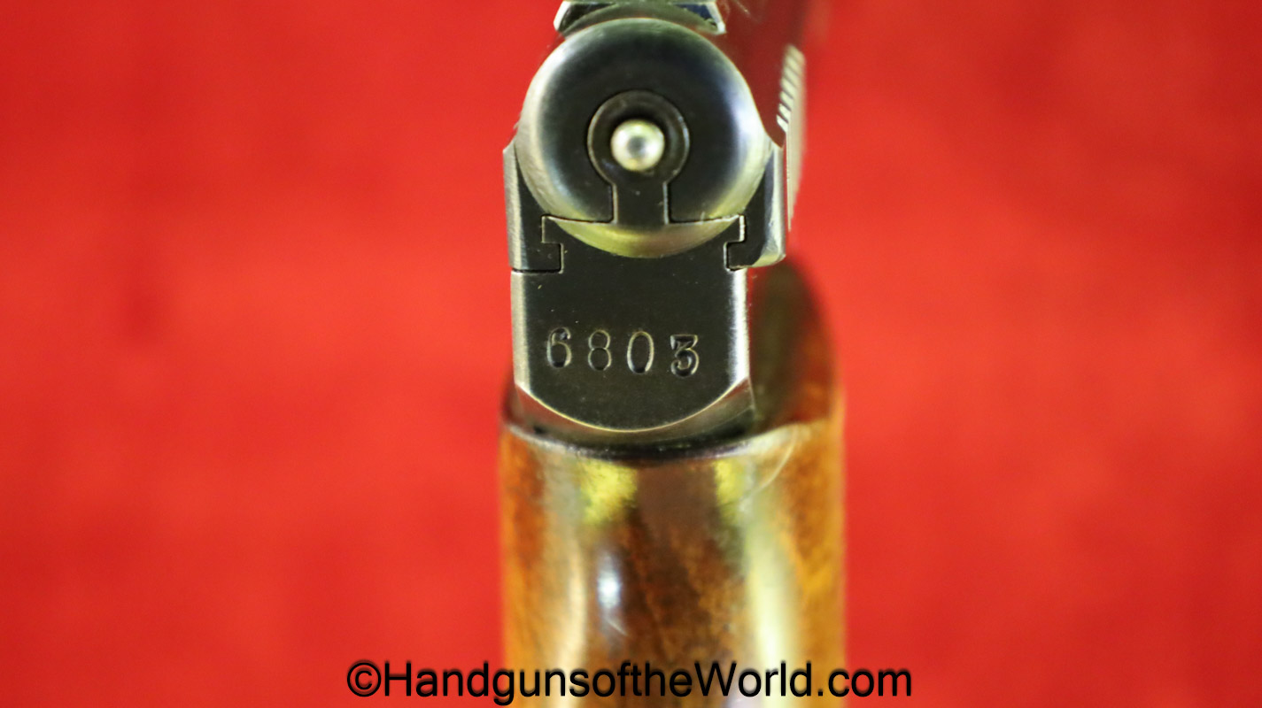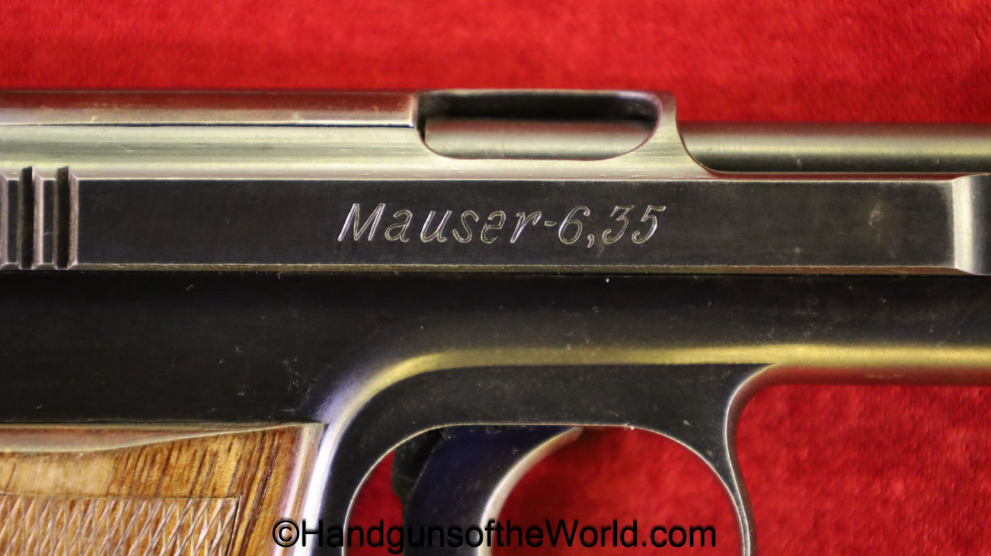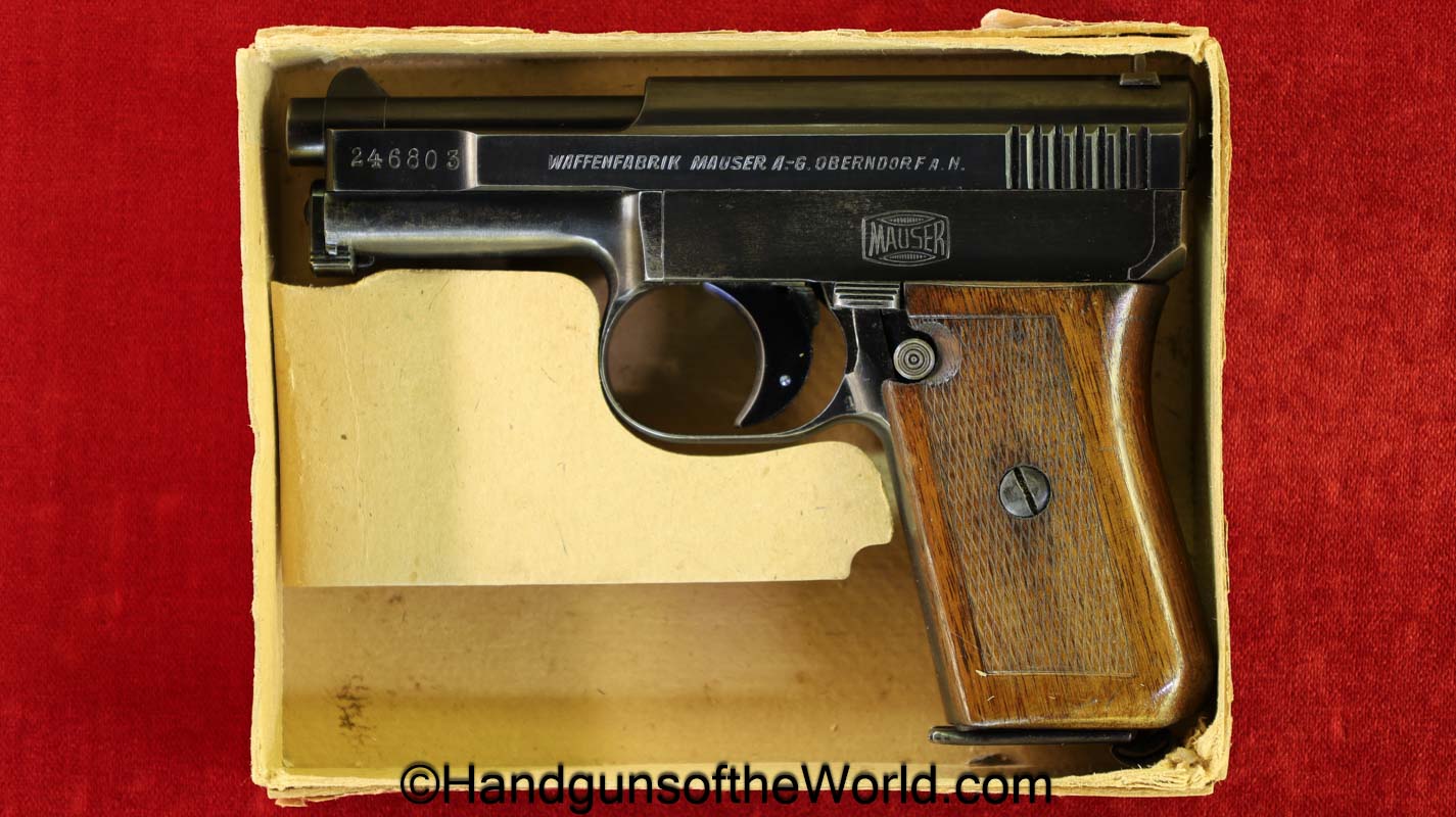 Mauser 1910, 6.35mm. This has the correct 1 piece checkered walnut grips, and is Not marked Germany. This has all matching numbers, about 98% blue and the bore is Excellent. This comes with its original, red cardboard box with manual.