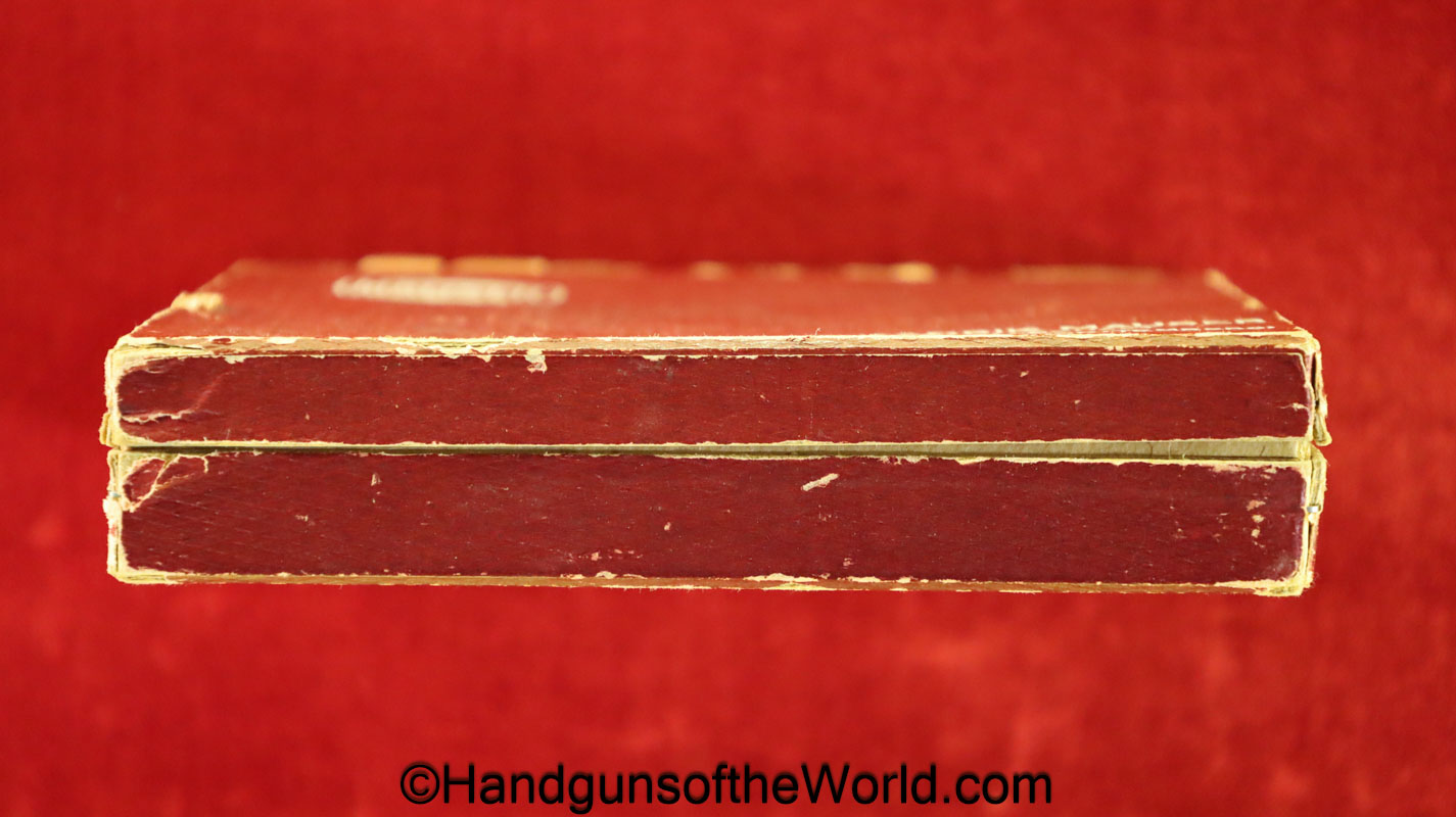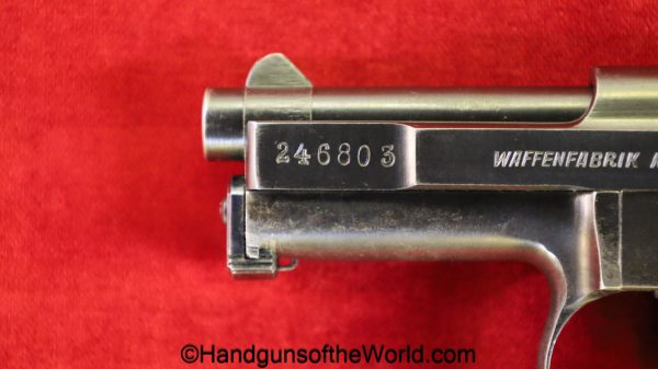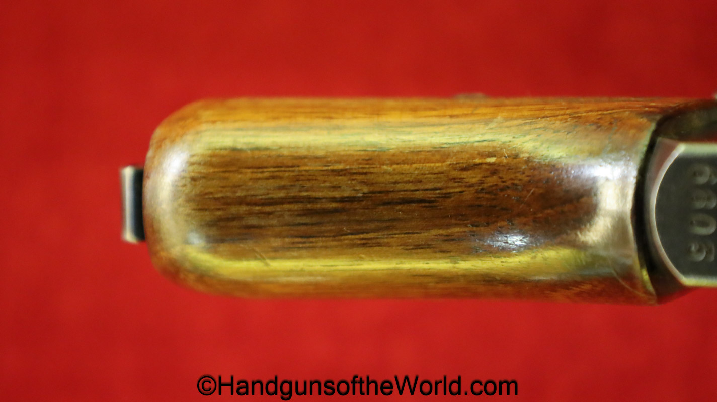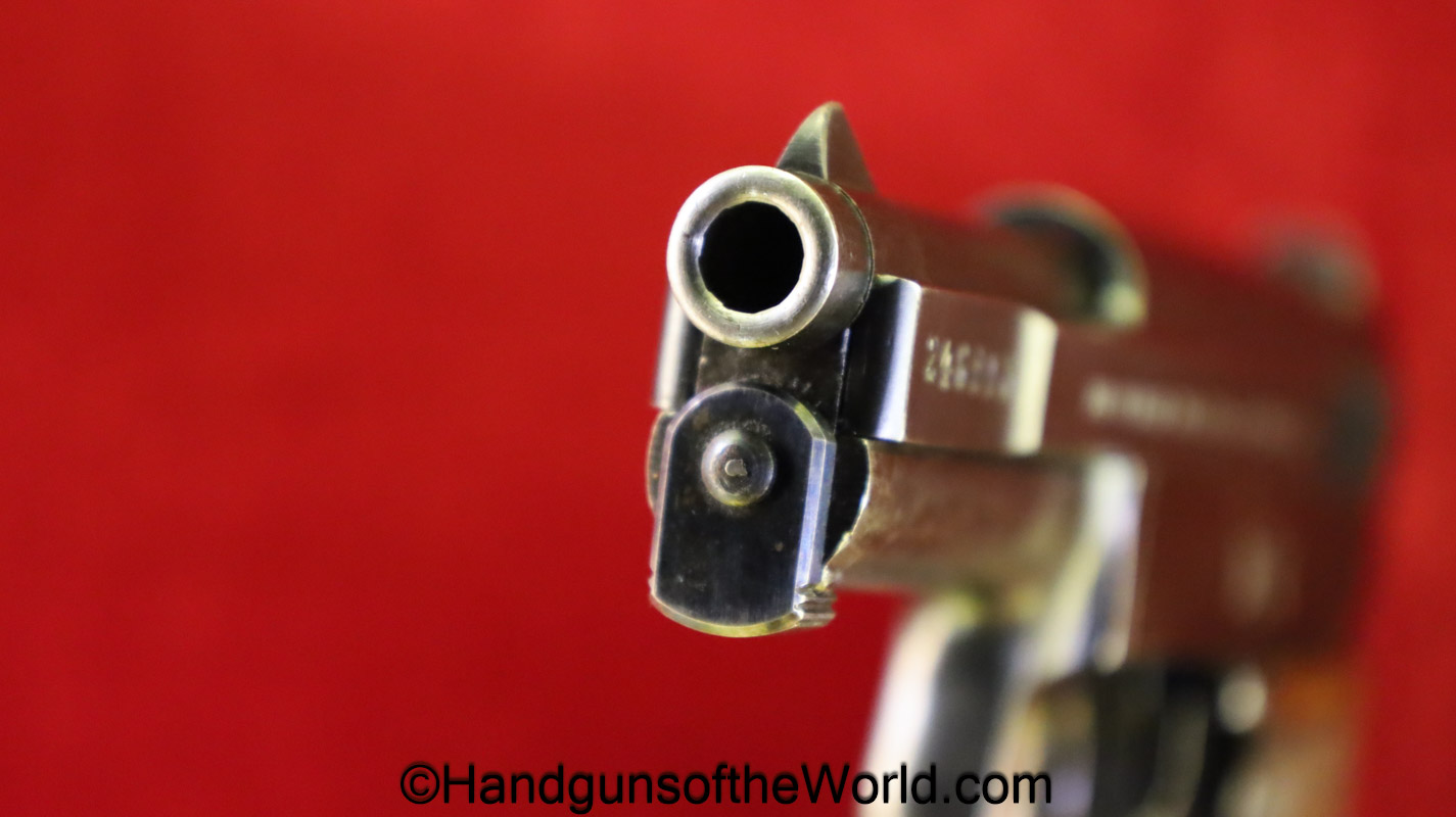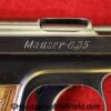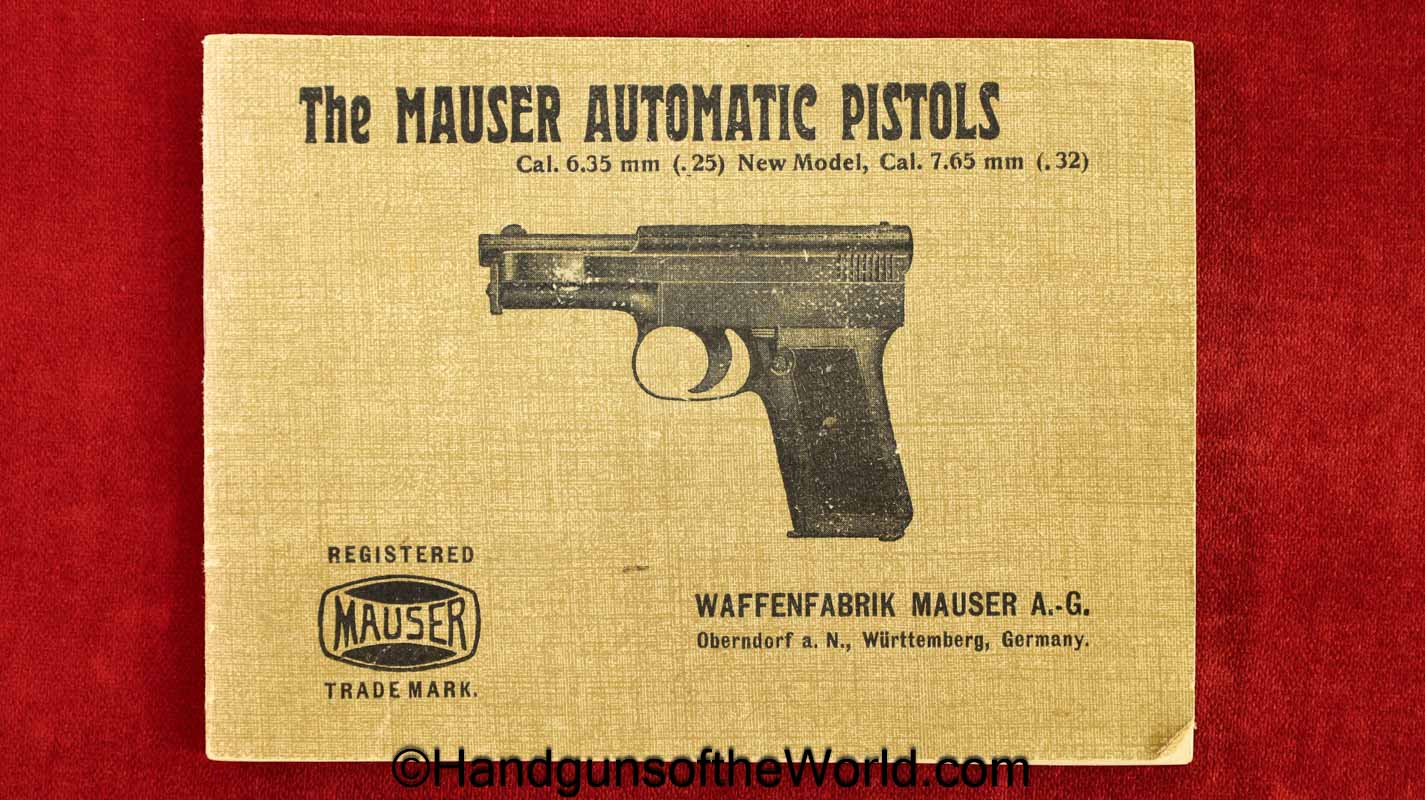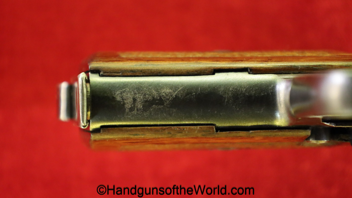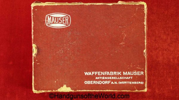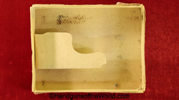 Mauser 1910, 6.35mm. This has the correct 1 piece checkered walnut grips, and is Not marked Germany. This has all matching numbers, about 98% blue and the bore is Excellent. This comes with its original, red cardboard box with manual.