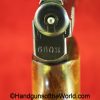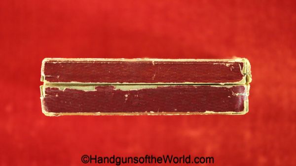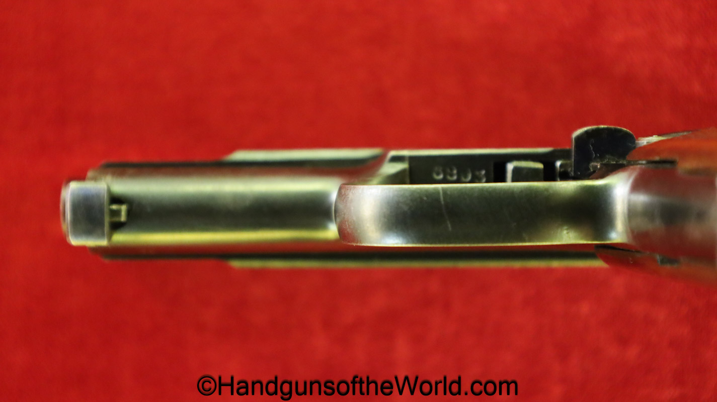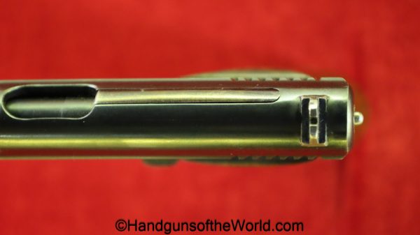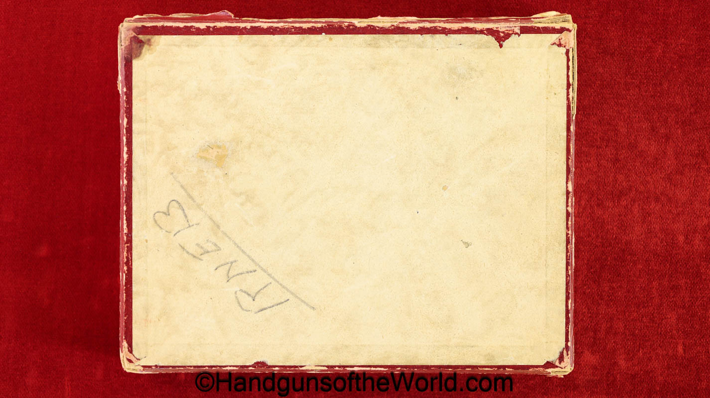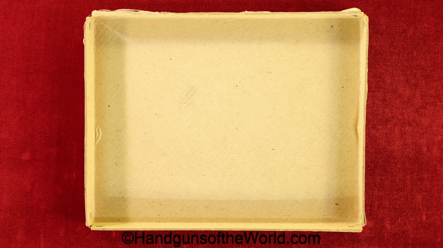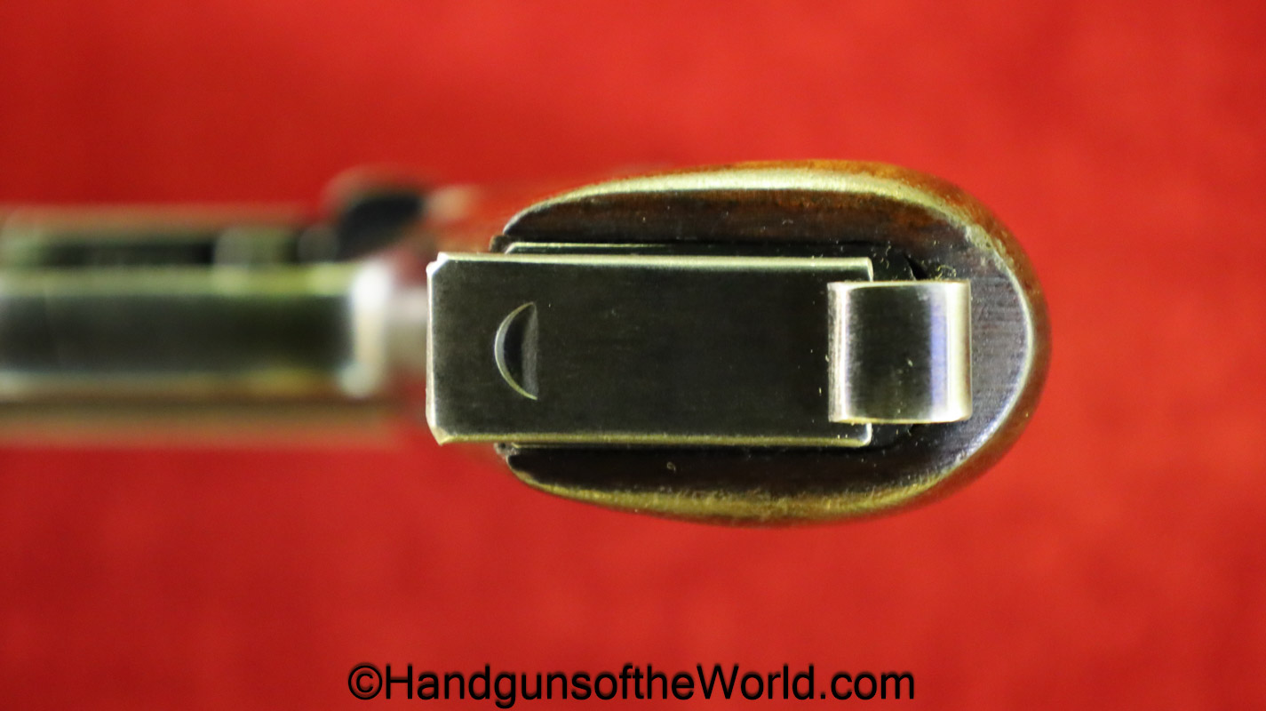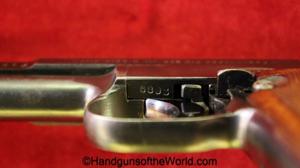 Mauser 1910, 6.35mm. This has the correct 1 piece checkered walnut grips, and is Not marked Germany. This has all matching numbers, about 98% blue and the bore is Excellent. This comes with its original, red cardboard box with manual.
