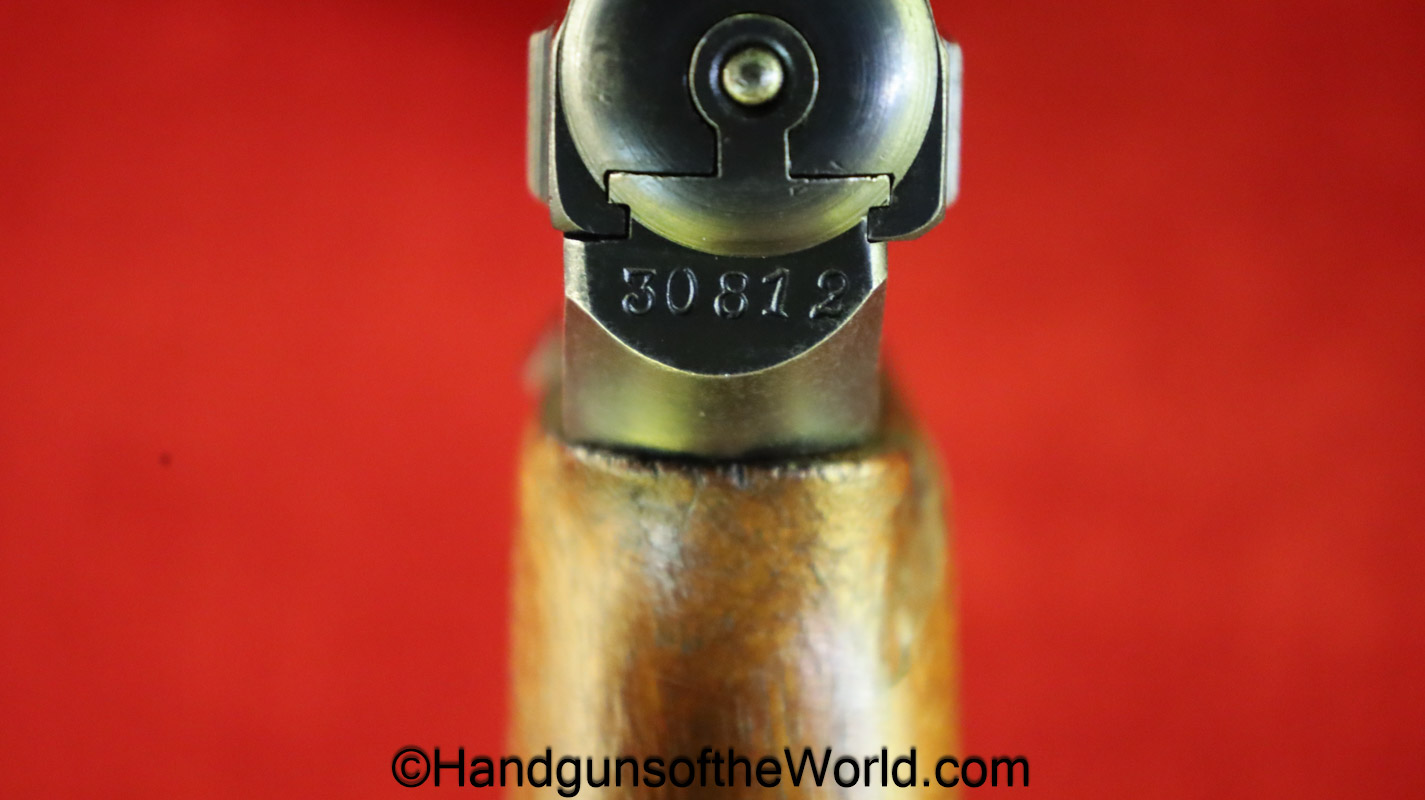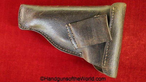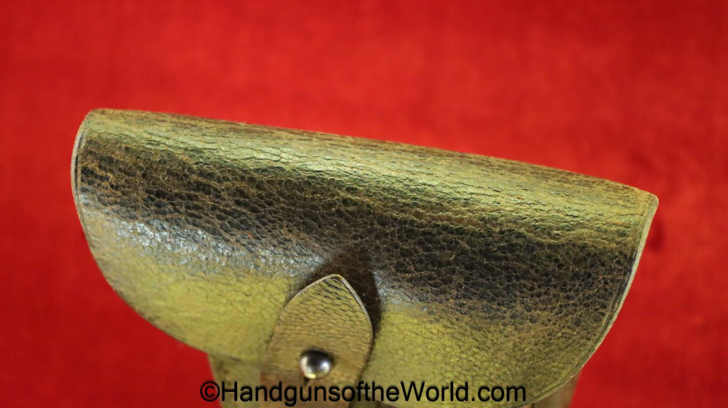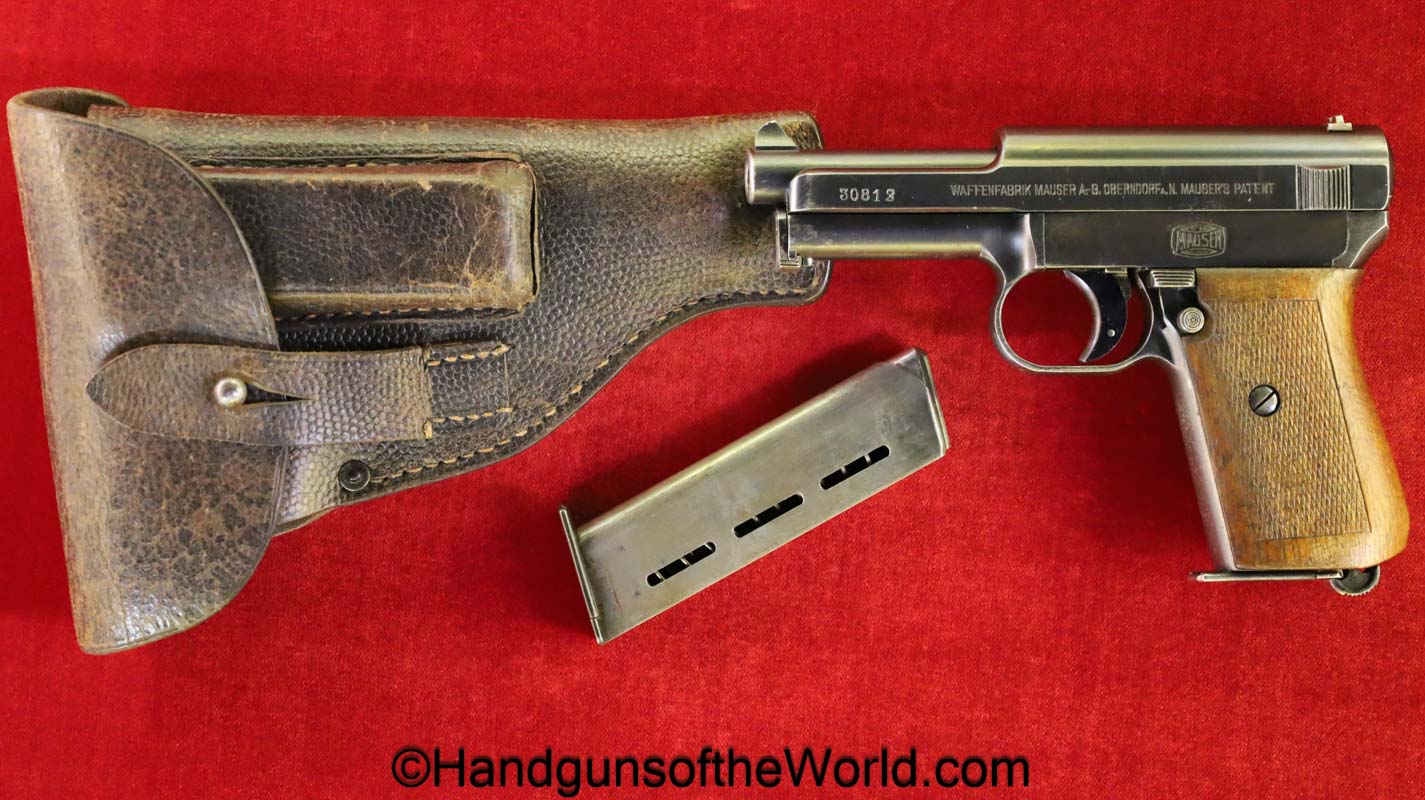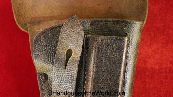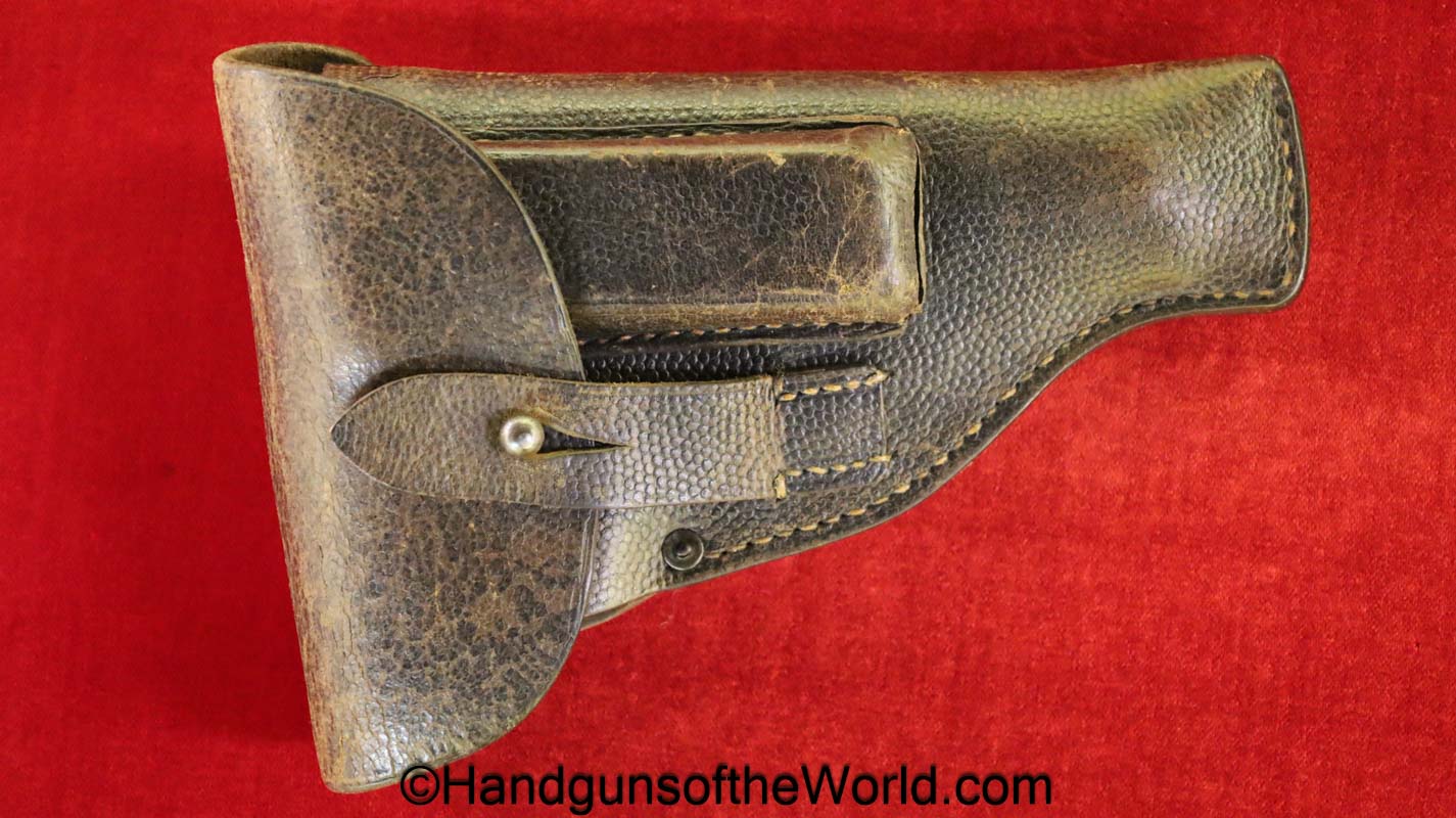 Mauser 1914, 7.65mm. This 1st issue is German WWI Imperial proofed on top of the slide in front of the rear sight. This has correct checkered walnut grips in VG-VG+. This has all matching numbers with about 95% blue and a VG+ bore. This full rig includes an original, General purpose brown leather pebble grain holster, maker marked and dated 1915 and a spare magazine.