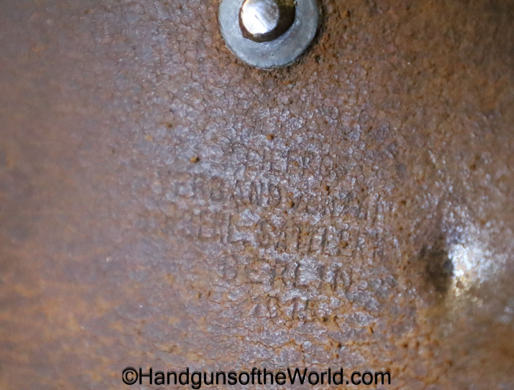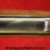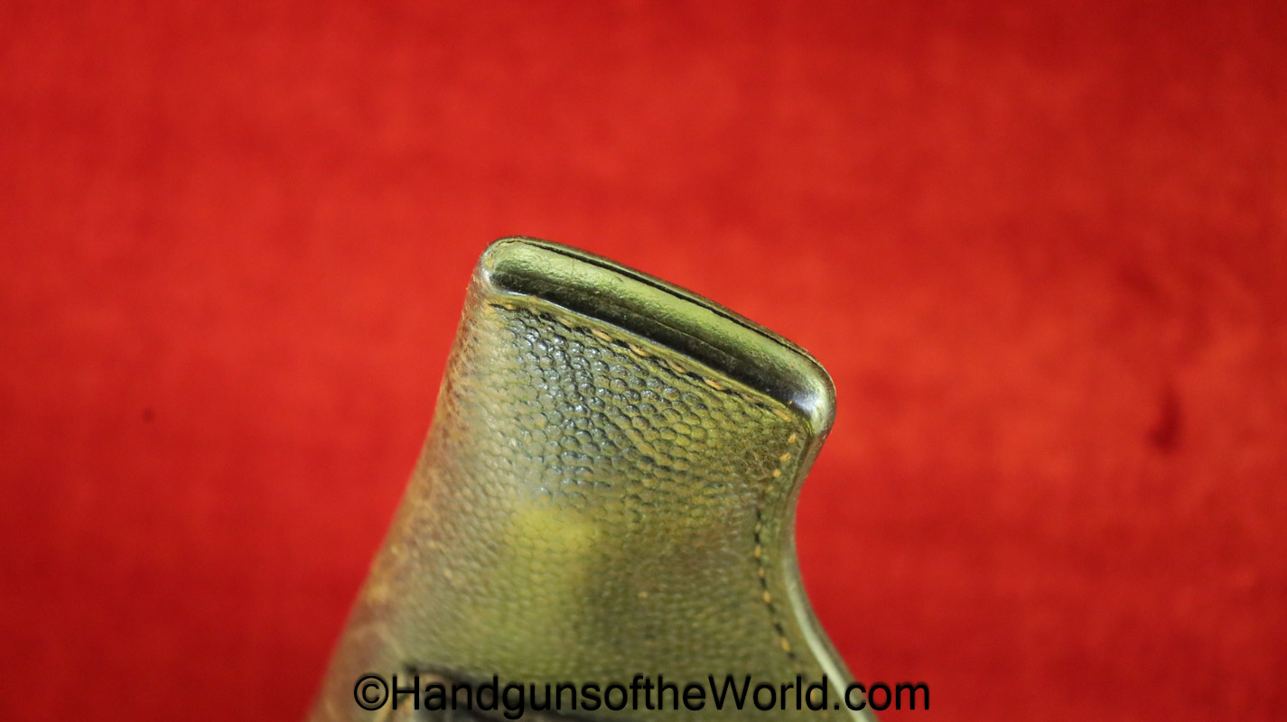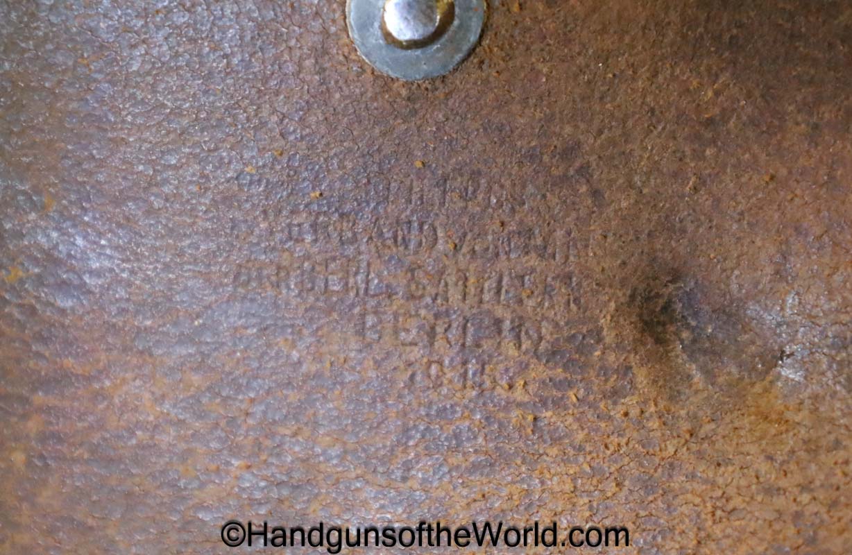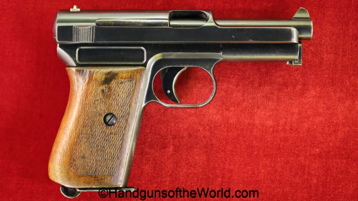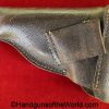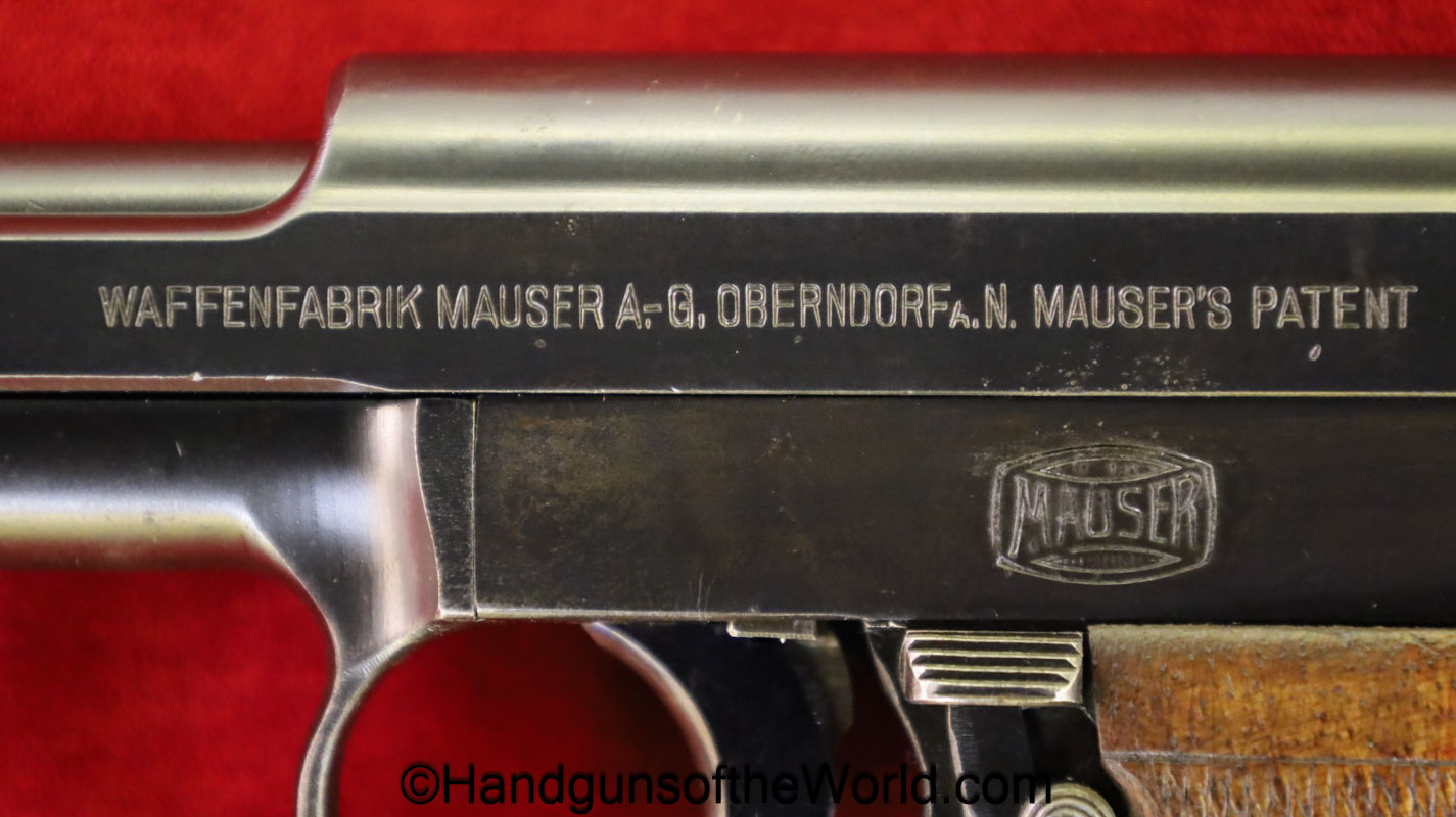 Mauser 1914, 7.65mm. This 1st issue is German WWI Imperial proofed on top of the slide in front of the rear sight. This has correct checkered walnut grips in VG-VG+. This has all matching numbers with about 95% blue and a VG+ bore. This full rig includes an original, General purpose brown leather pebble grain holster, maker marked and dated 1915 and a spare magazine.