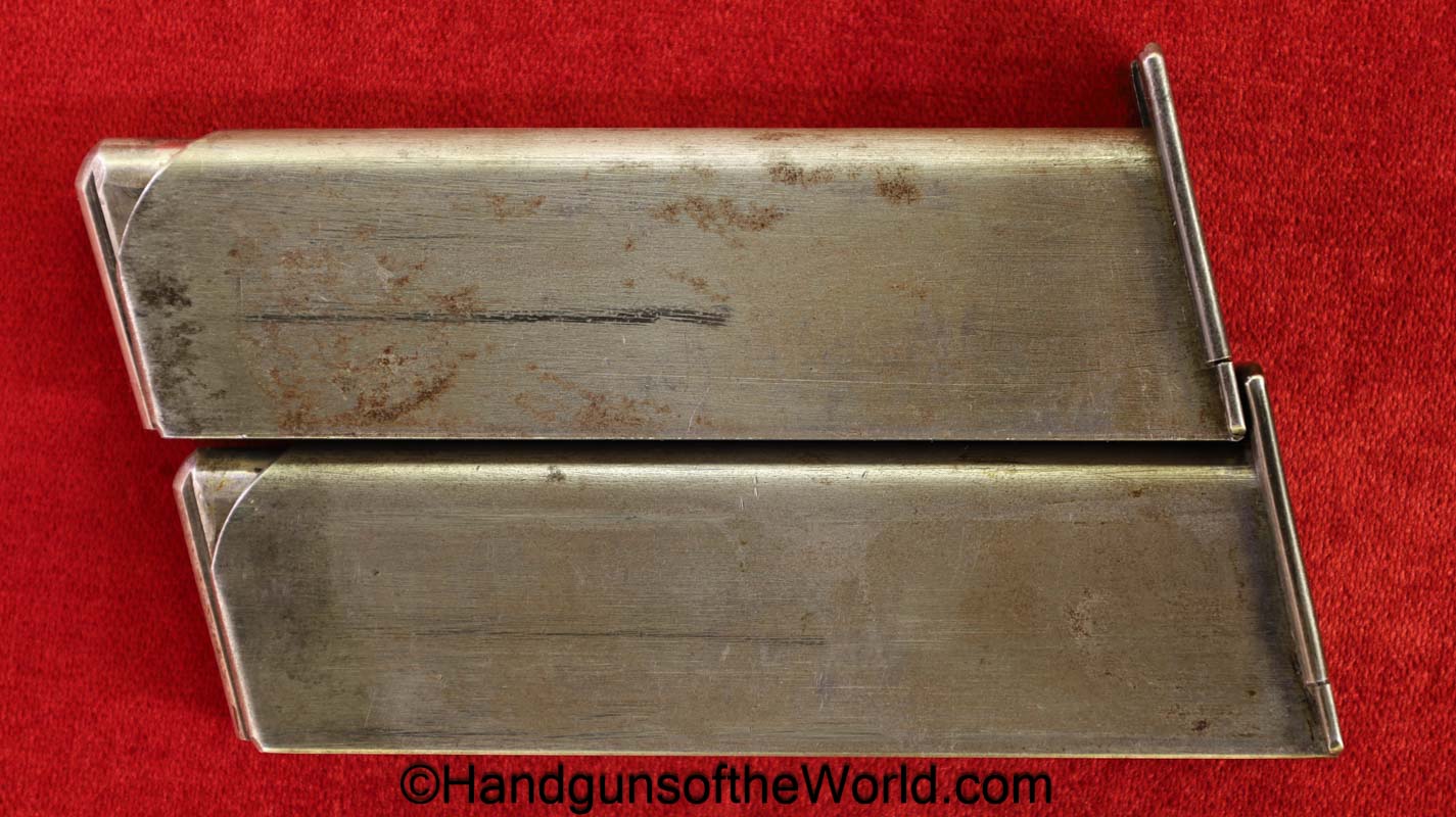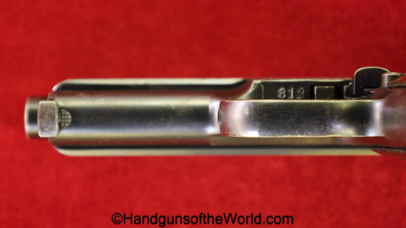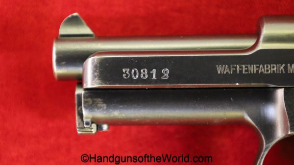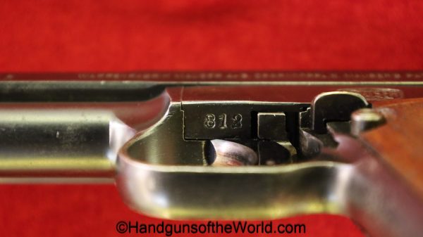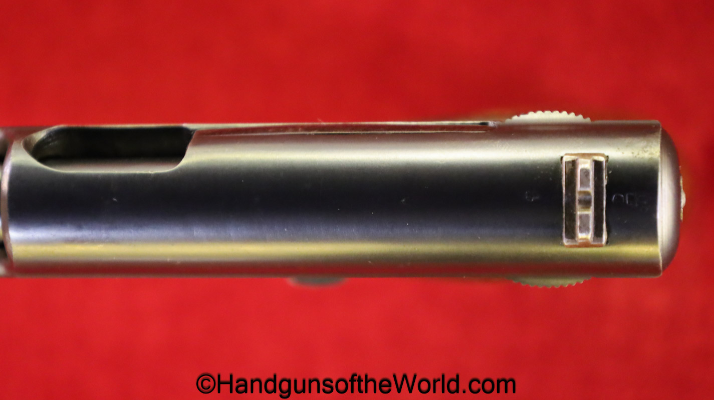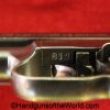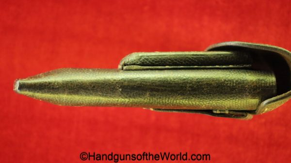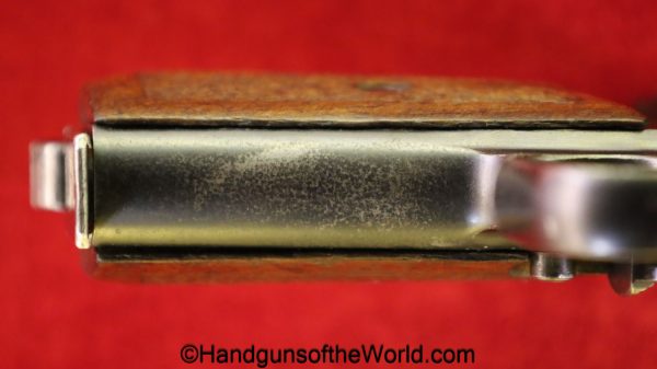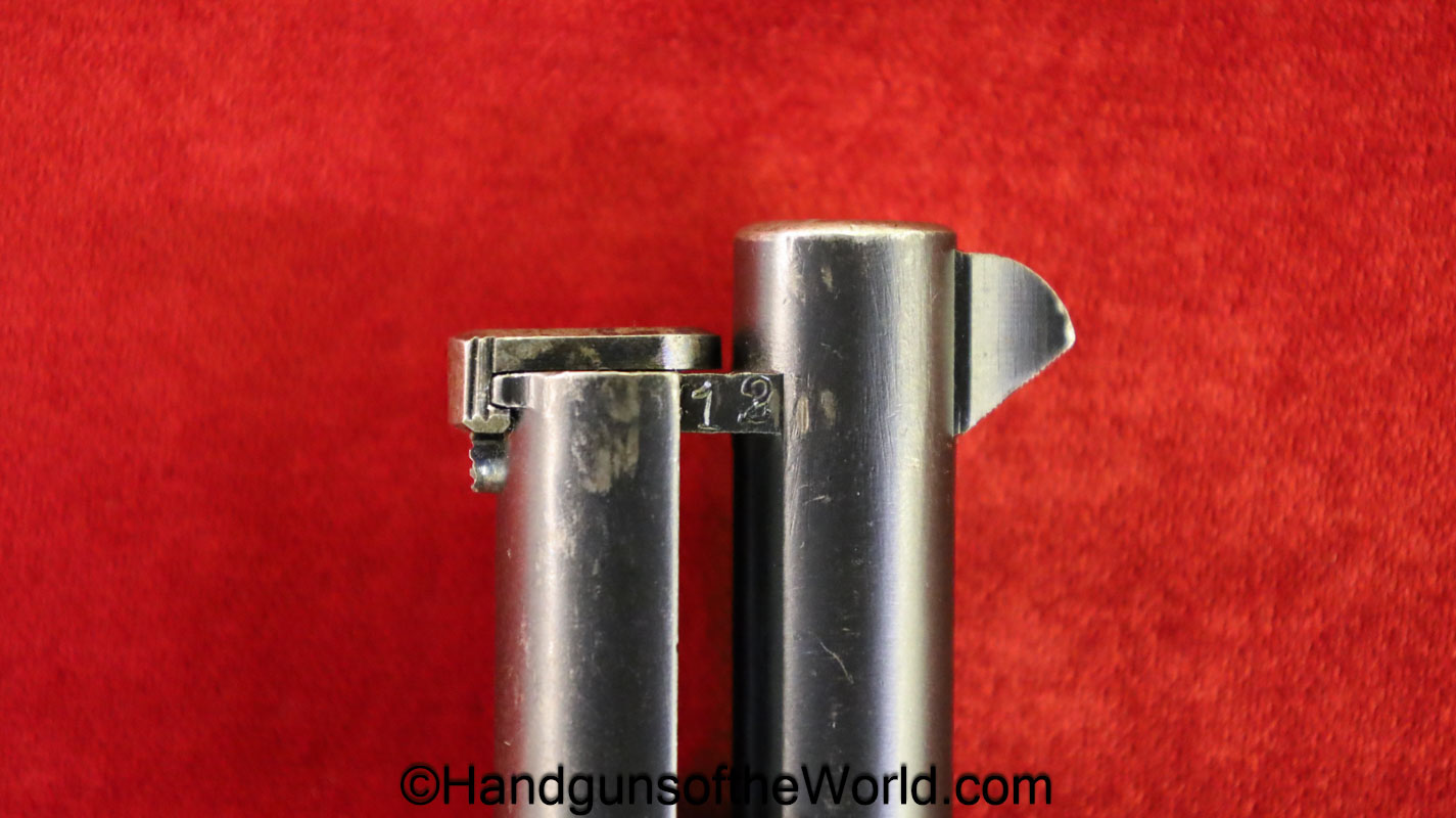 Mauser 1914, 7.65mm. This 1st issue is German WWI Imperial proofed on top of the slide in front of the rear sight. This has correct checkered walnut grips in VG-VG+. This has all matching numbers with about 95% blue and a VG+ bore. This full rig includes an original, General purpose brown leather pebble grain holster, maker marked and dated 1915 and a spare magazine.