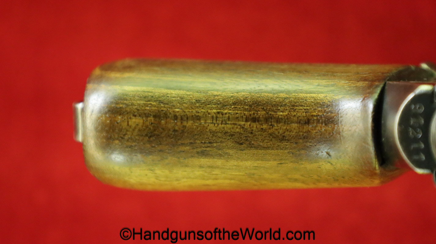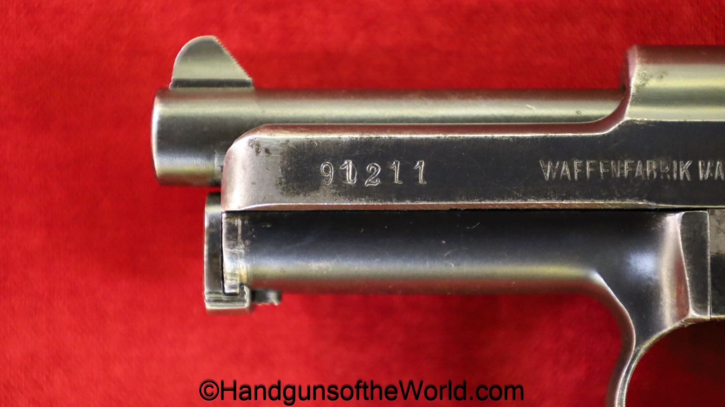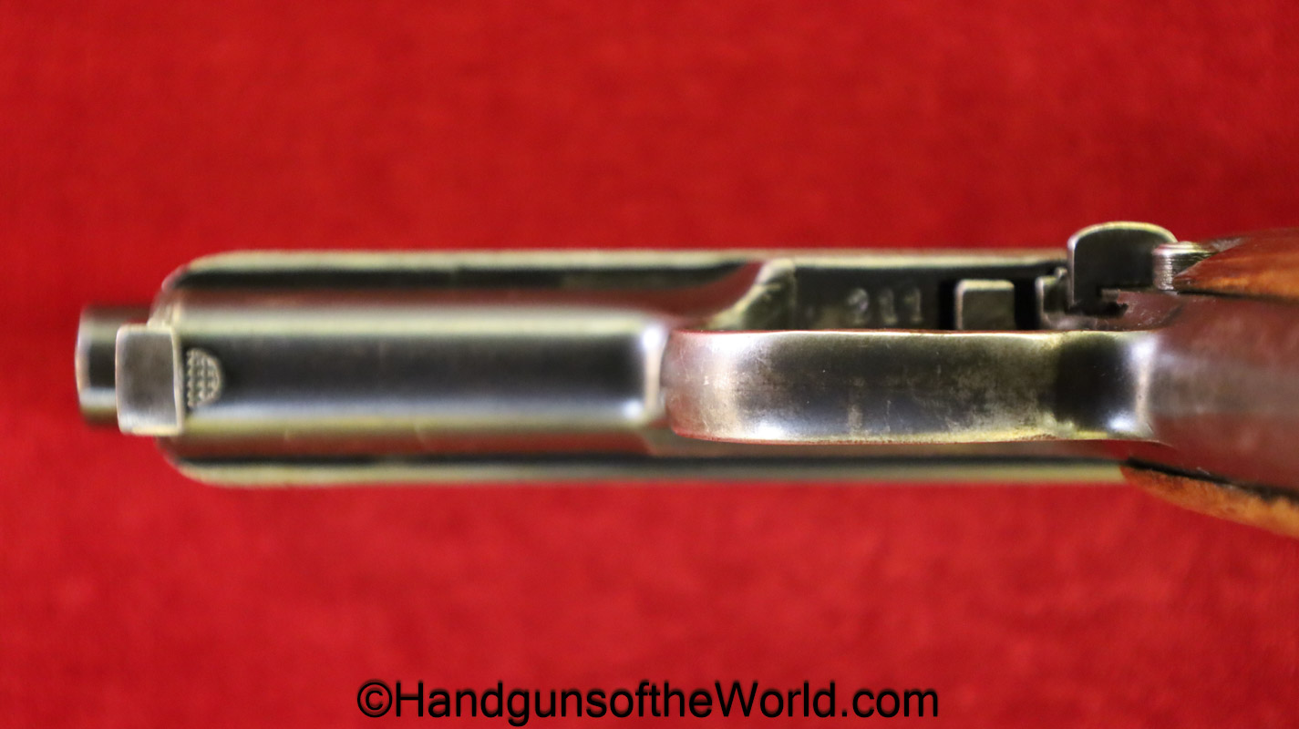 Mauser 1914, 7.65mm. This is German WWI Imperial proofed on top of the slide in front of the rear sight. This has the correct checkered walnut grips and has all matching numbers with an unnumbered barrel. The blue rates about 90% and the bore is G-VG. There is a factory error, as the serial number shows an over-stamp on the rear frame and slide.