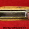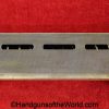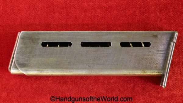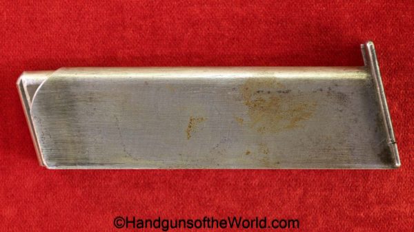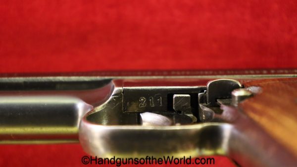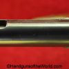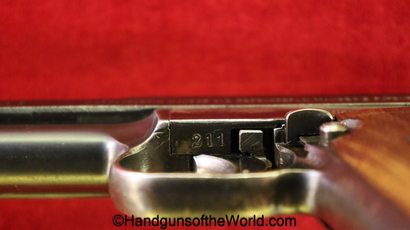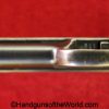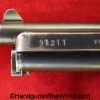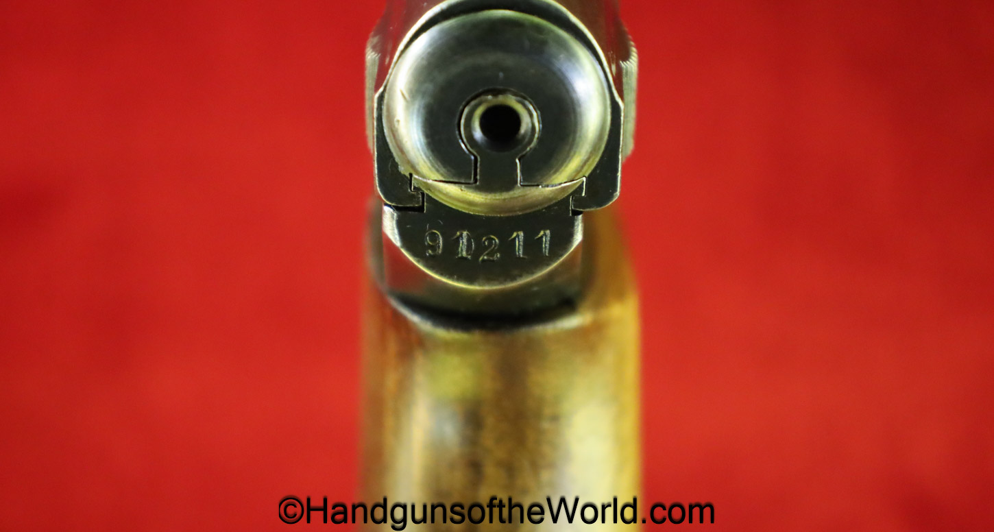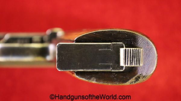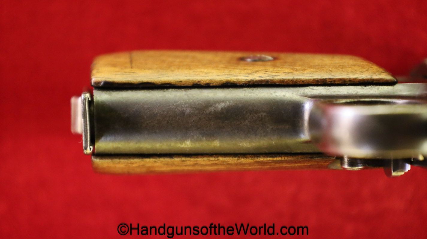 Mauser 1914, 7.65mm. This is German WWI Imperial proofed on top of the slide in front of the rear sight. This has the correct checkered walnut grips and has all matching numbers with an unnumbered barrel. The blue rates about 90% and the bore is G-VG. There is a factory error, as the serial number shows an over-stamp on the rear frame and slide.