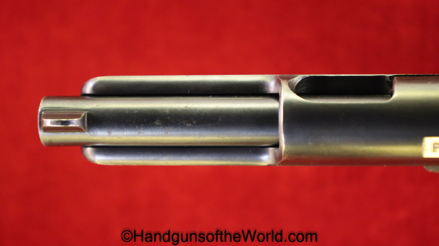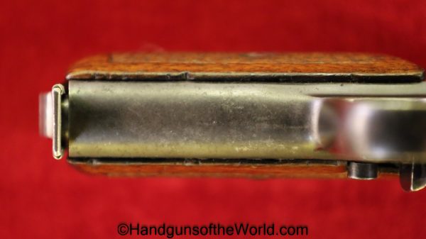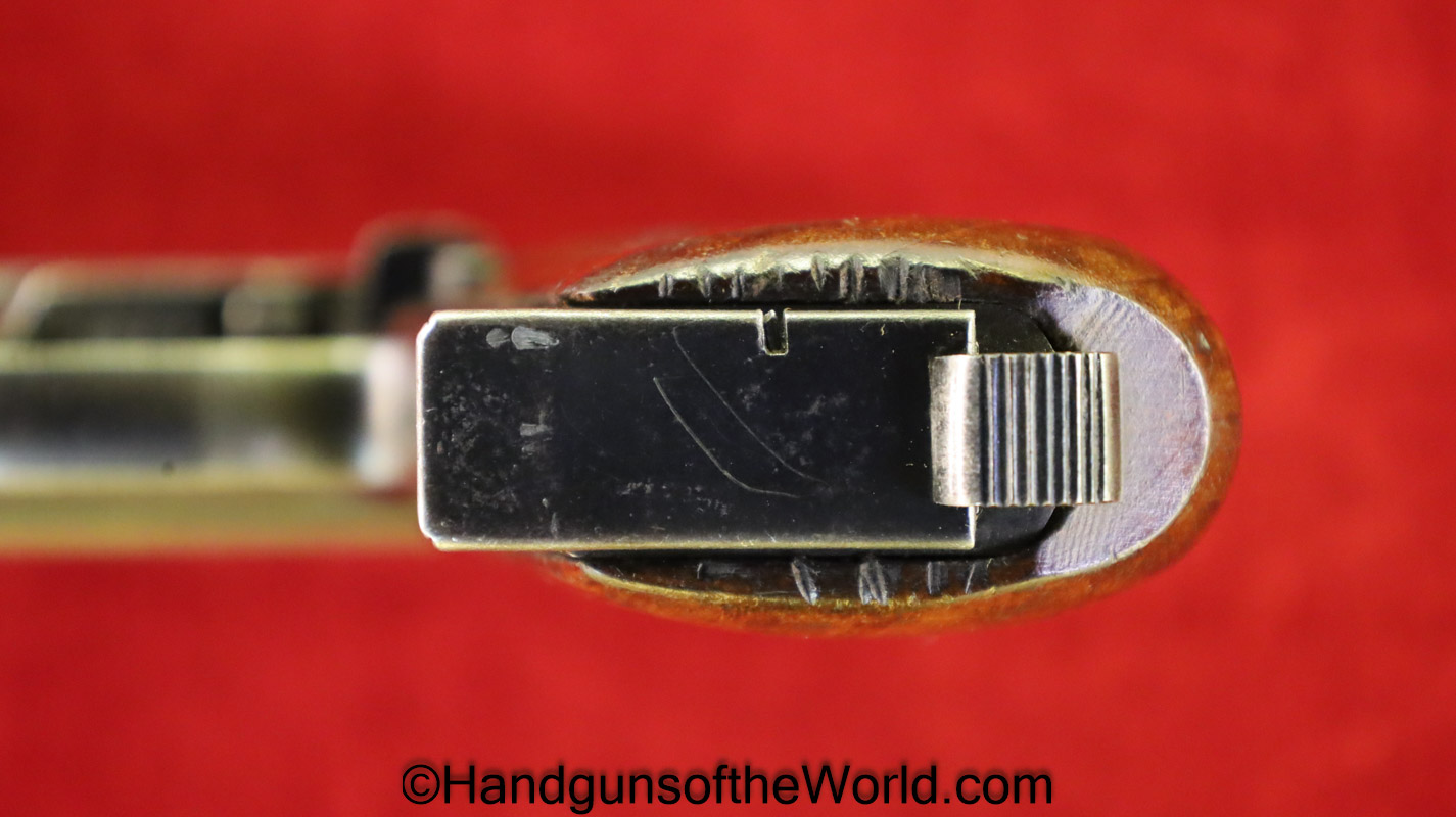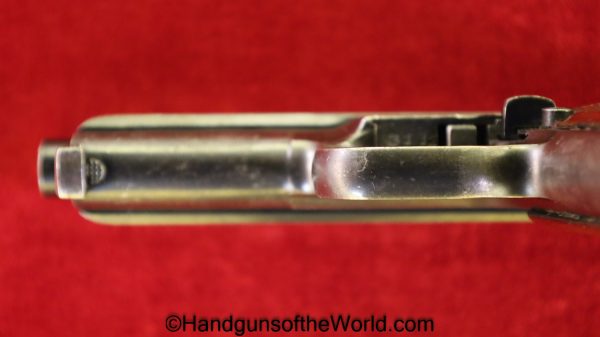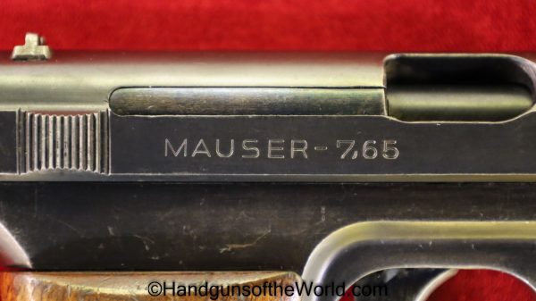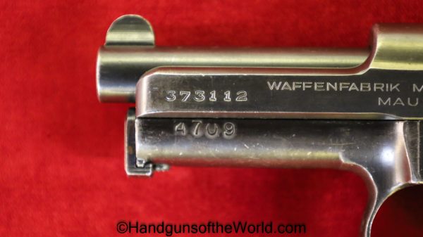 Mauser 1914, 7.65mm. This is a Norwegian Police reissue, marked Politi-Nr 4709 on each side of the Norwegian Coat of Arms in a recessed area on the side of the left slide, and #4709 on the left side of the frame. This has 1 piece checkered walnut grips, and all matching numbers. This has about 92% blue and the bore is VG+. It is estimated that just under 800 were Norwegian Police marked.