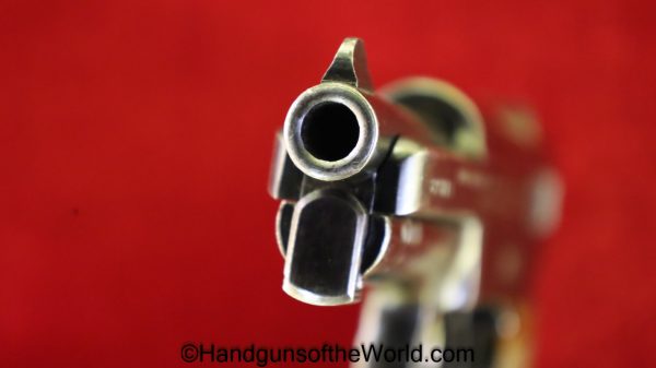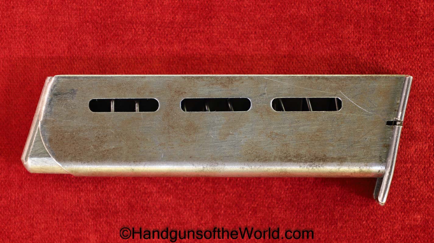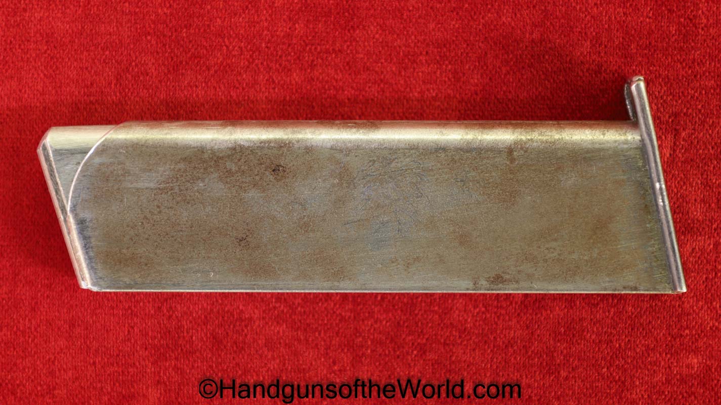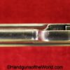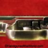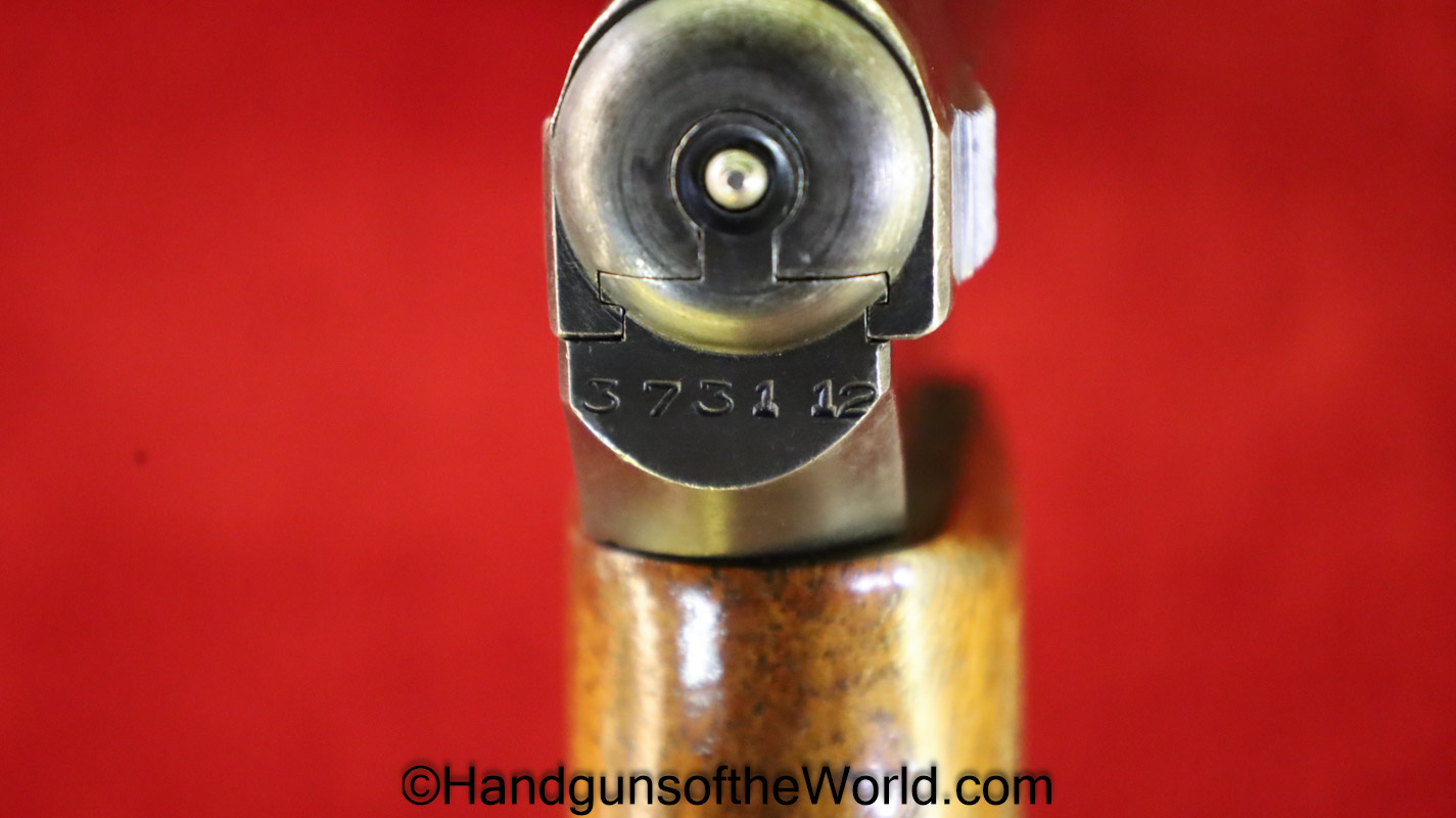 Mauser 1914, 7.65mm. This is a Norwegian Police reissue, marked Politi-Nr 4709 on each side of the Norwegian Coat of Arms in a recessed area on the side of the left slide, and #4709 on the left side of the frame. This has 1 piece checkered walnut grips, and all matching numbers. This has about 92% blue and the bore is VG+. It is estimated that just under 800 were Norwegian Police marked.