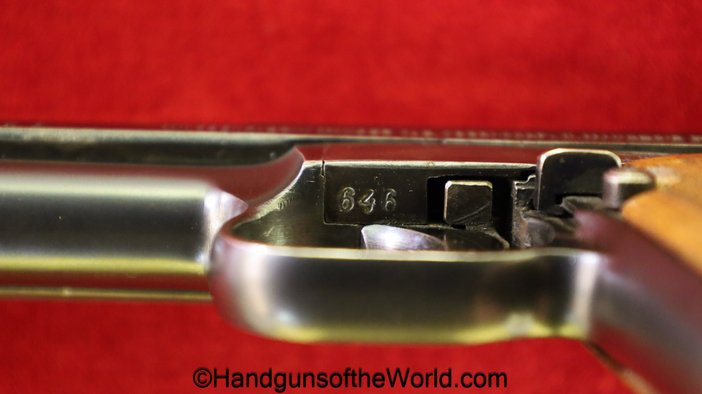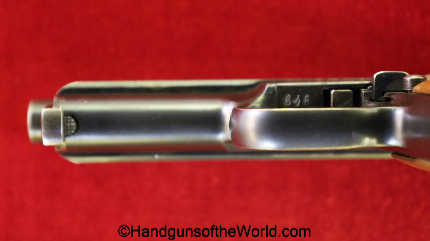 Mauser 1914, 7.65mm. This is German WWI Imperial proofed on top of the slide in front of the rear sight. This has the proper style checkered walnut grips. This has all matching serial numbers with an unnumbered barrel. The blue rates nicely at about 95% and the bore is VG+.