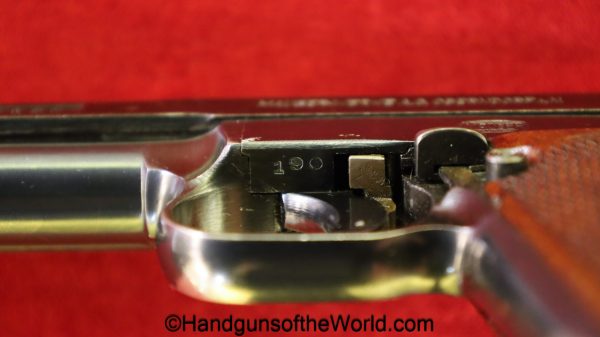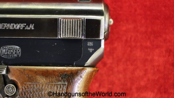 Mauser 1934, 7.65mm. This is German WWII Army Eagle 655 proofed on the left rear tang. This has the correct checkered walnut grips, and all matching numbers. The blue rates about