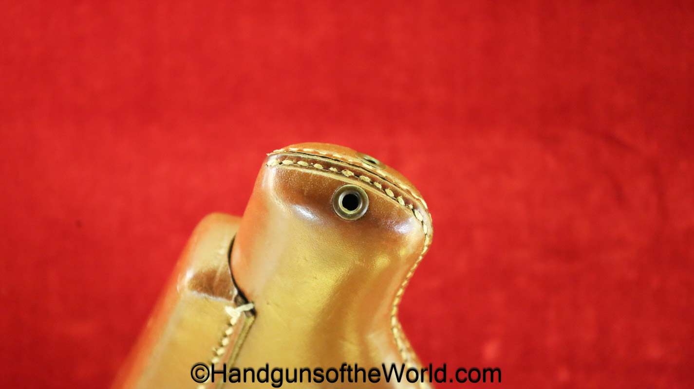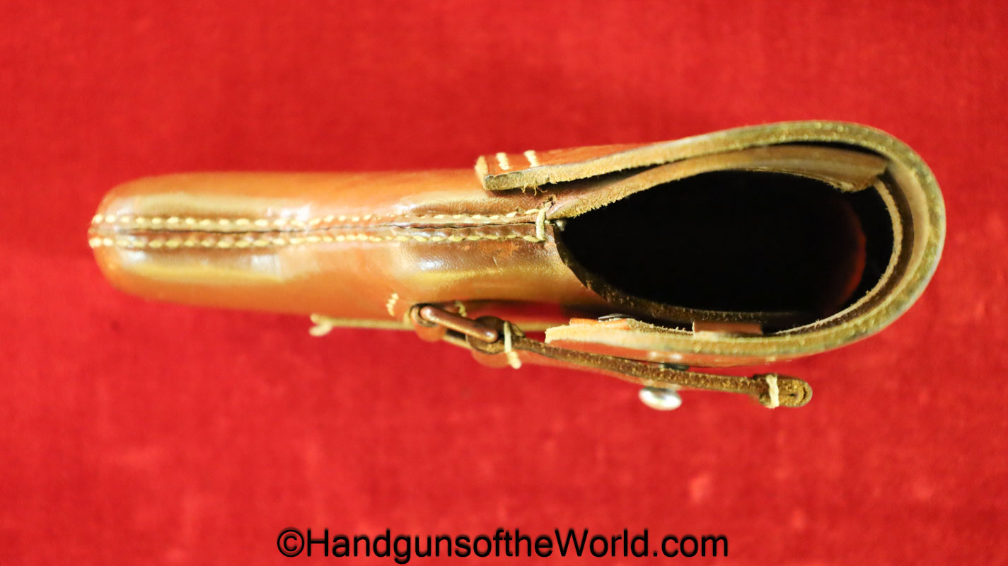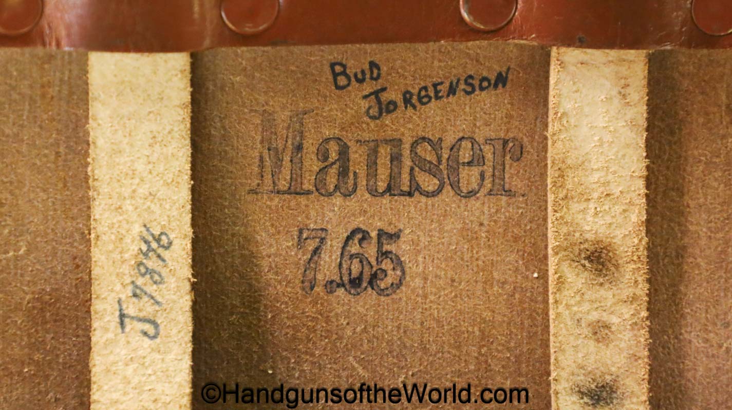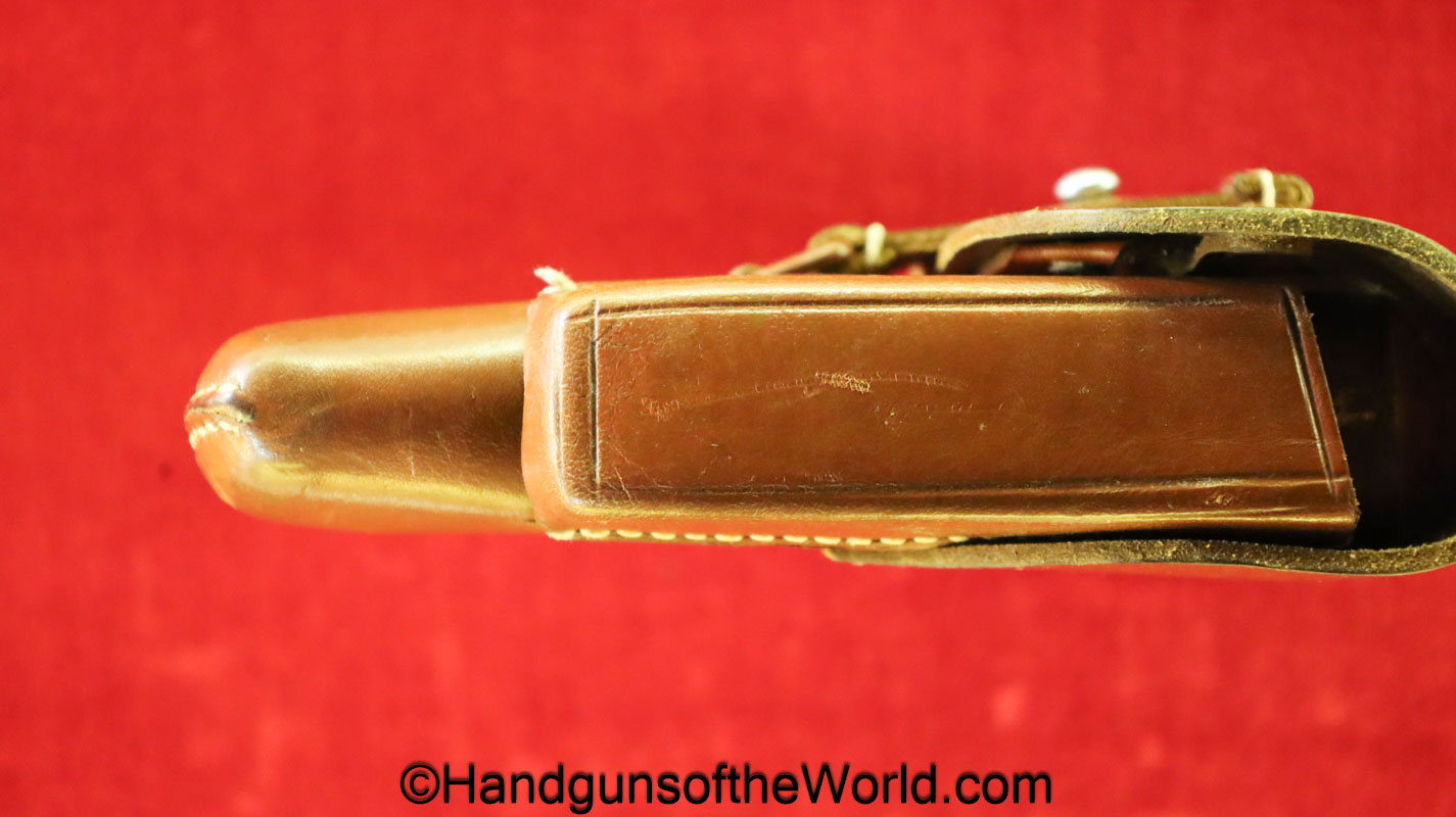 Original Mauser 1934 Pistol Holster. Brown leather, Theuermann Dropping pattern. Maker marked Theuermann DRP-695930 & Akah crossed rifles logo. This is ink stamped Mauser 7.65 inside. Overall Mint-the best I have seen.