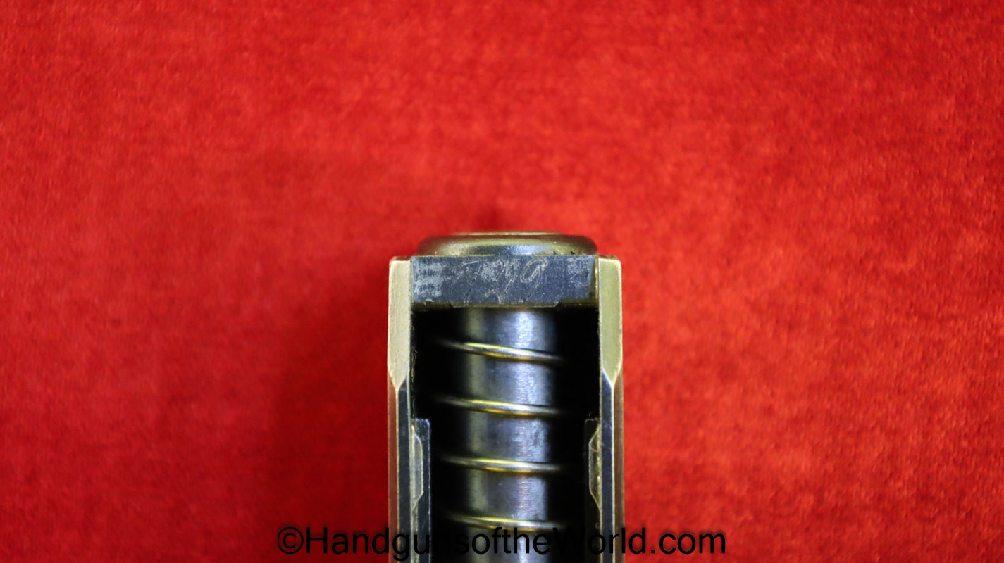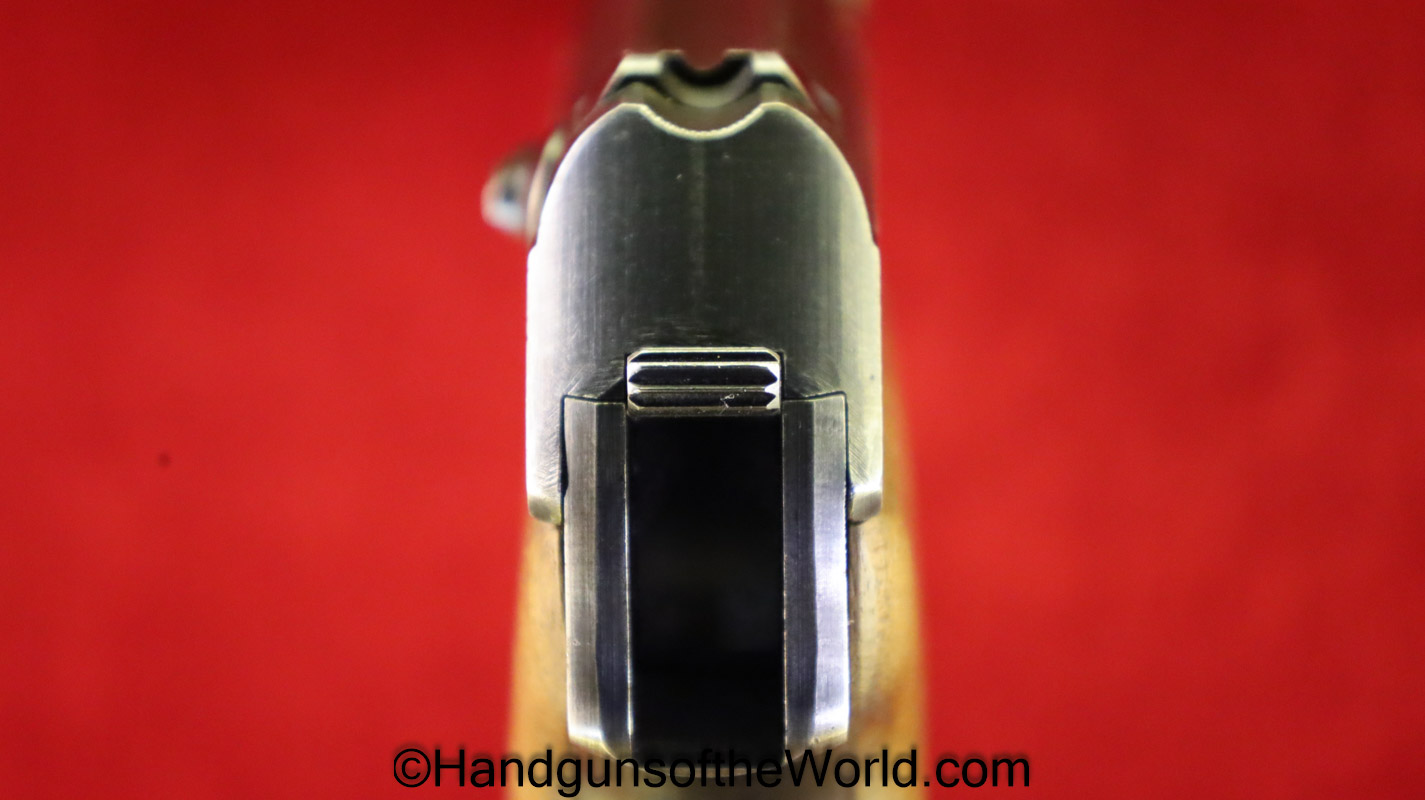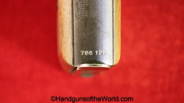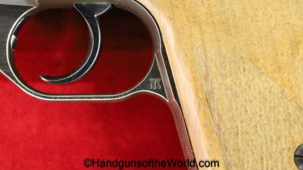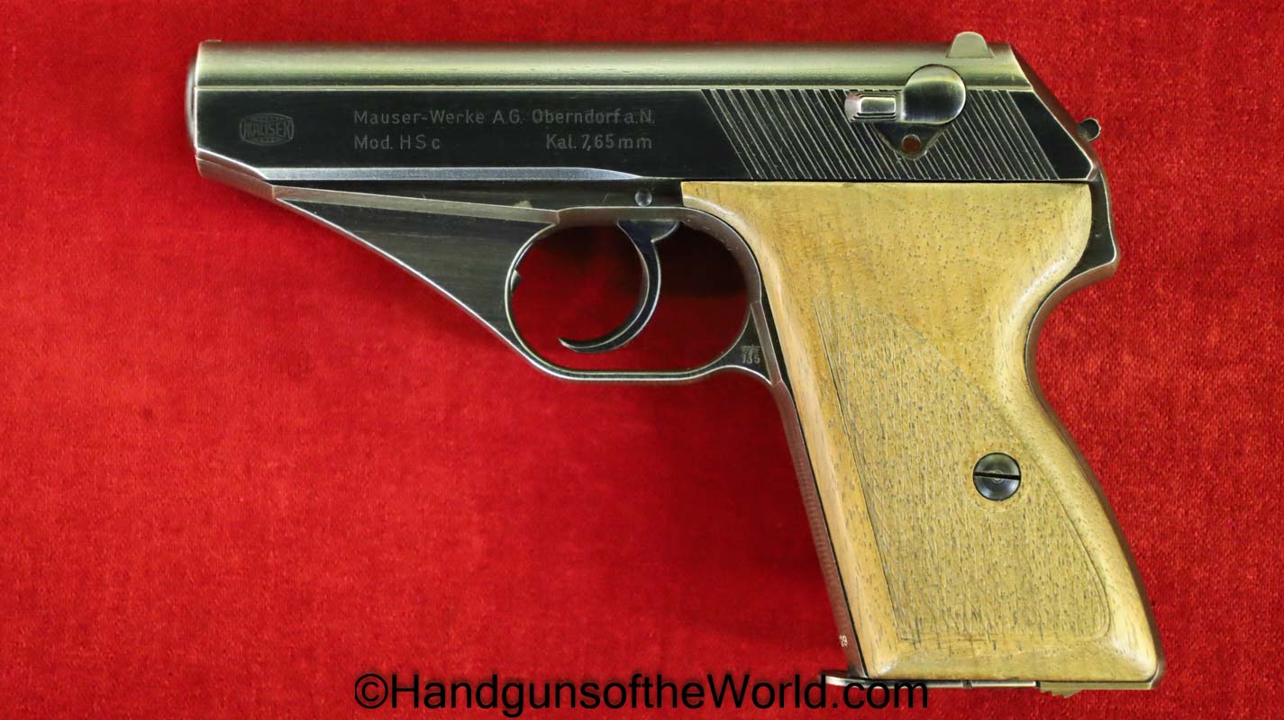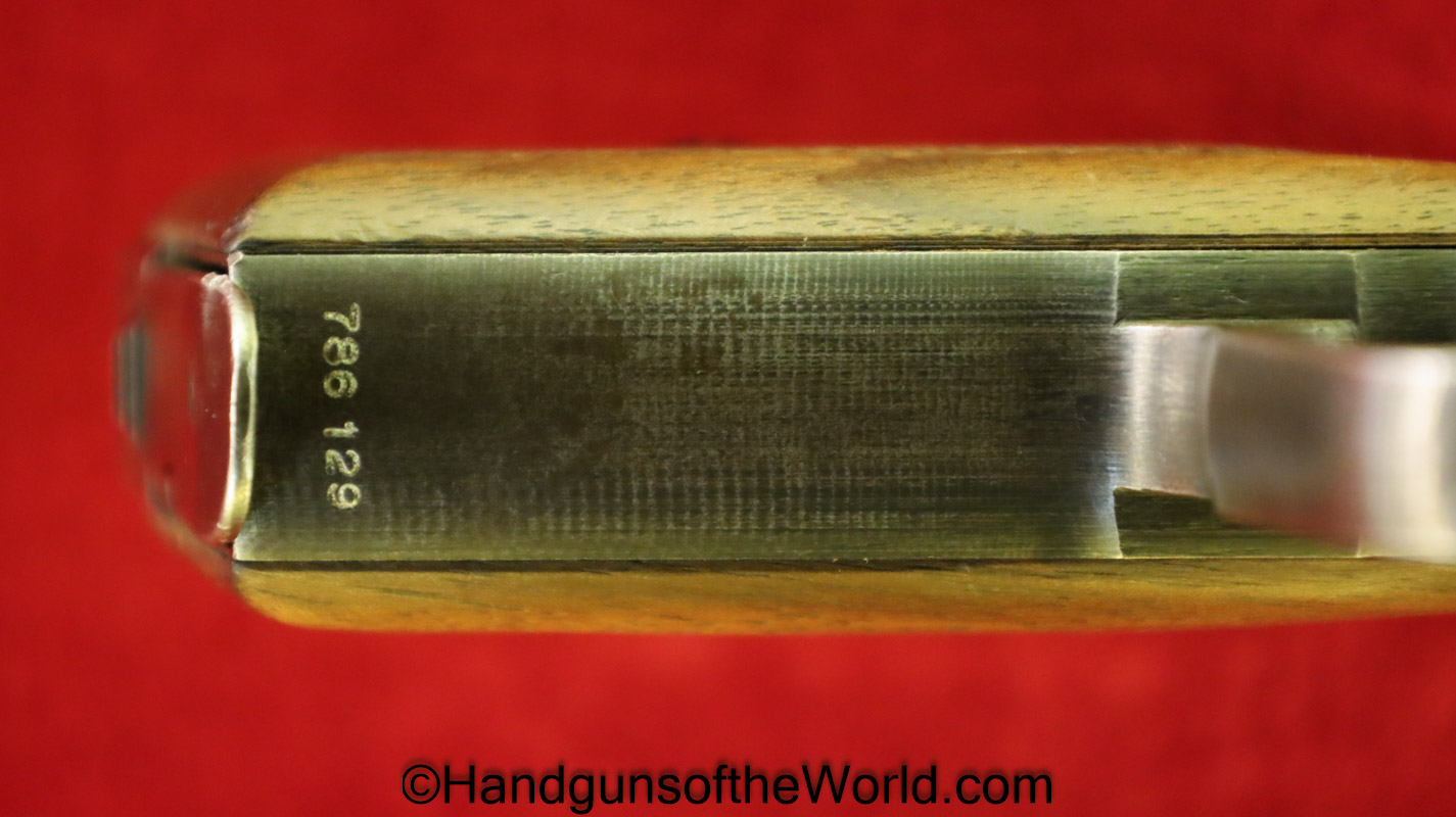 Mauser HSc, 7.65mm. This is German WWII Eagle 135 proofed on the left trigger guard. This has the early features to include a matted top strap, lanyard loop and checkered walnut grips. This has all matching numbers with an unnumbered barrel. The blue rates about 92% and the bore is excellent.