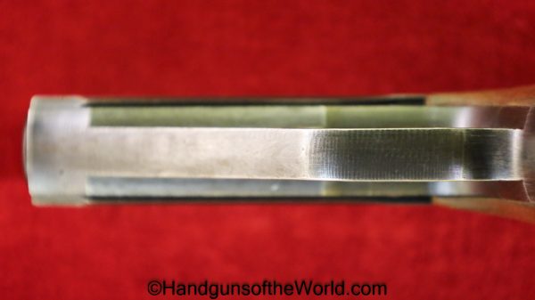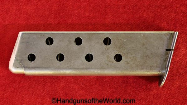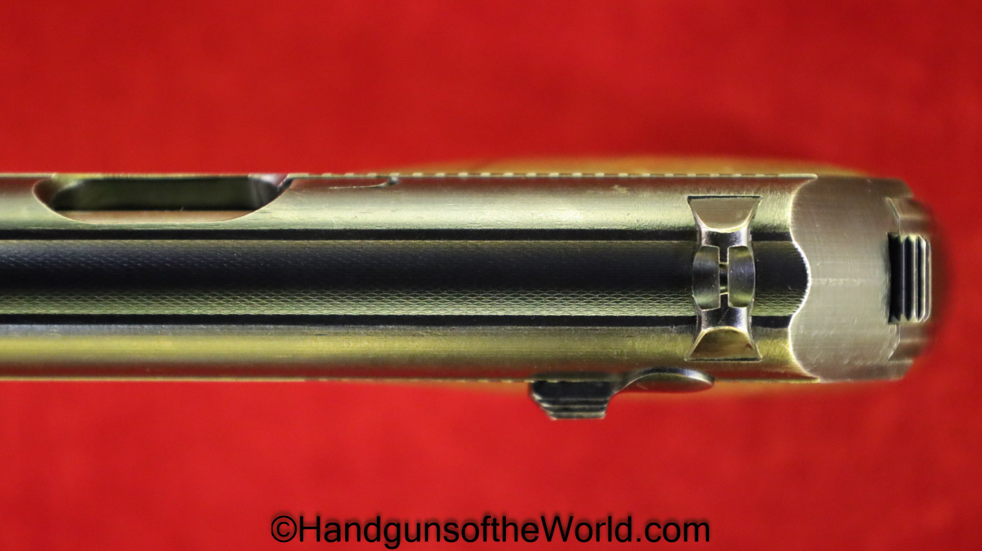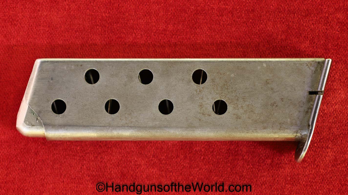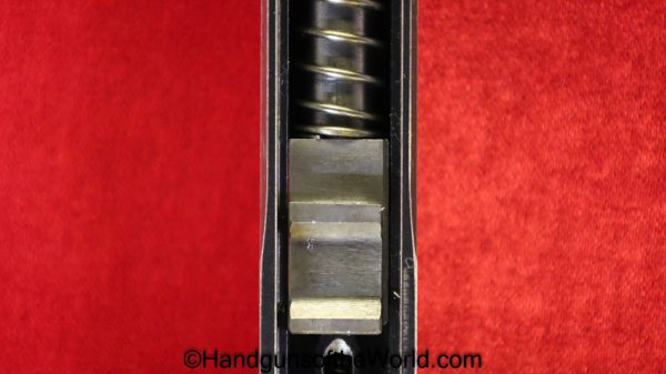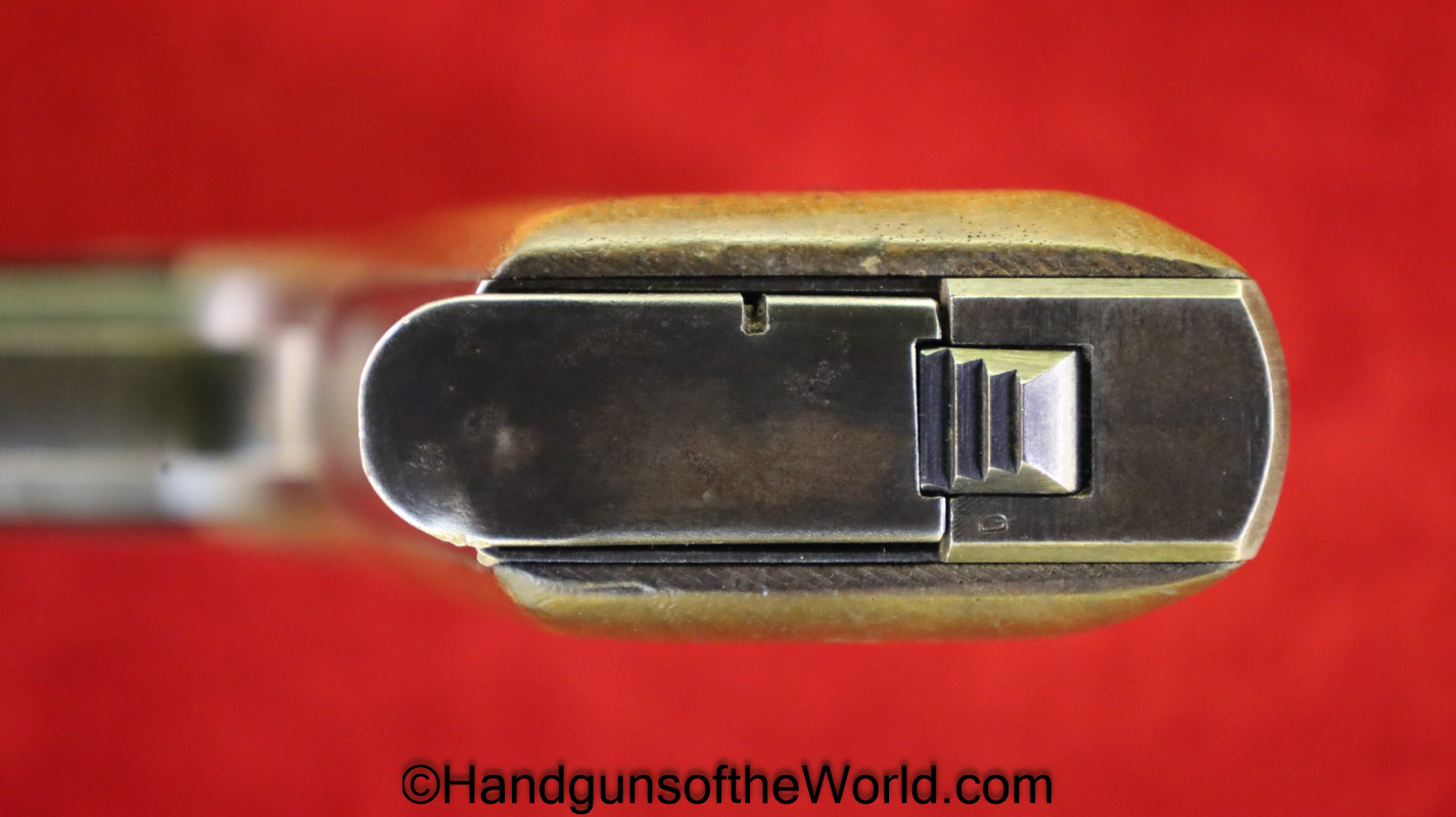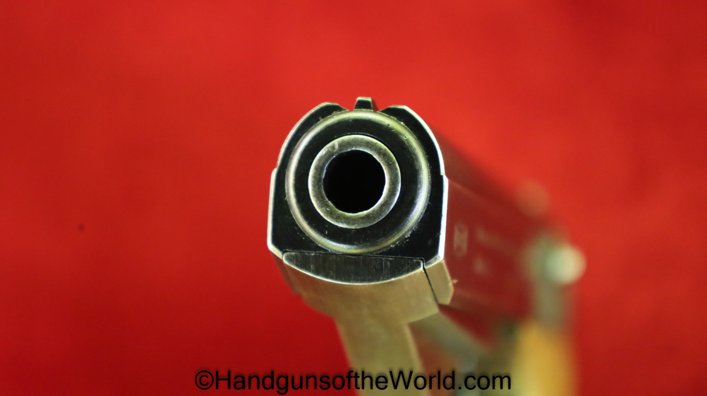 Mauser HSc, 7.65mm. This is German WWII Eagle 135 proofed on the left trigger guard. This has the early features to include a matted top strap, lanyard loop and checkered walnut grips. This has all matching numbers with an unnumbered barrel. The blue rates about 92% and the bore is excellent.