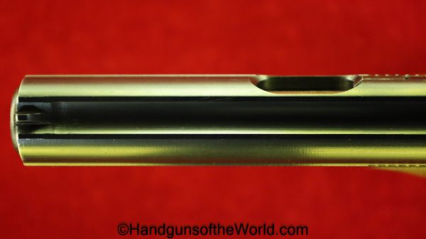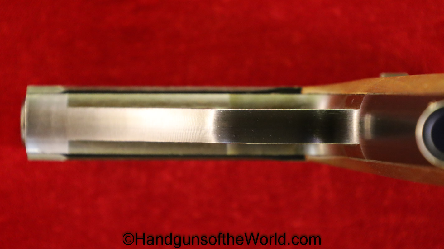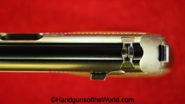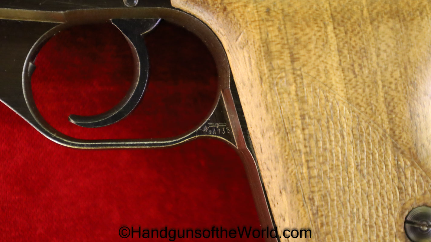 Mauser HSc, 7.65mm. This is Late War Nazi WaA135 proofed on the left trigger guard. This has the late 3 lines slide address and excellent checkered walnut grips. Mint 99+% blue and an excellent bore. Outstanding.