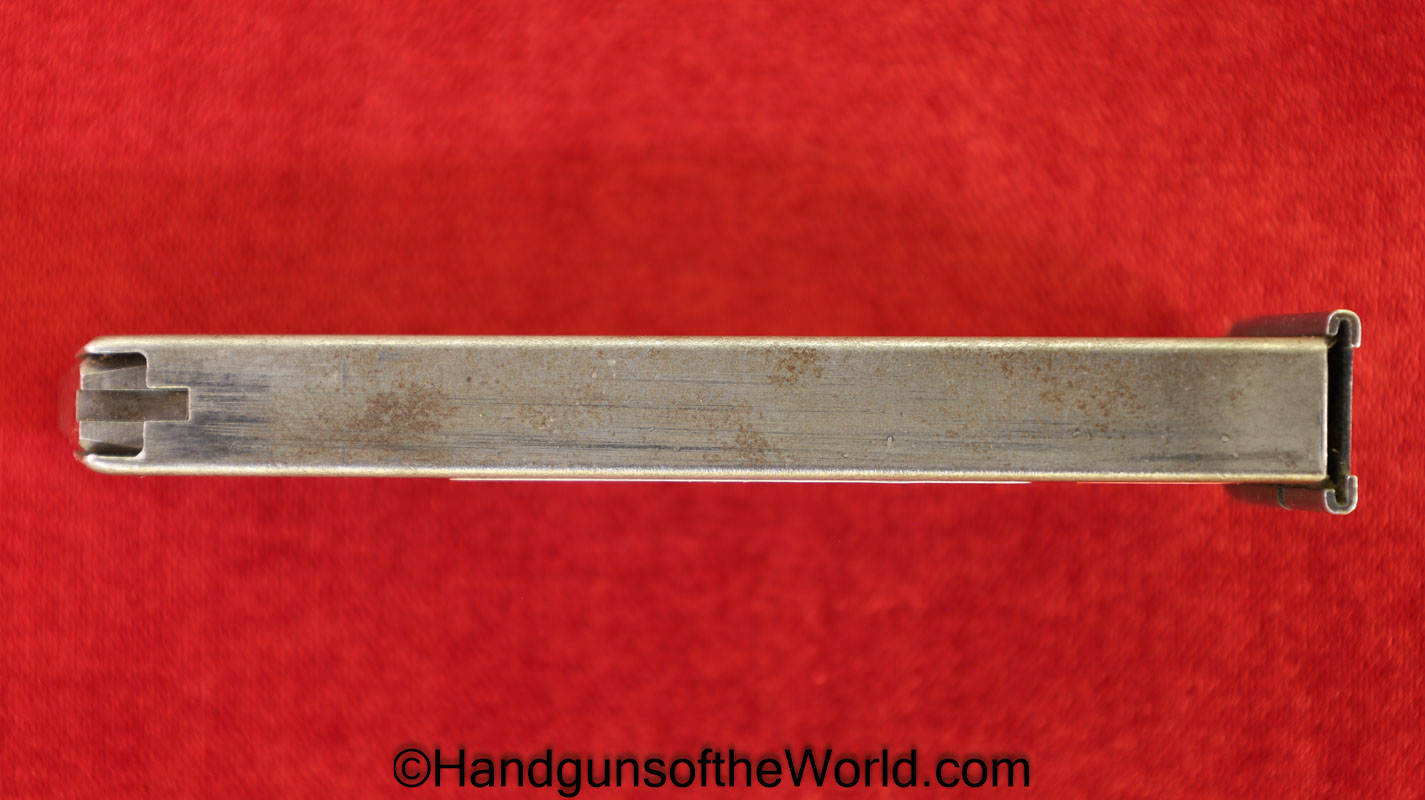 Original Mauser HSc, 7.65mm Pistol Magazine. This is an early WWII era variant with the Mauser banner on the base. About 95% blue remains.