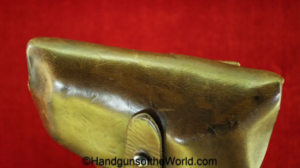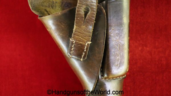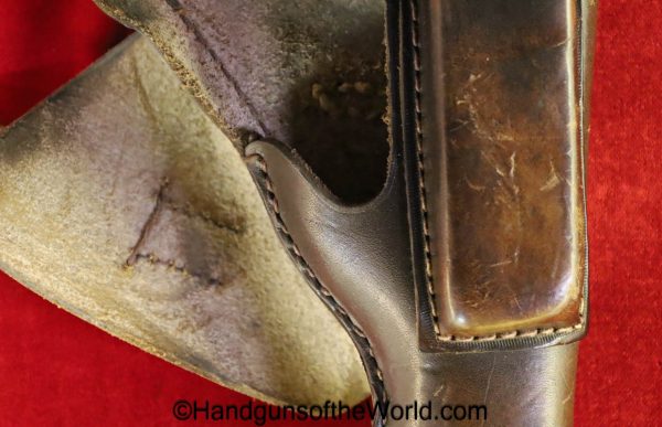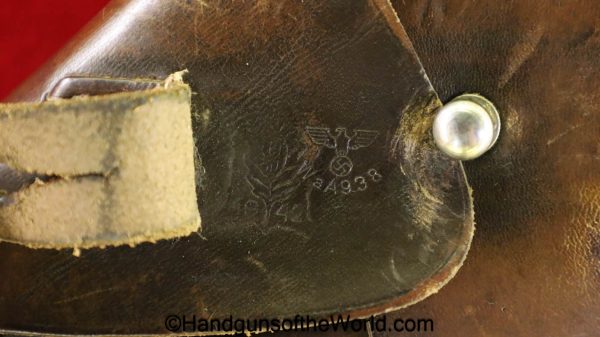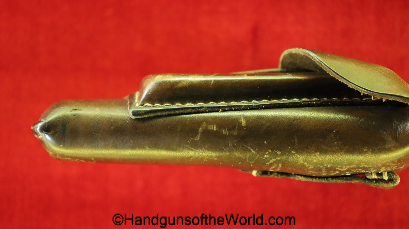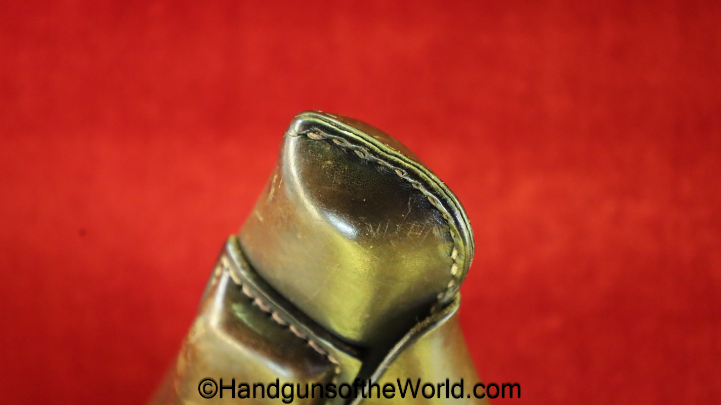 Original Mauser HSc Pistol Holster. This is a brown leather breakaway marked with the Akah Oakleaf-9 logo & German WaA938 under the tab. This is also ink stamped Mauser 7.65 inside. Overall VG.