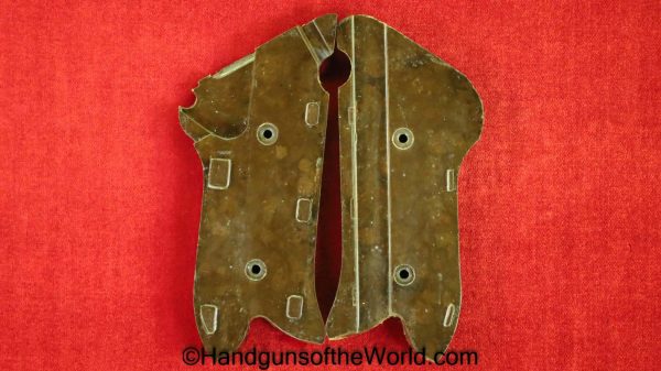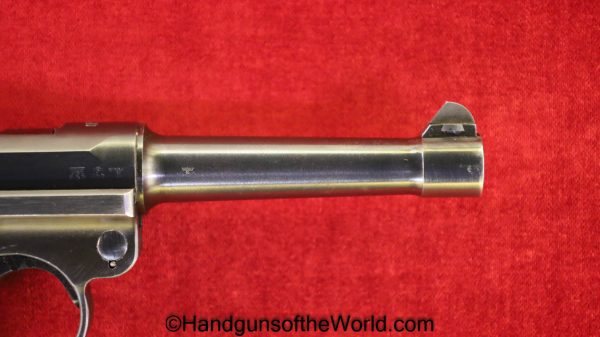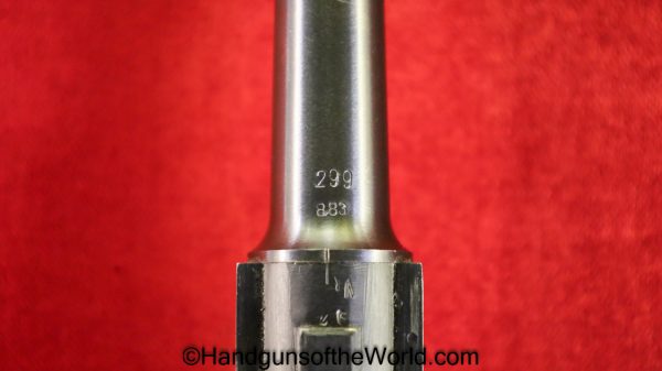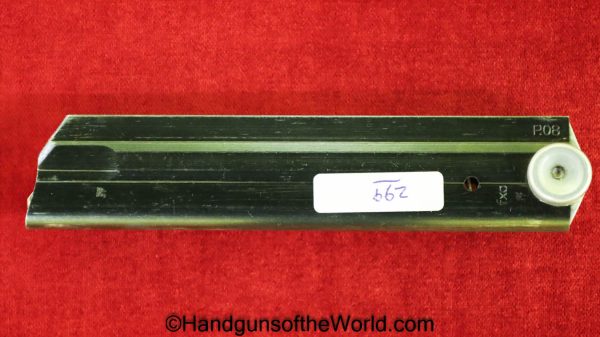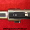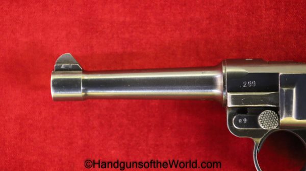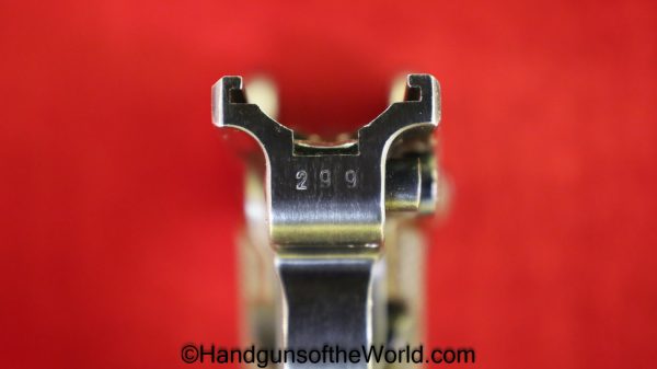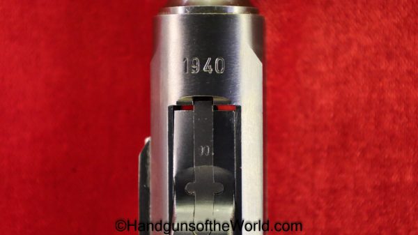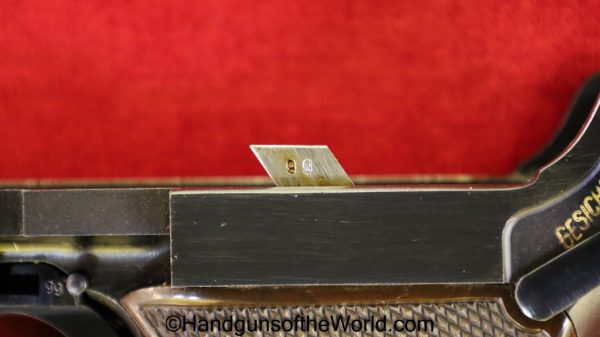 Mauser P.08 Luger, 42-1940, 9mm. This is German WWII Eagle 655 proofed on the right receiver. This has the rare brown Krieghoff Bakelite grips, found on some of these in 1940. This has all matching numbers with an unnumbered firing pin, and the magazine is from a different gun. The blue rates 99% and the bore is Excellent.