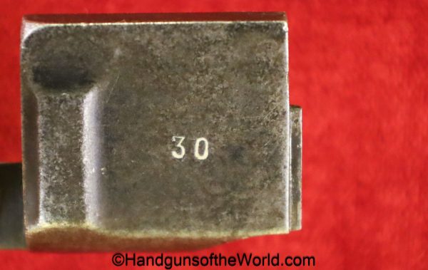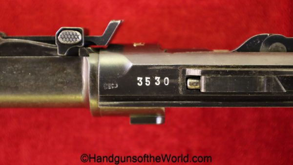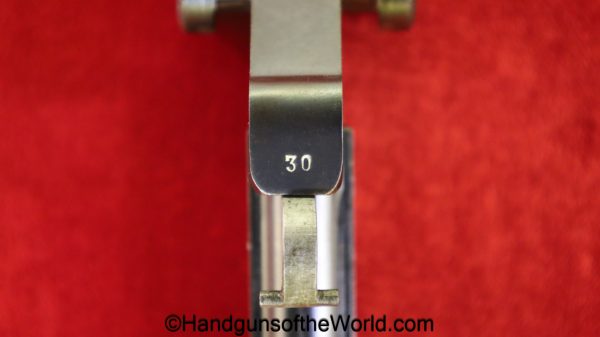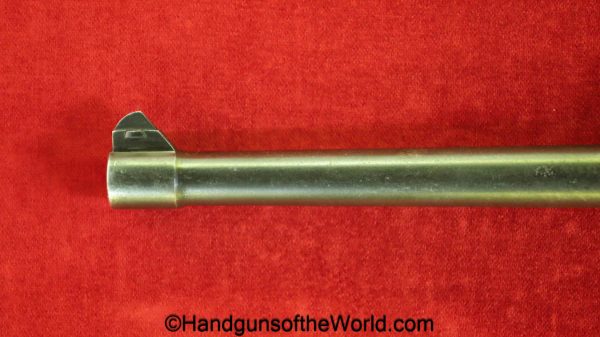Mauser P.08 Luger, 9mm, 1936 Siamese Police Contract with 8″ Barrel. This has checkered walnut grips from another gun as well as the rear sight but is otherwise all matching. This retains about 30% blue and has a VG-VG+ bore. Only 100 were produced with the 8″ barrel.