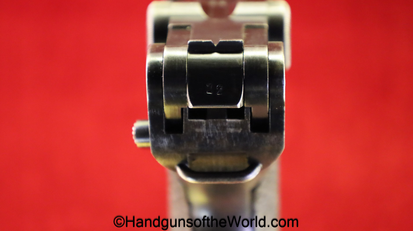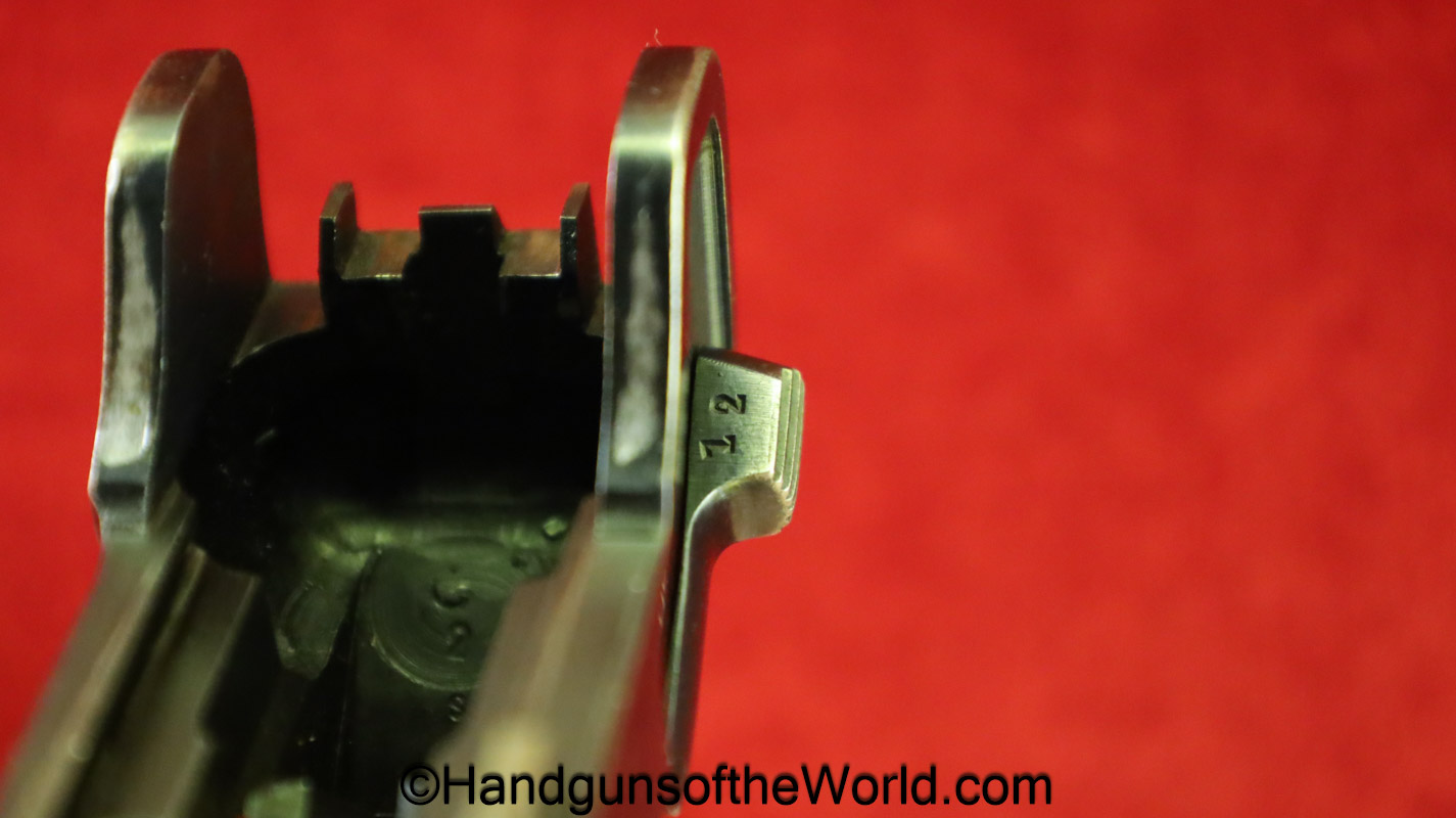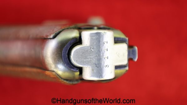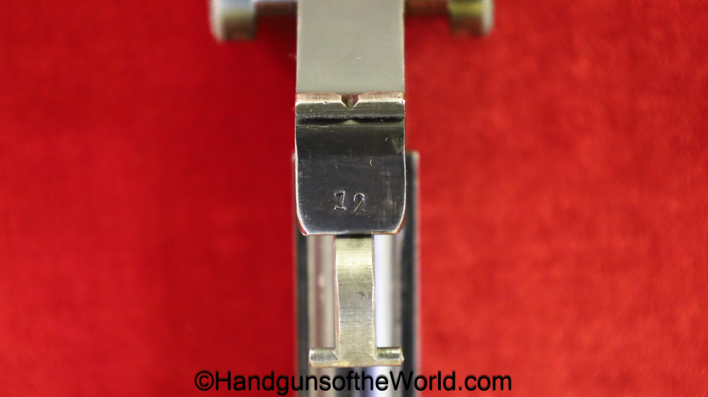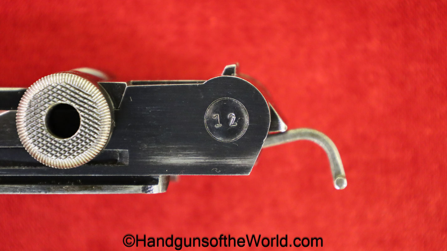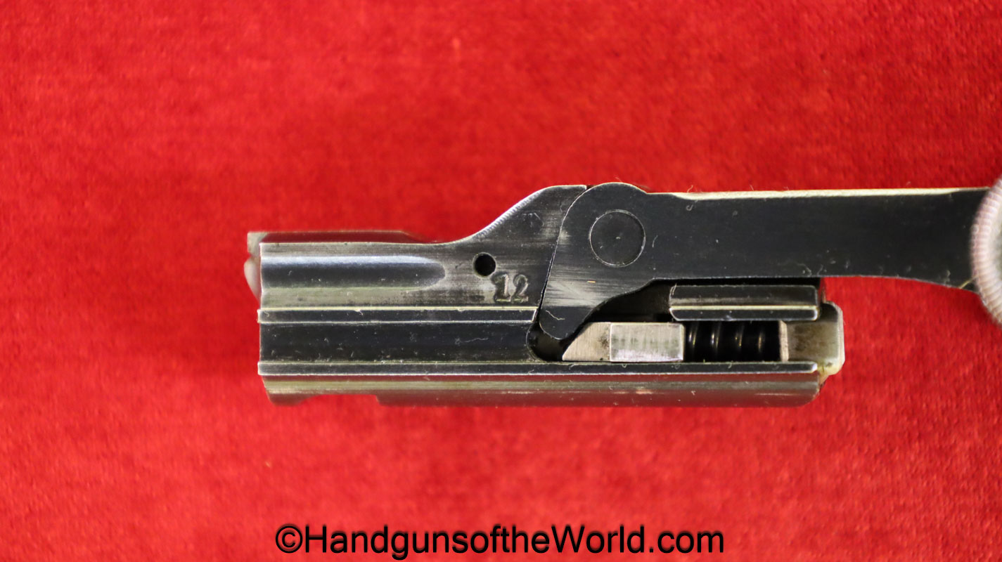 Mauser P.08 Luger, S/42-1937, 9mm. This is a 2nd variation with blue small parts. this has the proper checkered walnut grips. This is German WWII Eagle 63 proofed on the right side of the receiver. This has all matching numbers, but for the correct aluminum base magazine. The blue rates about 90% and the bore is VG+.