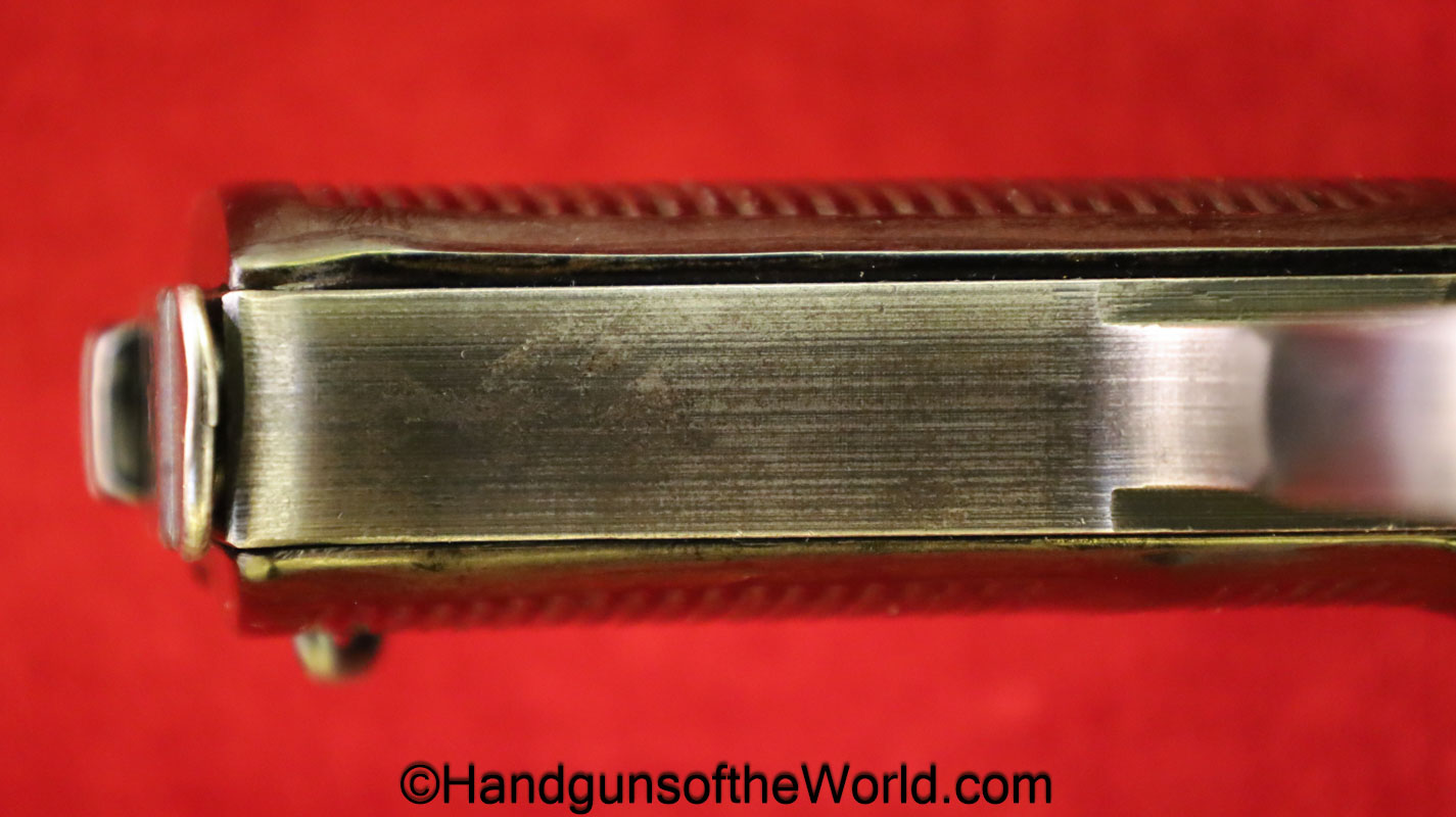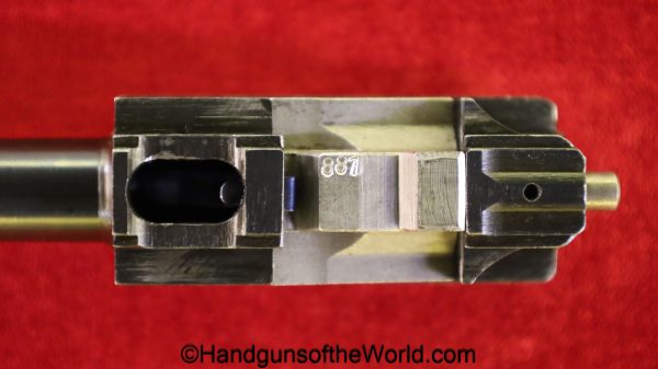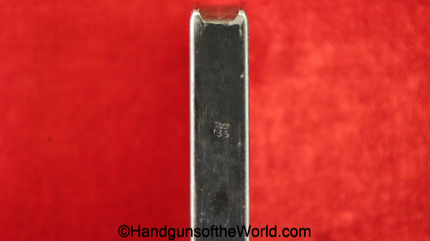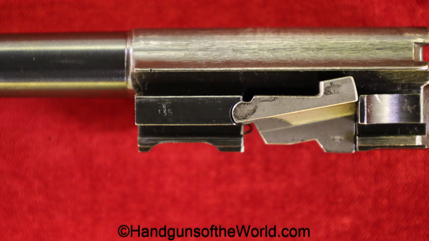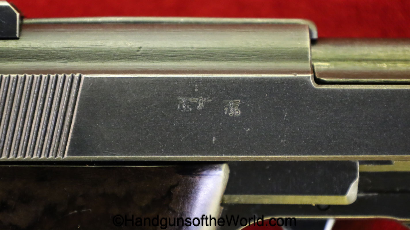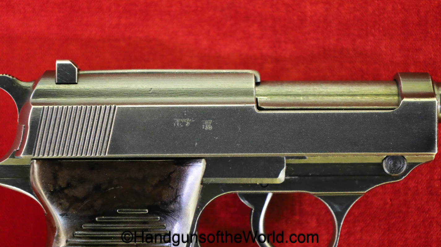 Mauser P-38, BYF42, 9mm. This is German WWII Eagle 135 proofed on the frame, slide and barrel and locking block. This has the correct dark brown Bakelite grips. This has all matching numbers, no importer markings, about 95% blue and the bore is VG.