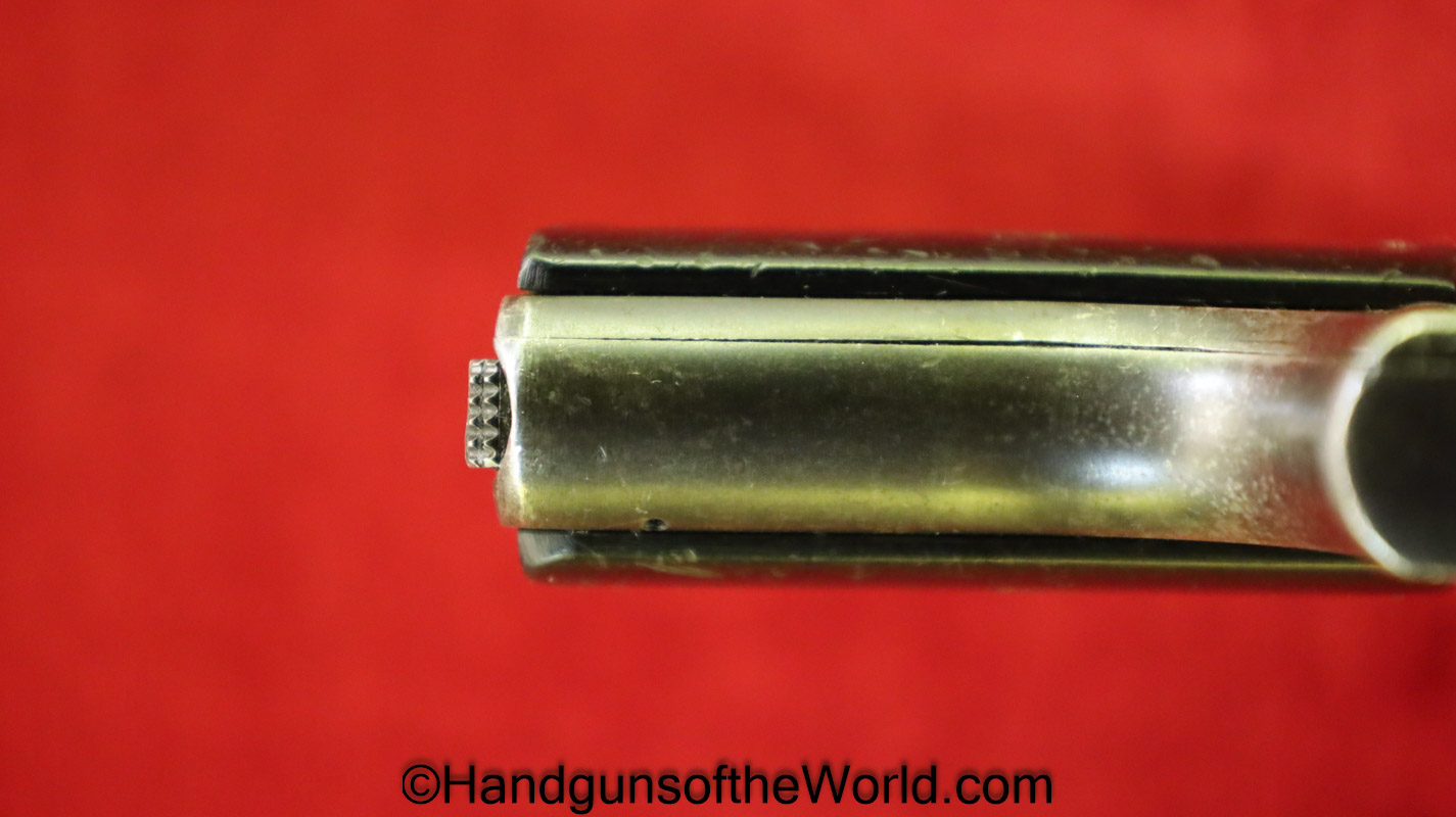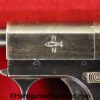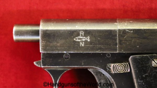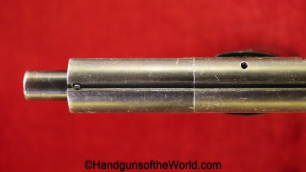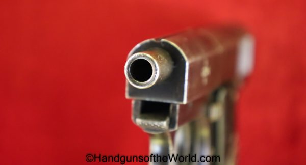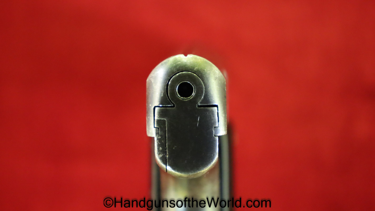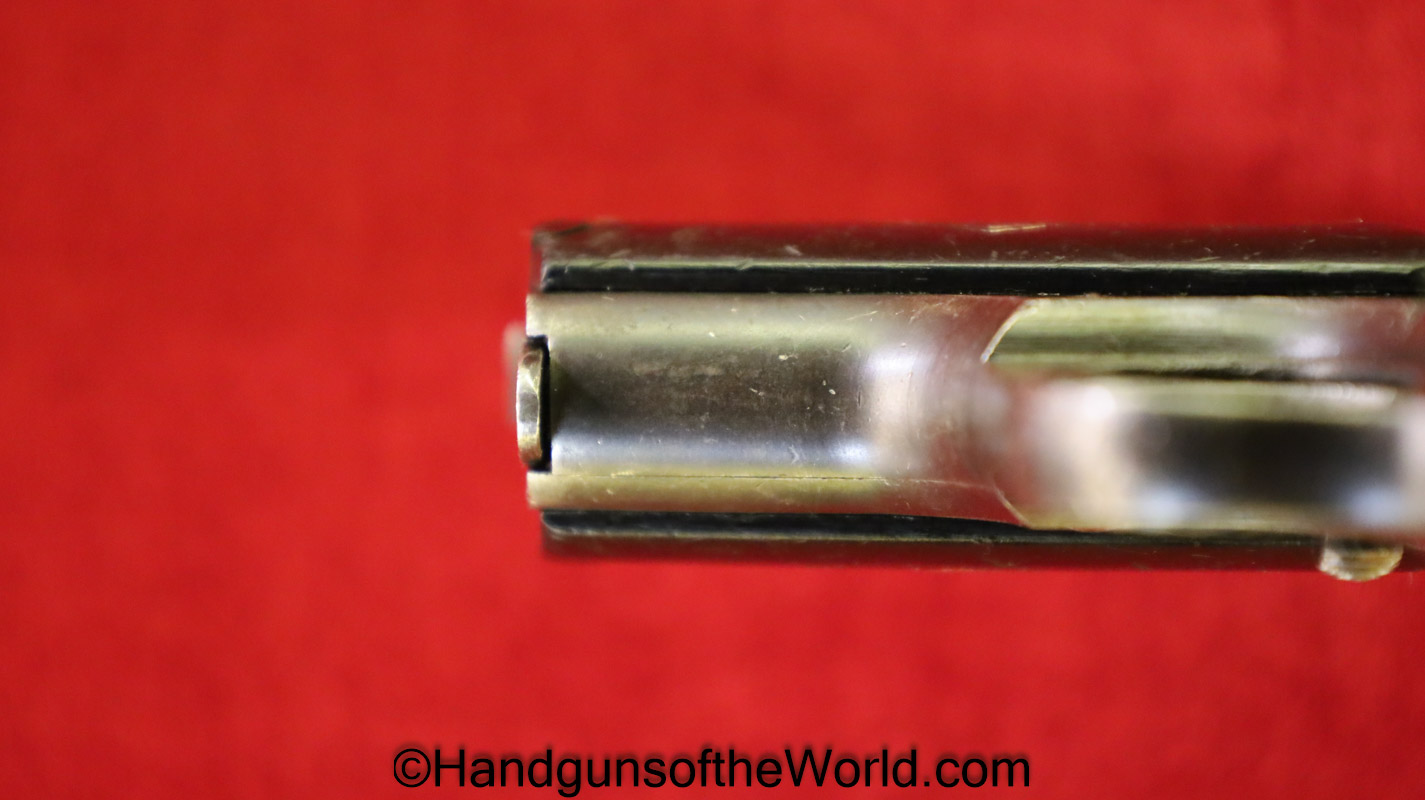 Mayor Arquebusier, 6.35mm. This has RN logo cracked, black Bakelite grips. This has a quick release barrel. The blue rates about 85% and a shiny VG+ bore.