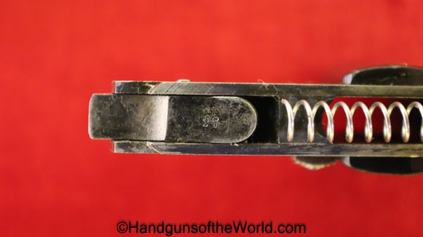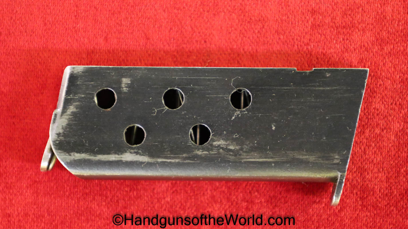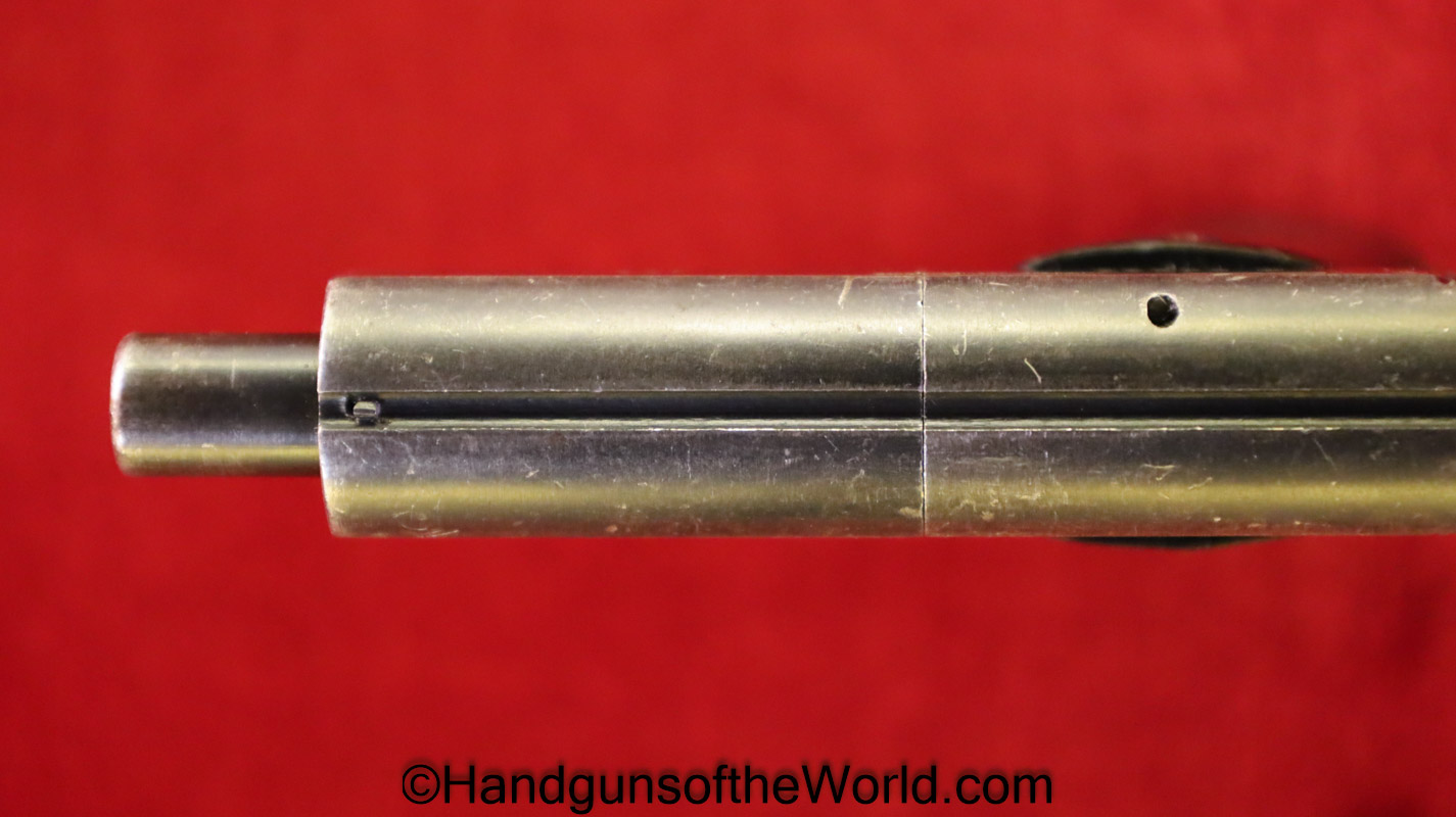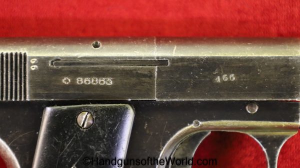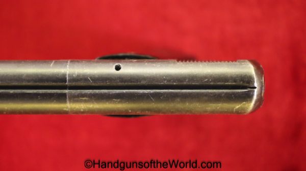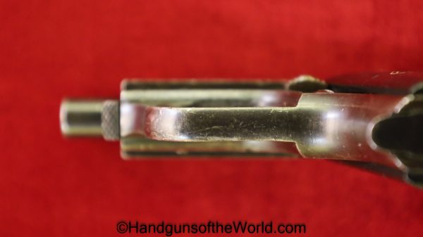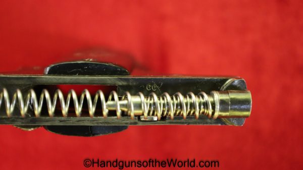 Mayor Arquebusier, 6.35mm. This has RN logo cracked, black Bakelite grips. This has a quick release barrel. The blue rates about 85% and a shiny VG+ bore.