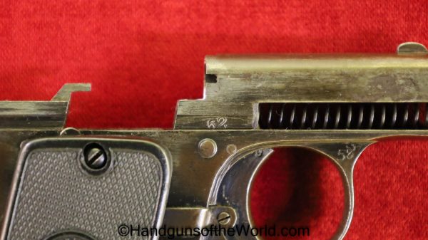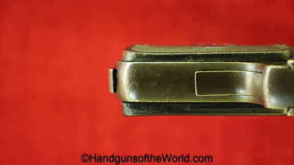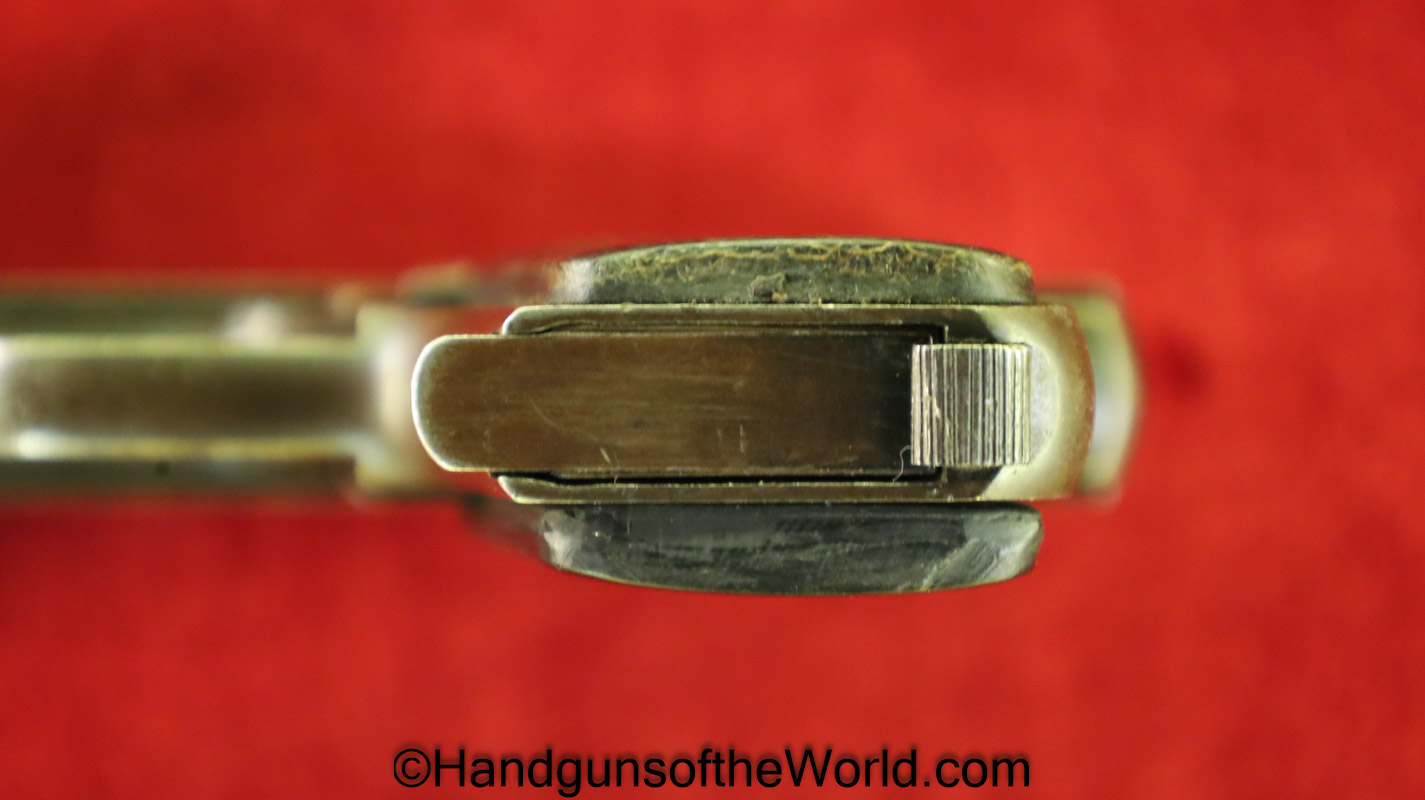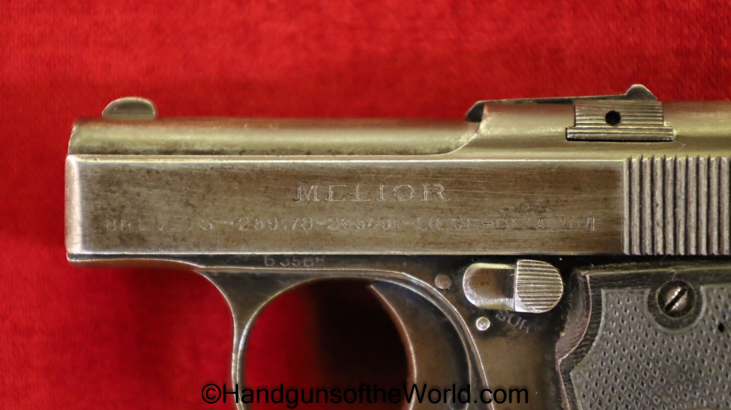 Melior Vest Pocket, 6.35mm. The right grips is a proper style replacement. There is a patina overall and the bore is G-VG.