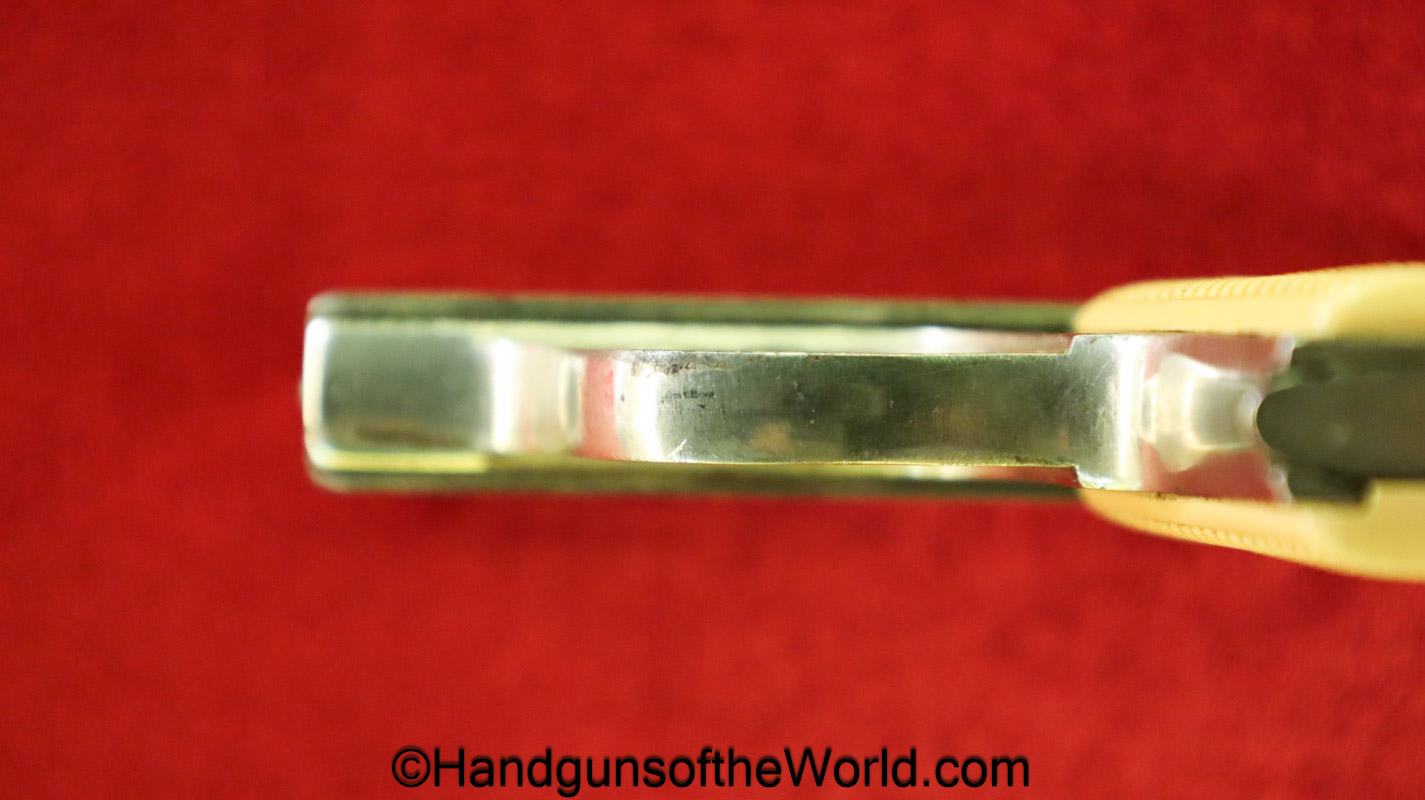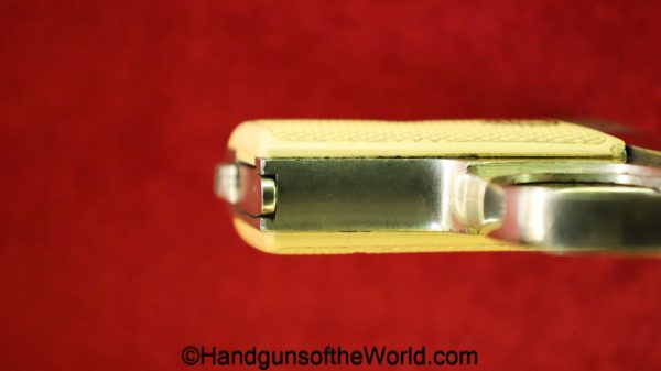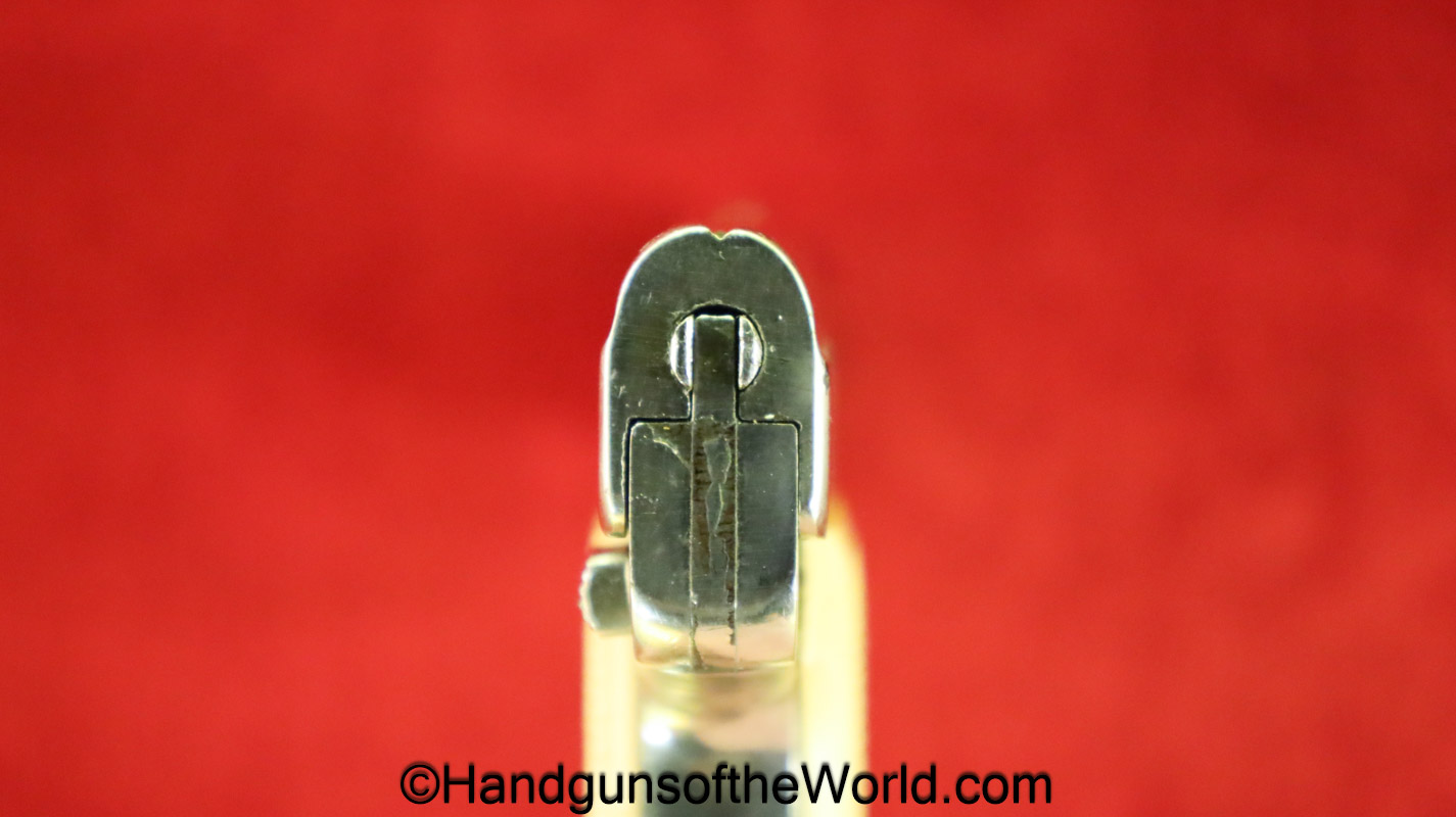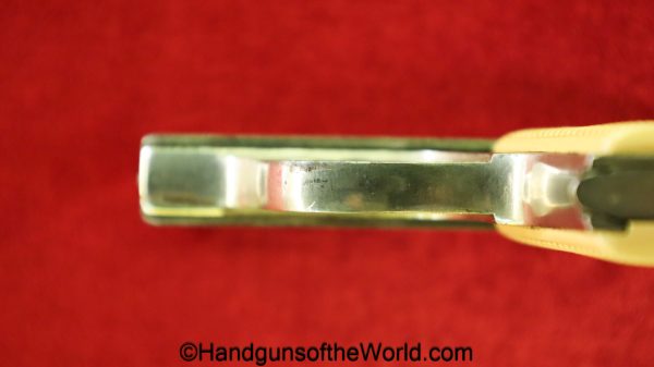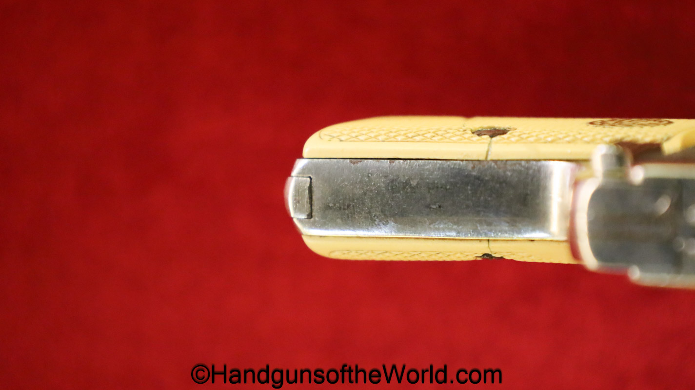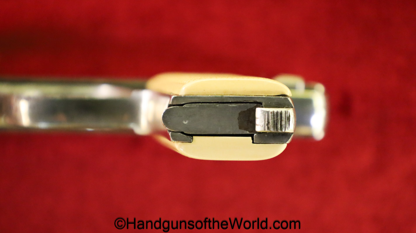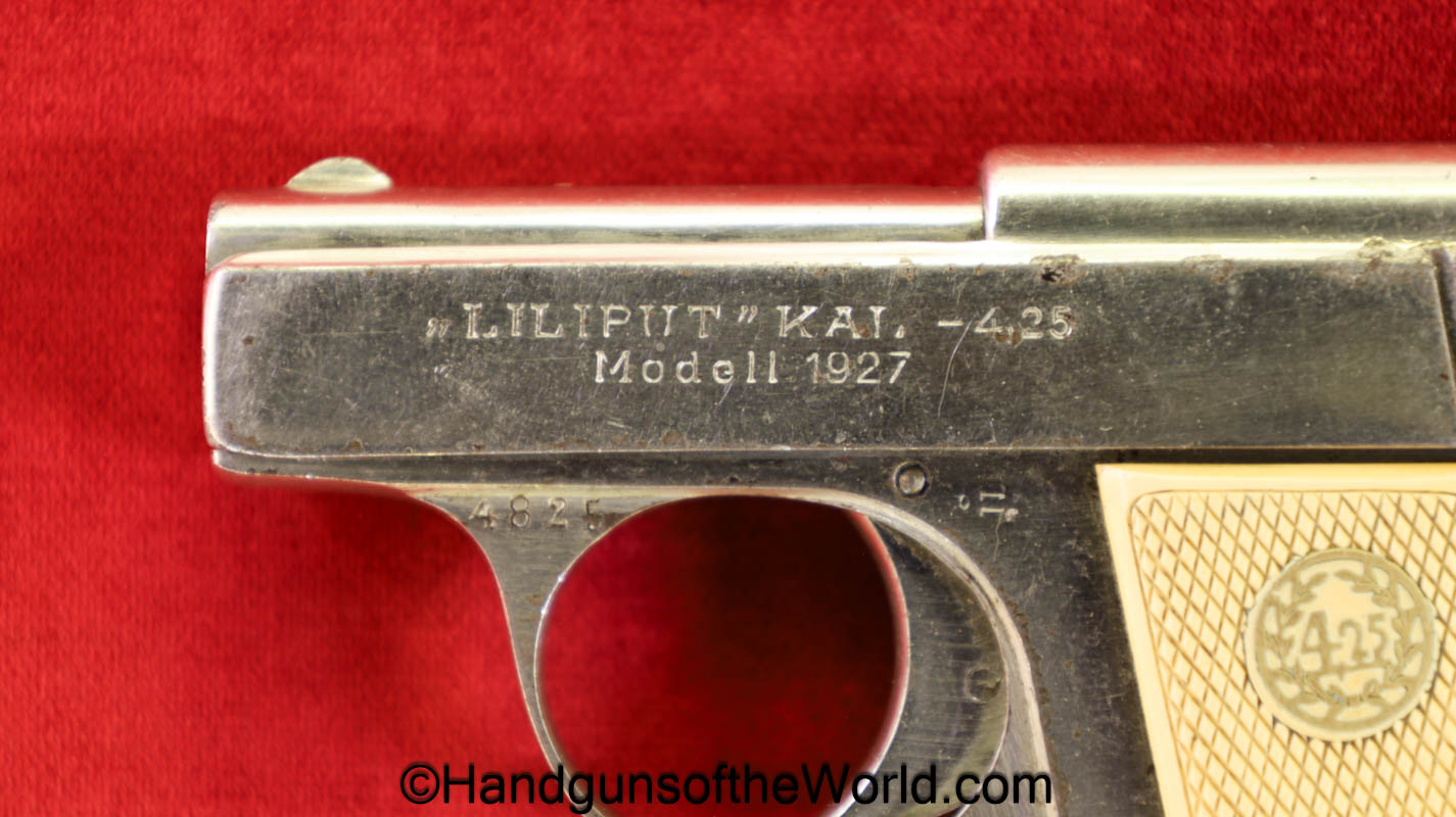 Menz Liliput Model 1927, 4.25mm. This has off-white Ivory Look grips with the brass medallions-Left panel shows a crack. The factory nickel rates about 92% and the bore is VG+. This has its matching number magazine.