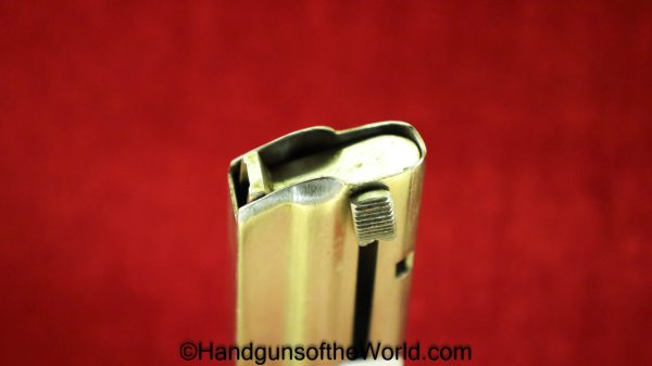 Original Japanese Type 14, 8mm Pistol Magazine. No retainer cut out on the front, and #175 on the spine. About 95% nickel remains.