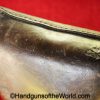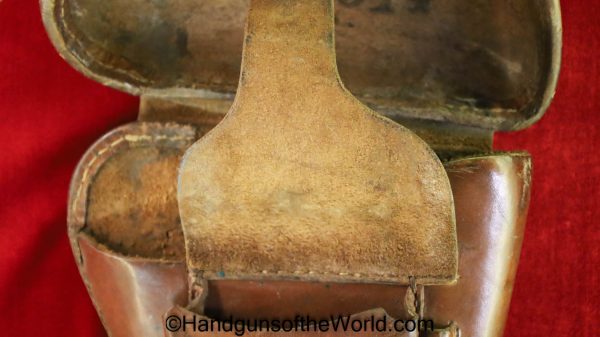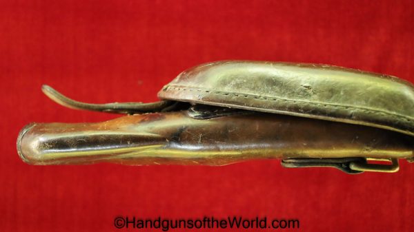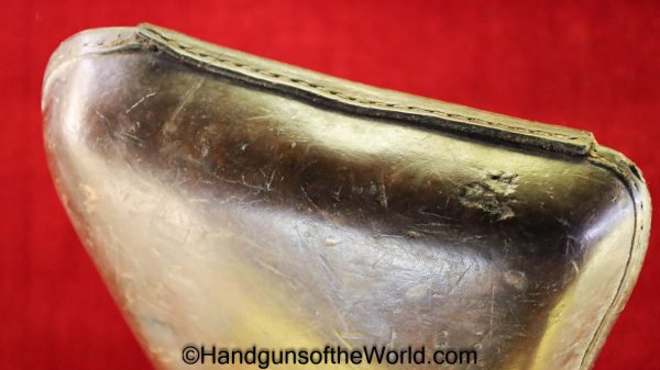 Original Japanese Nambu Type 14 Pistol Holster. Brown leather clam shell with brass fittings. There is an extra hole in the hold down tab. Overall VG.