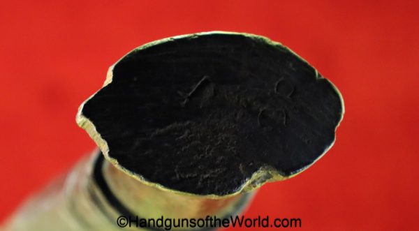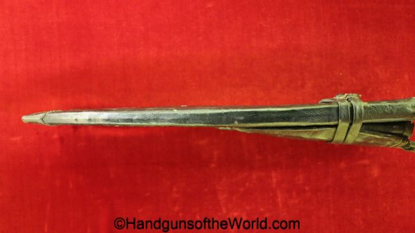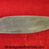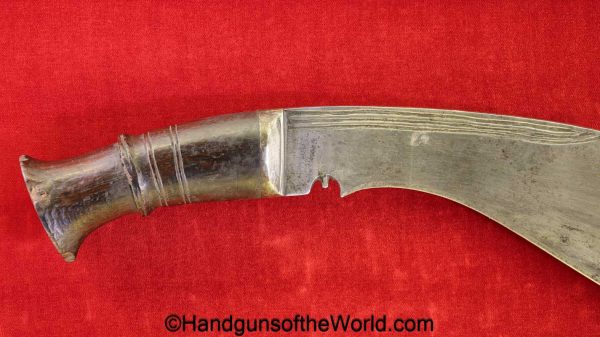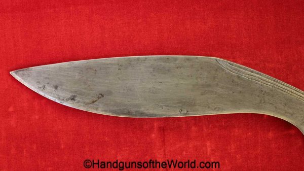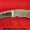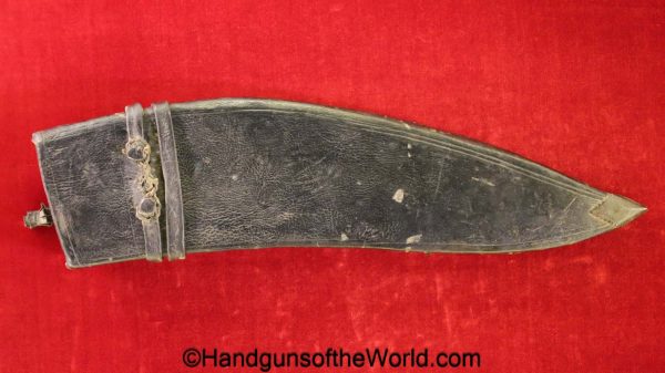 Original Nepalese Gurkha Kukri Knife. The curved blade measures about 13″ and is about 17″ overall. This is unmarked with a grooved wooden handle. This set includes a black leather covered wooden scabbard with 2 mini–Gurkha Kukri knives and a leather pouch on the side. Overall VG+.