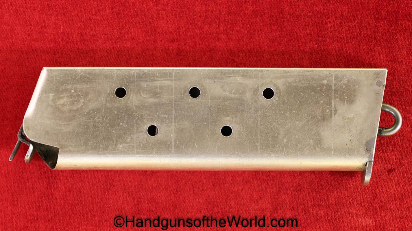Original Norwegian Kongsberg Colt 1914 .45acp Pistol Magazine. This has the lanyard loop on the base, with about 95% nickel remaining.