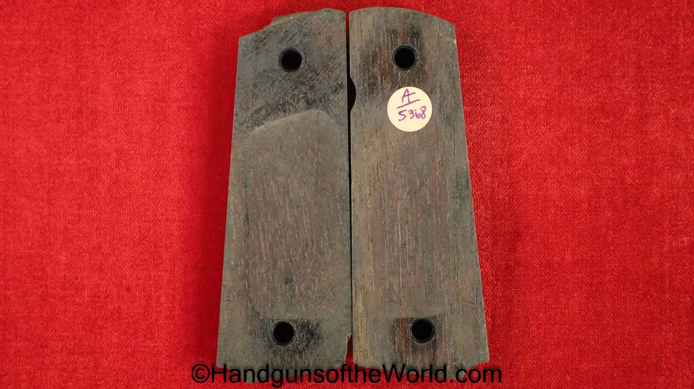 Original Colt 1911/Governent Model Pistol Grips. Checkered walnut with Diamond cut around the grip screws. A chip shows on the left panel. Overall VG.