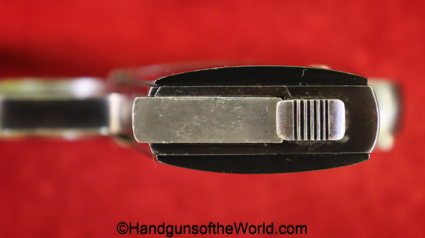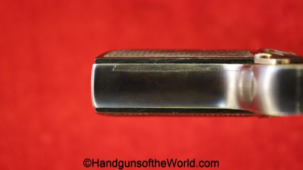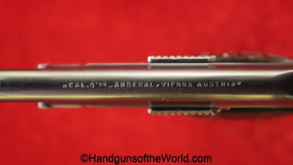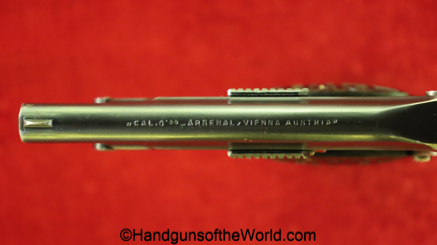 OWA 1922, 6.35mm. This late Model has the OWA logo black Bakelite grips. This is Austrian proof/dated 1924 and German Crown N proofed. The blue rates about 99% and the bore is excellent.