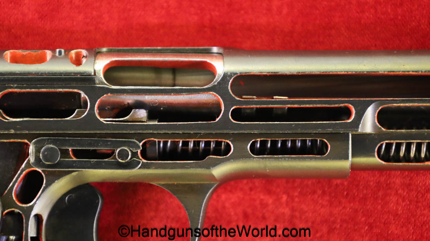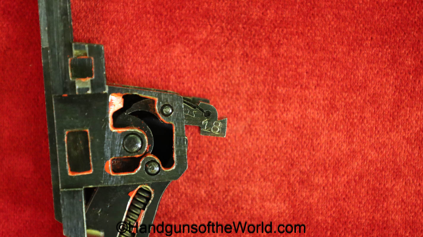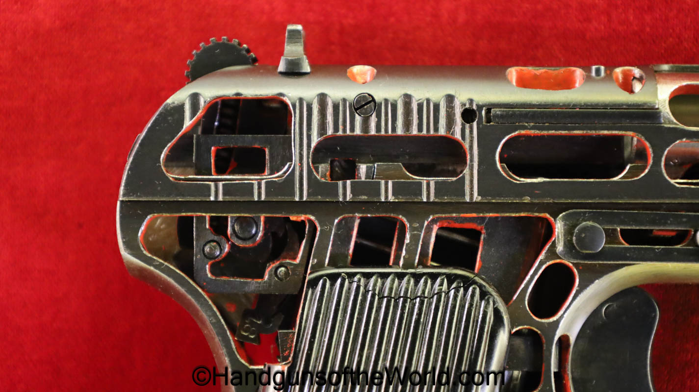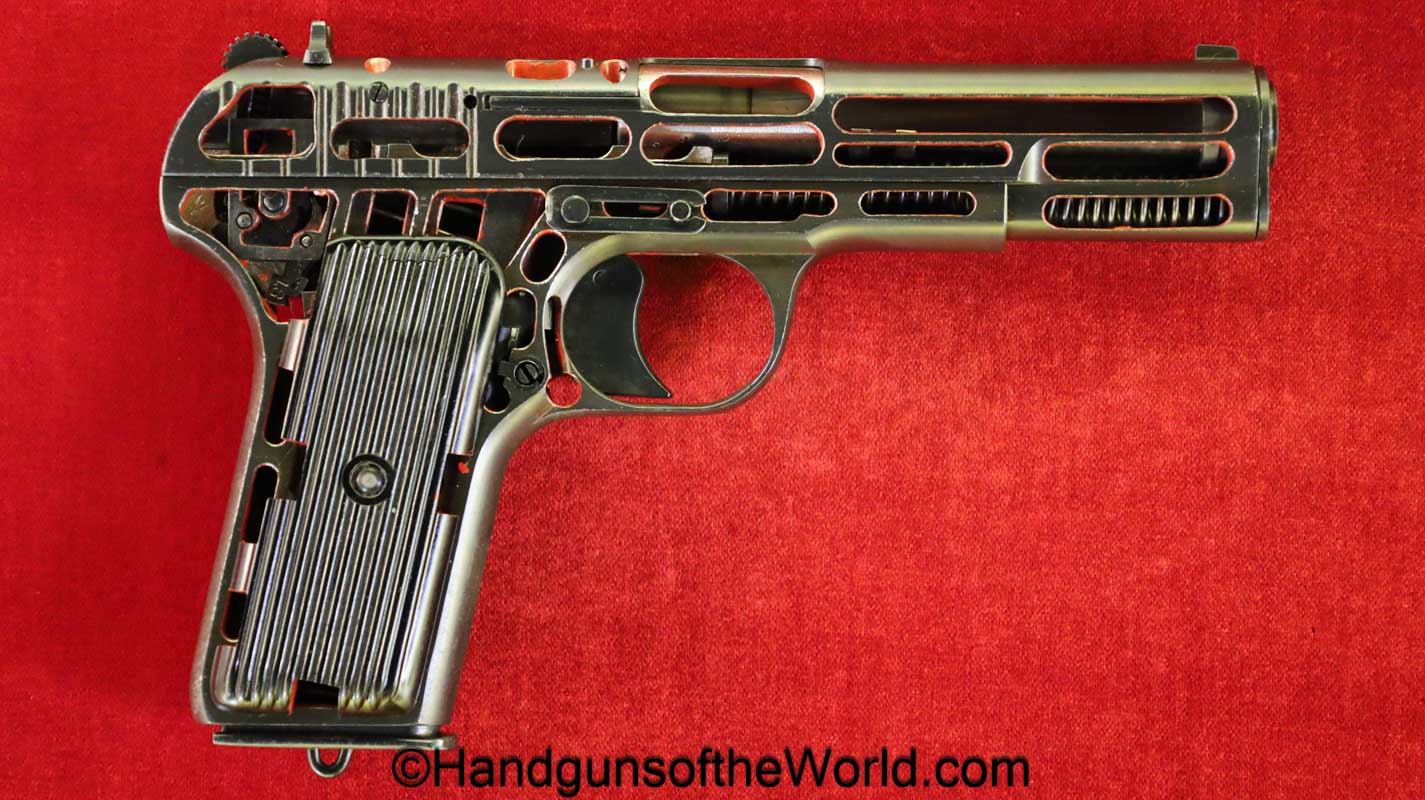 Polish WZ-33 Tokarev, 7.62mm. Dated 1953 this is an armorer’s cutaway with over 50, red highlighted cut outs. This has lined, no logo black Bakelite grips-the right shows a crack. This is mostly matching with a tightly fitting magazine.