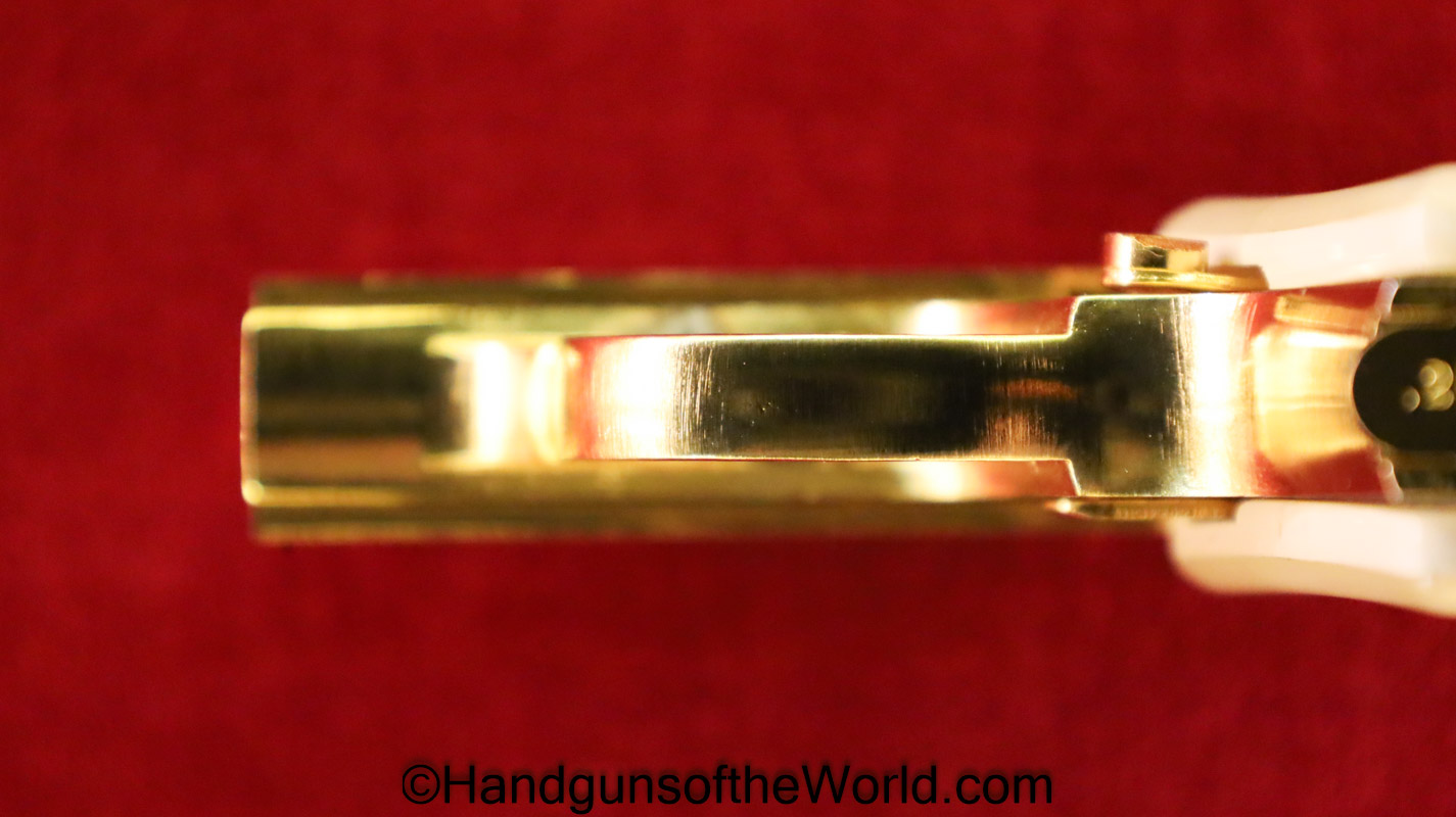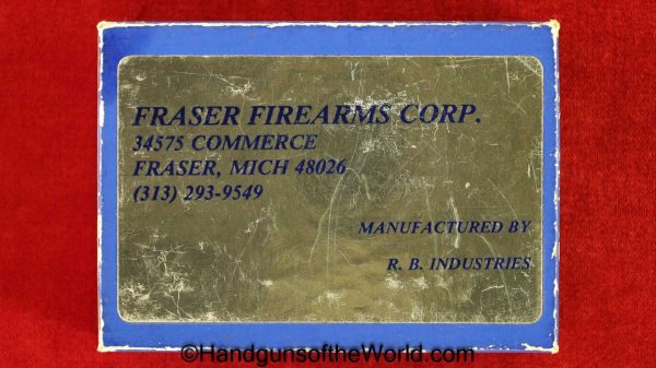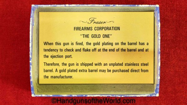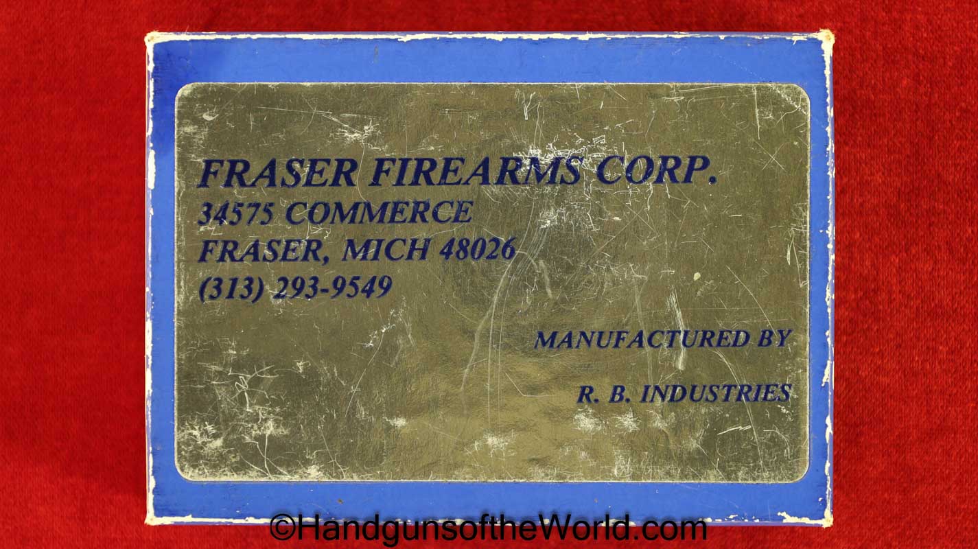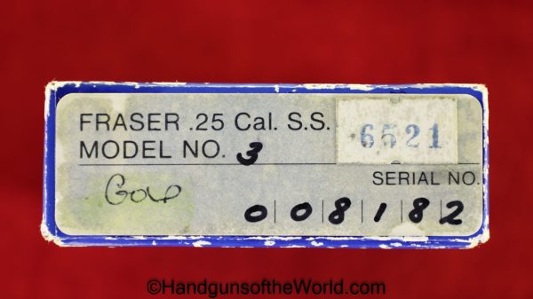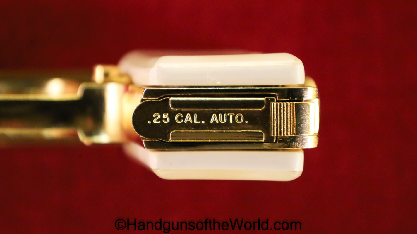 R.B.Industries Frasier Model 3, .25 caliber. This is gold plated with white pearlite grips. This is like new, unfired in the original box with a sales receipt.