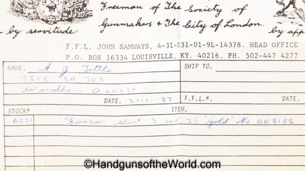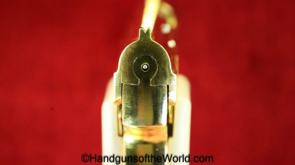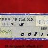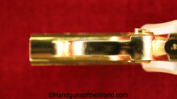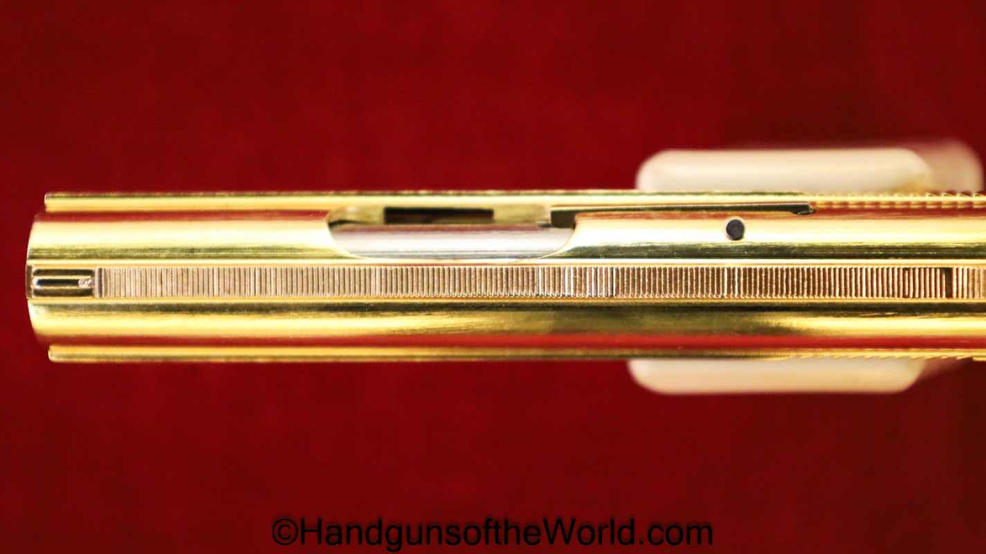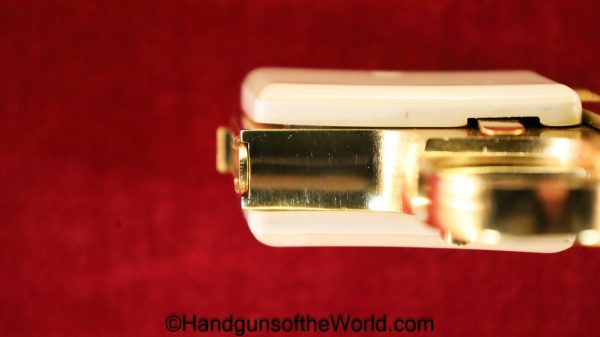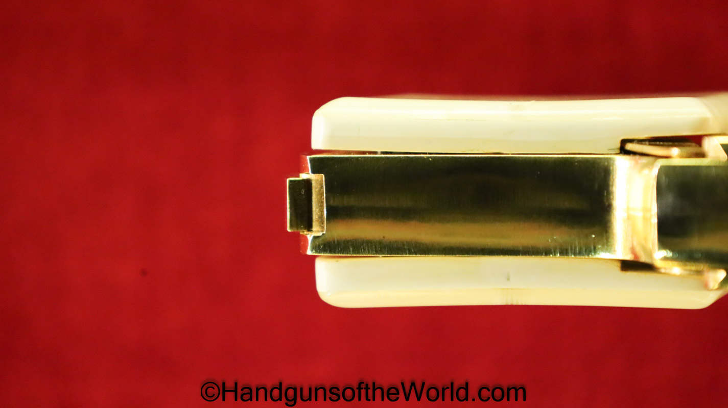 R.B.Industries Frasier Model 3, .25 caliber. This is gold plated with white pearlite grips. This is like new, unfired in the original box with a sales receipt.