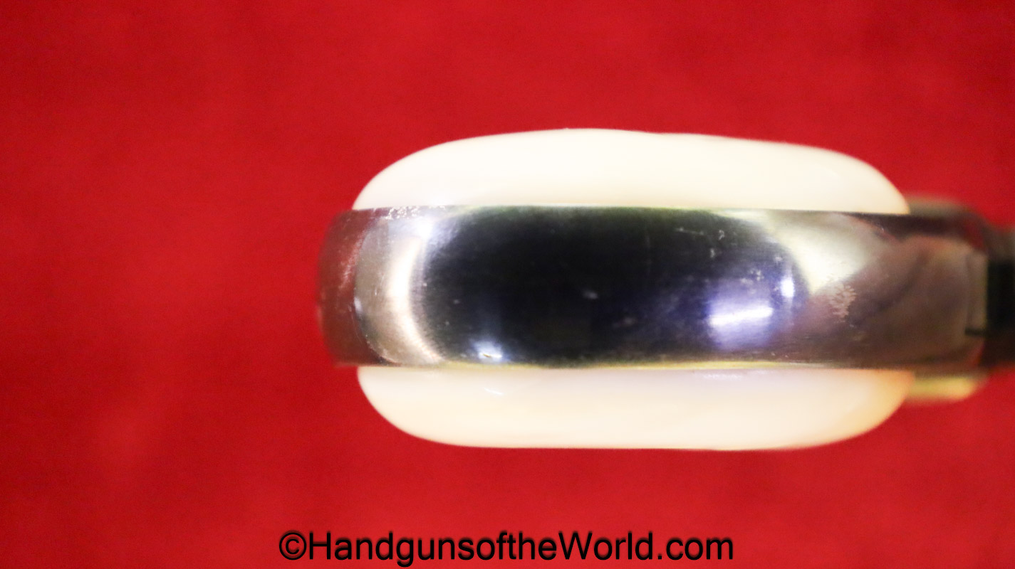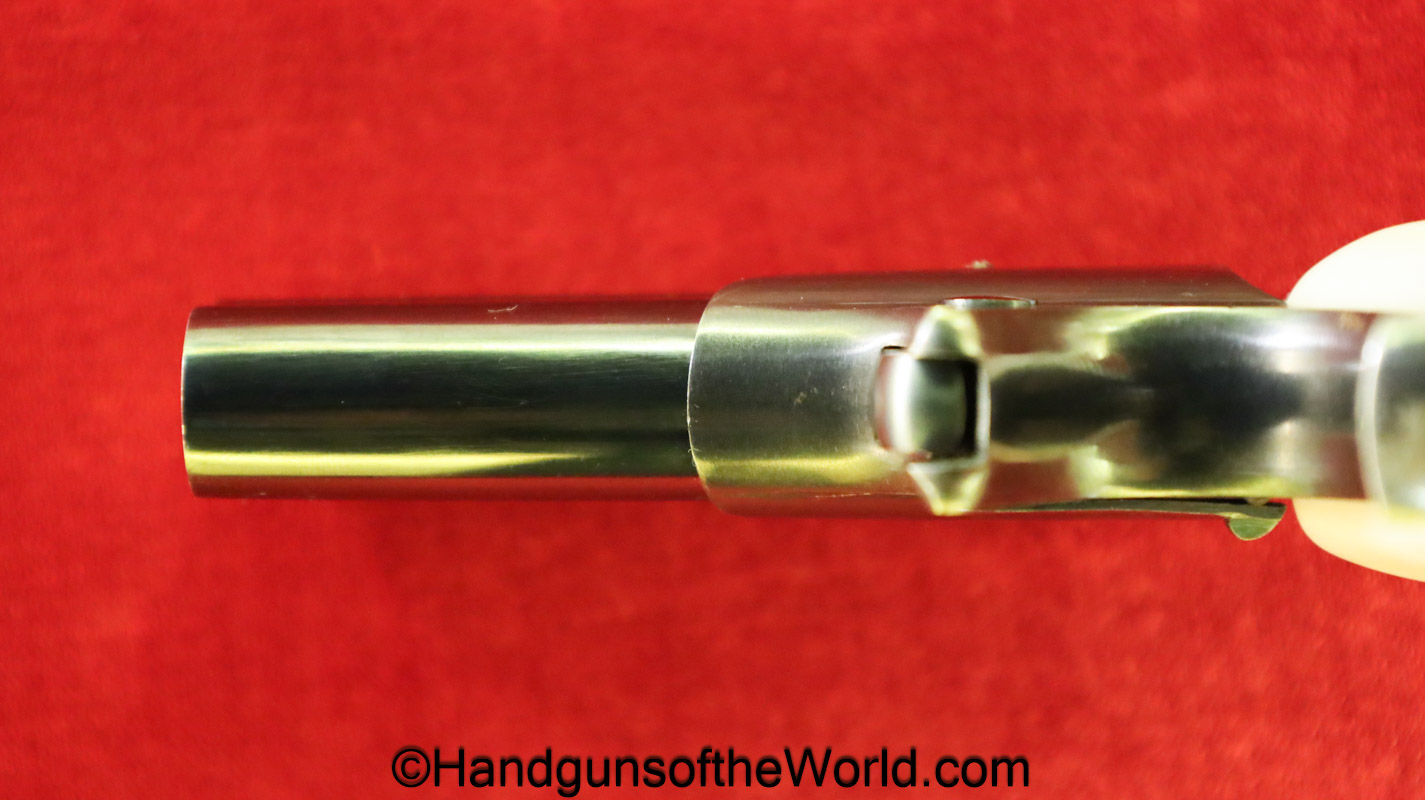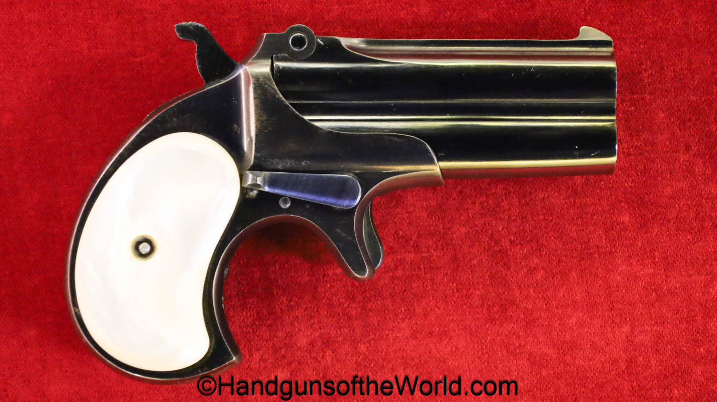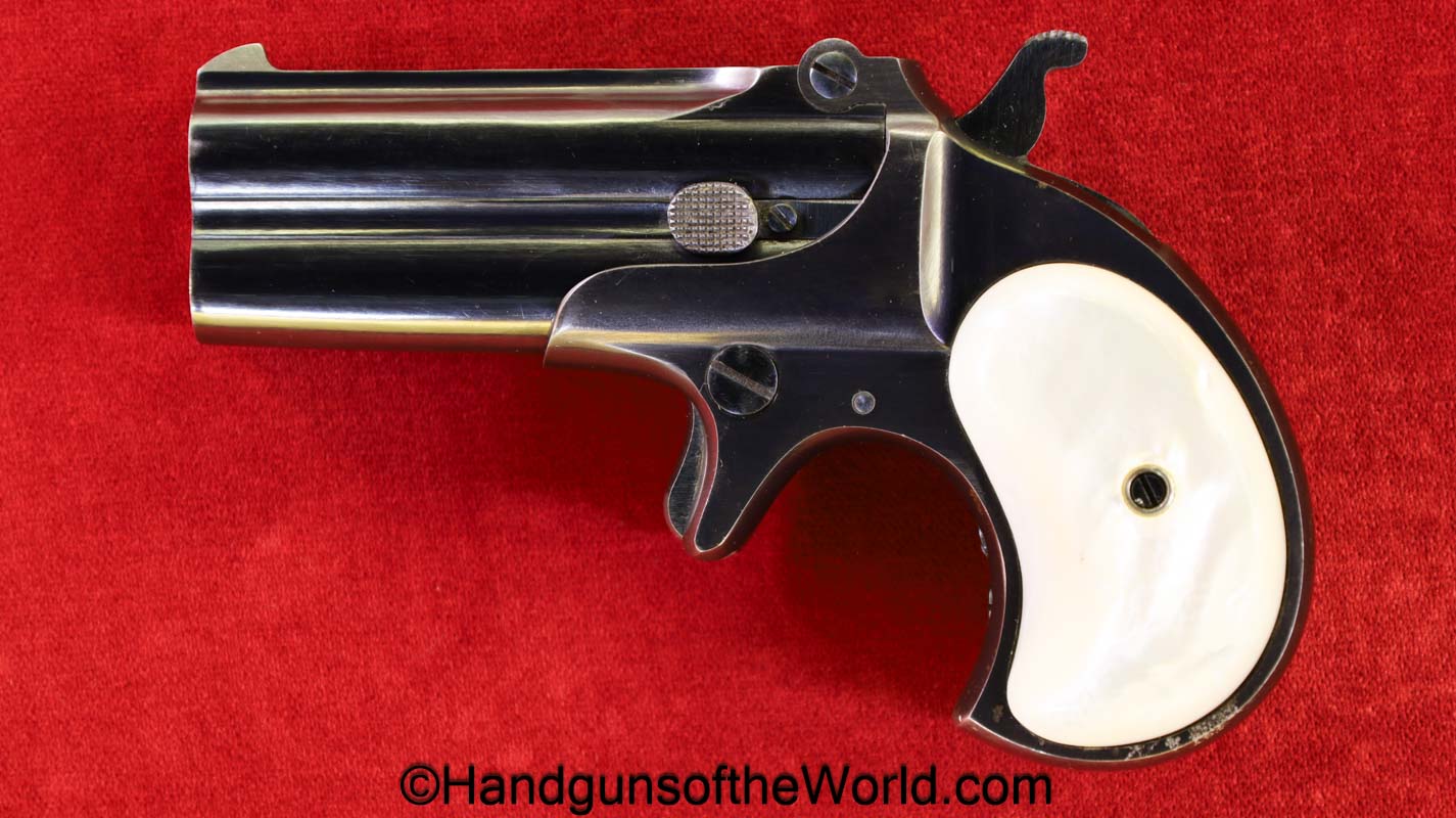 Remington Double Derringer, .41 caliber. This is marked Remington Arms UMC Co. Ilion NY on the top of the barrels. This has nice smooth custom made pearl grips. The hinge is as solid as it was when made new. This retains about 97% high Polish blue and the bores are excellent-appears unfired. This comes with a well-made custom, olive green, felt lined walnut case with Key.